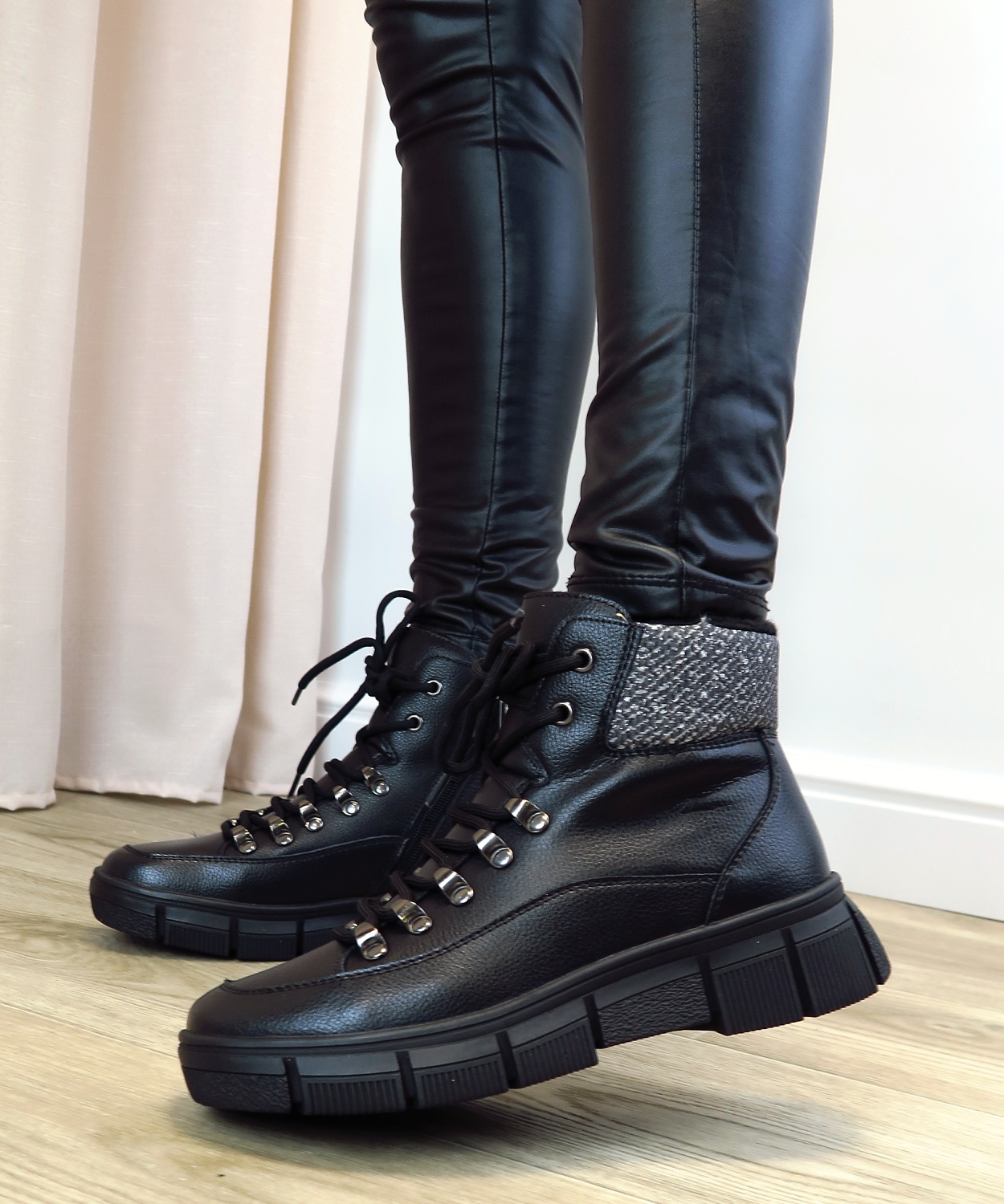 Dámske trendové topánka značky CAMBELL. Model v čiernej farbe. Zvršok vyrobený z prírodnej kože. Zadná časť doplnená o štýlový textilný panel, ktorý dodáva topánkam originálny vzhľad a zároveň príjemne zmäkčuje oblasť okolo nohy. Vyššia podrážka poskytuje stabilitu a istotu aj v zimnom počasí. Zapínanie – šnurovanie, ale aj bočný zips.