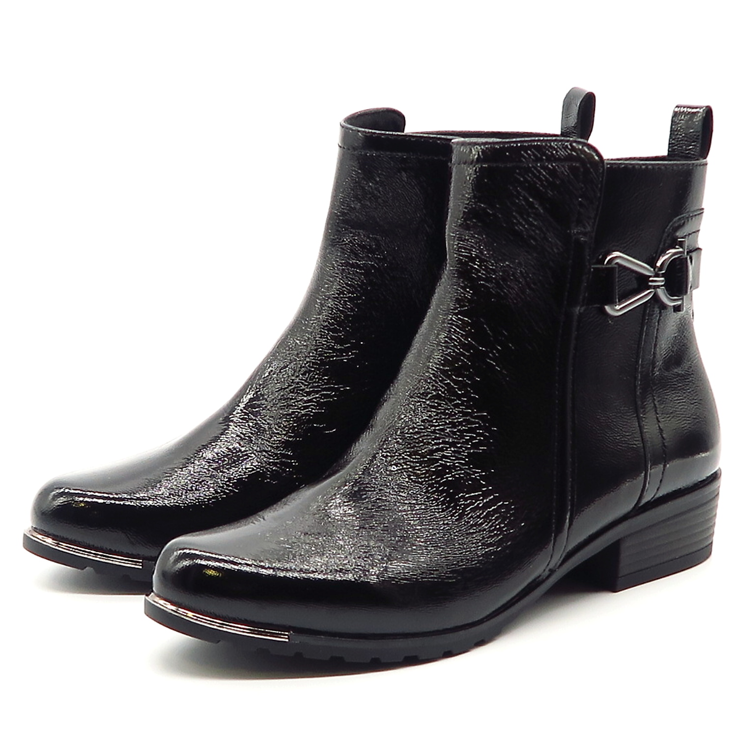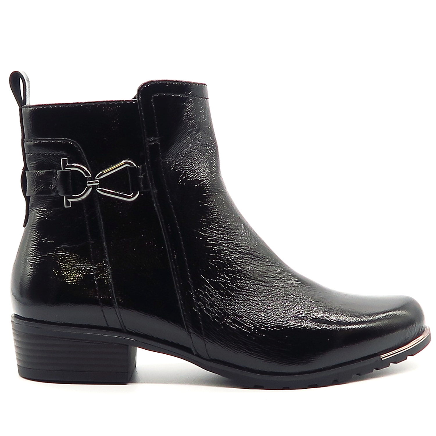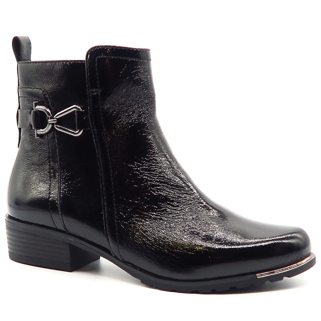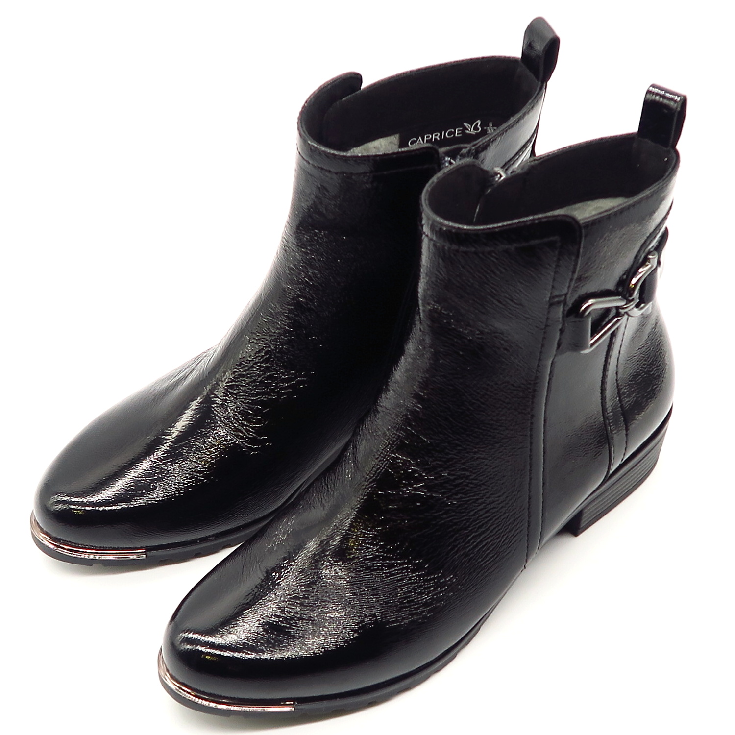 Dámske členkové topánky od nemeckej značky CAPRICE. Model v čiernej farbe. Zvršok vyrobený z prírodnej kože. Ich lakovaný vzhľad dodáva celému modelu eleganciu. Pekným doplnkom je kovová aplikácia na bočnej strane. Komfortný krok Vám zabezpečí mäkká stielka vo vnútri a nízky podpätok. Zateplené sú jemnou kožušinkou, ktorá zahreje v chladnom počasí. Trendové topánky, ktoré budú vždy IN.