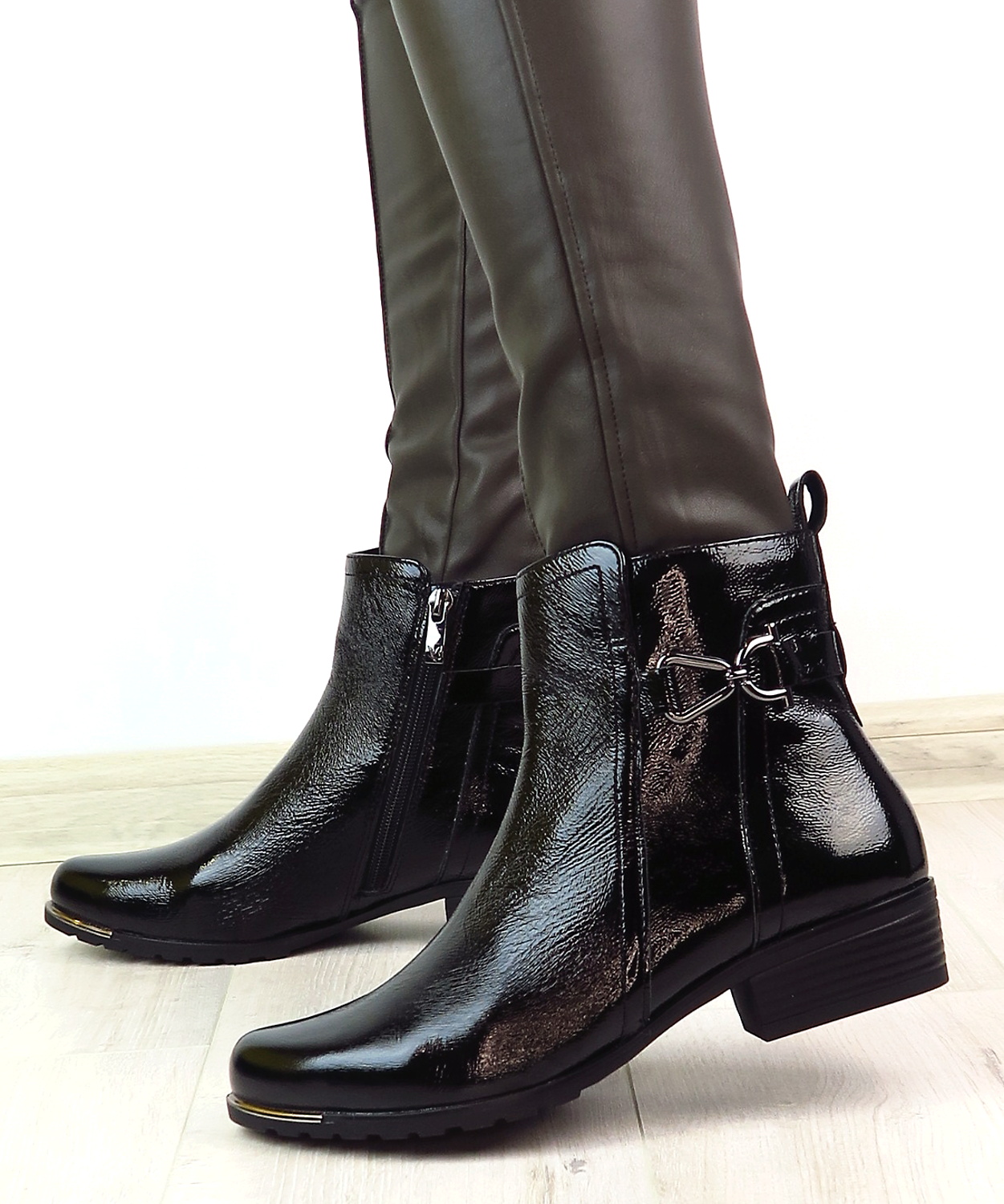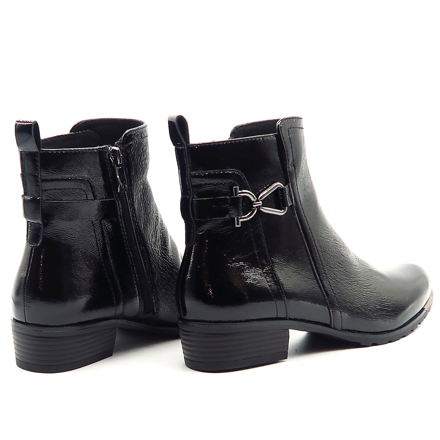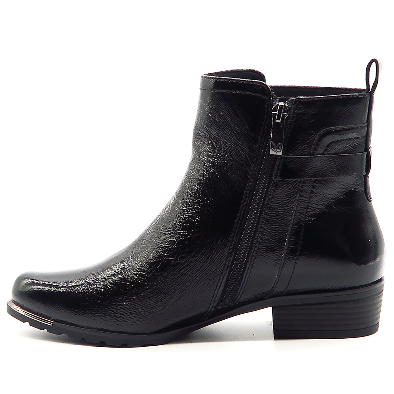 Dámske členkové topánky od nemeckej značky CAPRICE. Model v čiernej farbe. Zvršok vyrobený z prírodnej kože. Ich lakovaný vzhľad dodáva celému modelu eleganciu. Pekným doplnkom je kovová aplikácia na bočnej strane. Komfortný krok Vám zabezpečí mäkká stielka vo vnútri a nízky podpätok. Zateplené sú jemnou kožušinkou, ktorá zahreje v chladnom počasí. Trendové topánky, ktoré budú vždy IN.