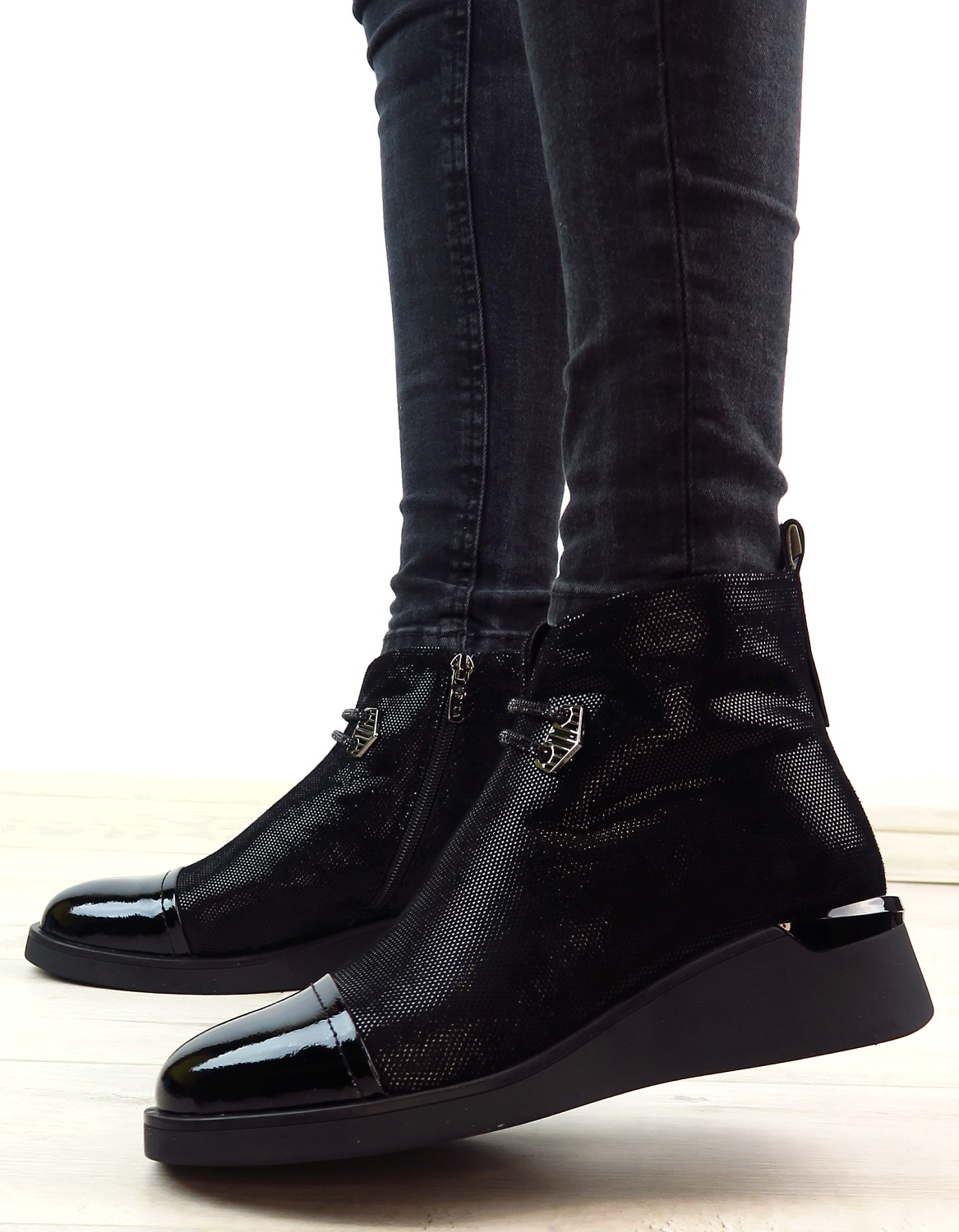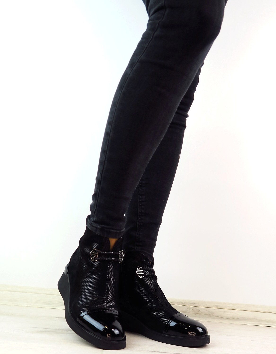 Dámske členkové topánky od kvalitnej značky EPICA. Elegantný model čiernej farbe. Kombinácia čierneho lesklého povrchu a lakovanej špičky pôsobí štýlovo a moderne. Na boku sa nachádza ozdobný kovový detail, ktorý dodáva topánke luxusný vzhľad. Zvršok tvorí prírodná koža. Stabilná klinová podošva zabezpečí komfort pri nosení počas celého dňa. Vhodné na chladnejšie dni. Zateplené jemnou kožušinou.