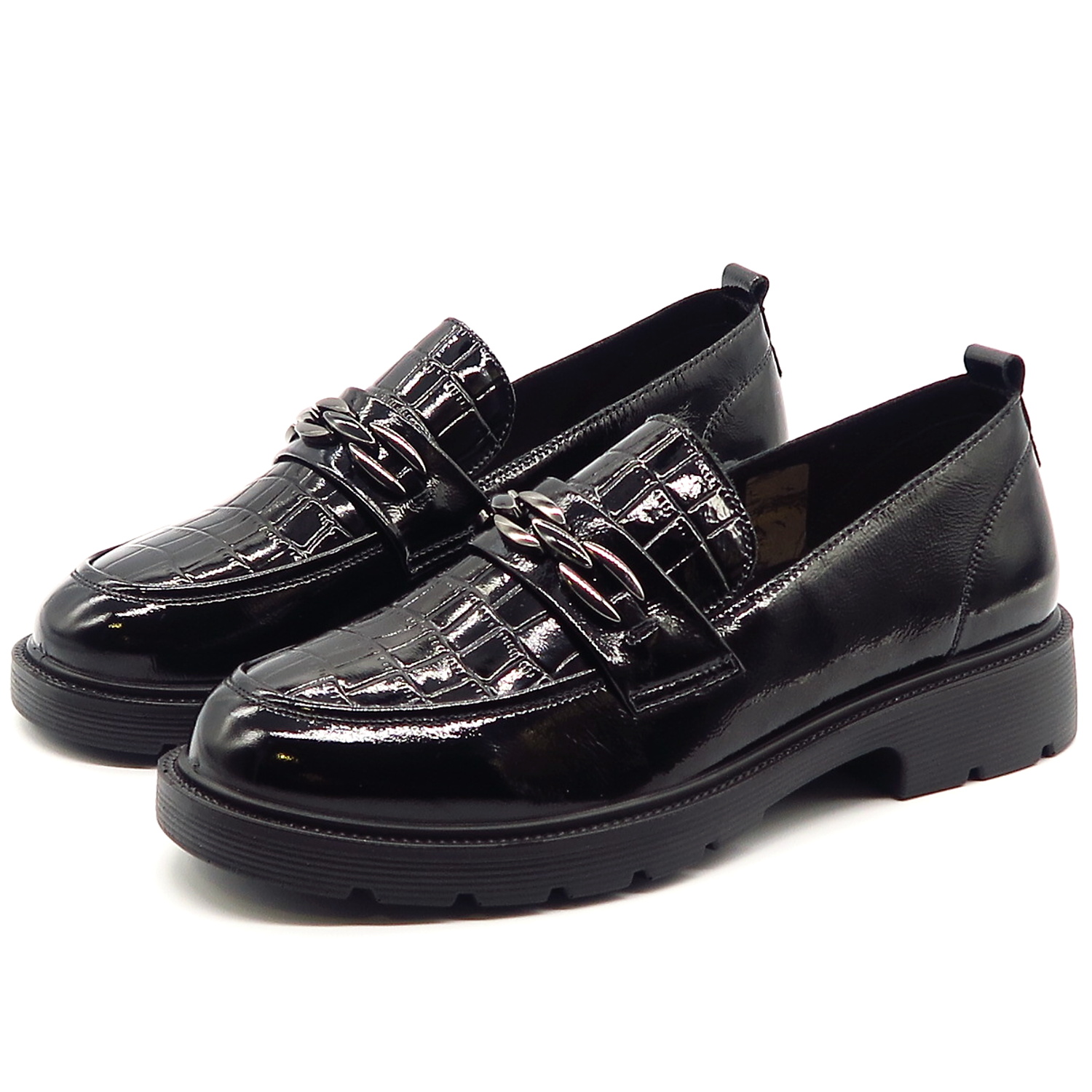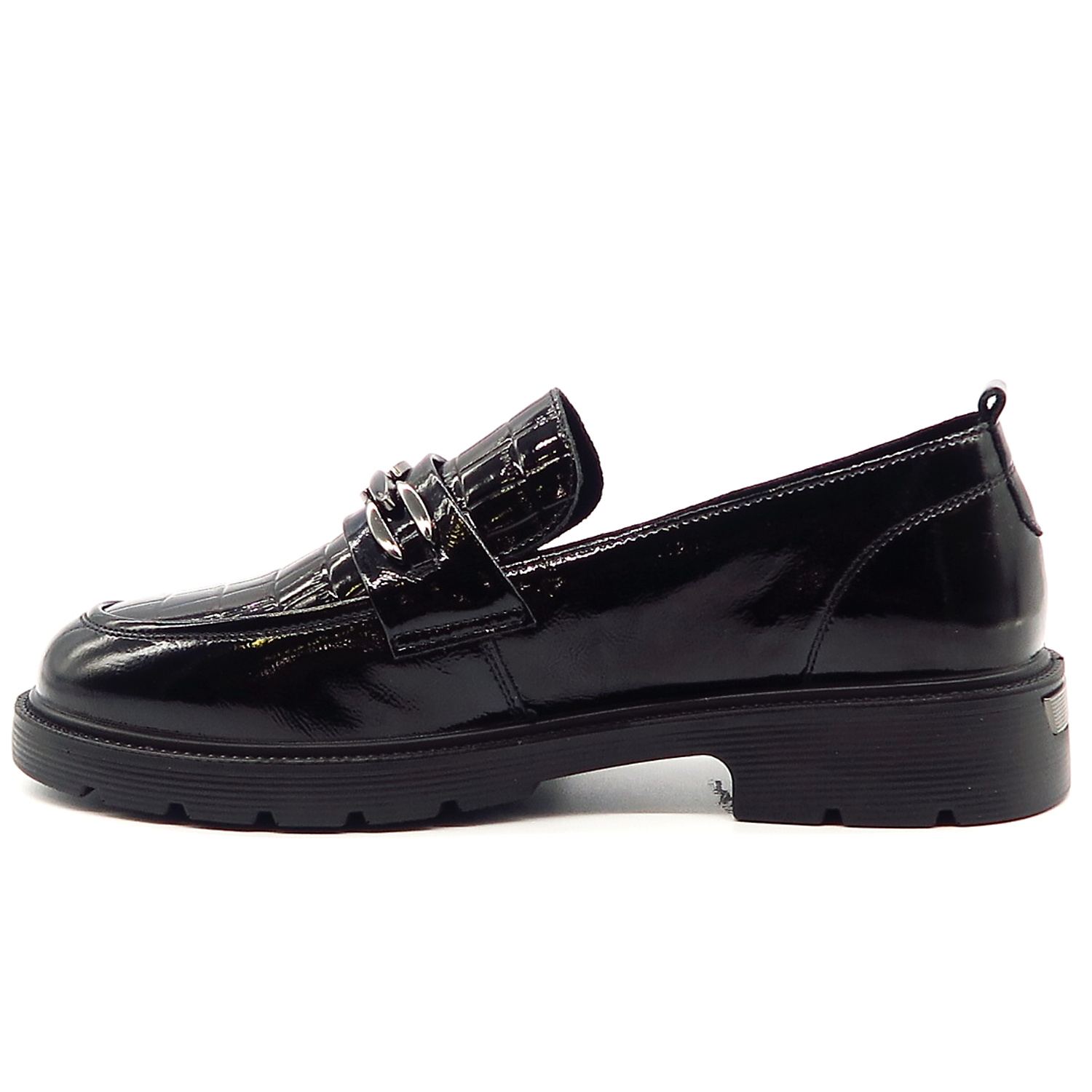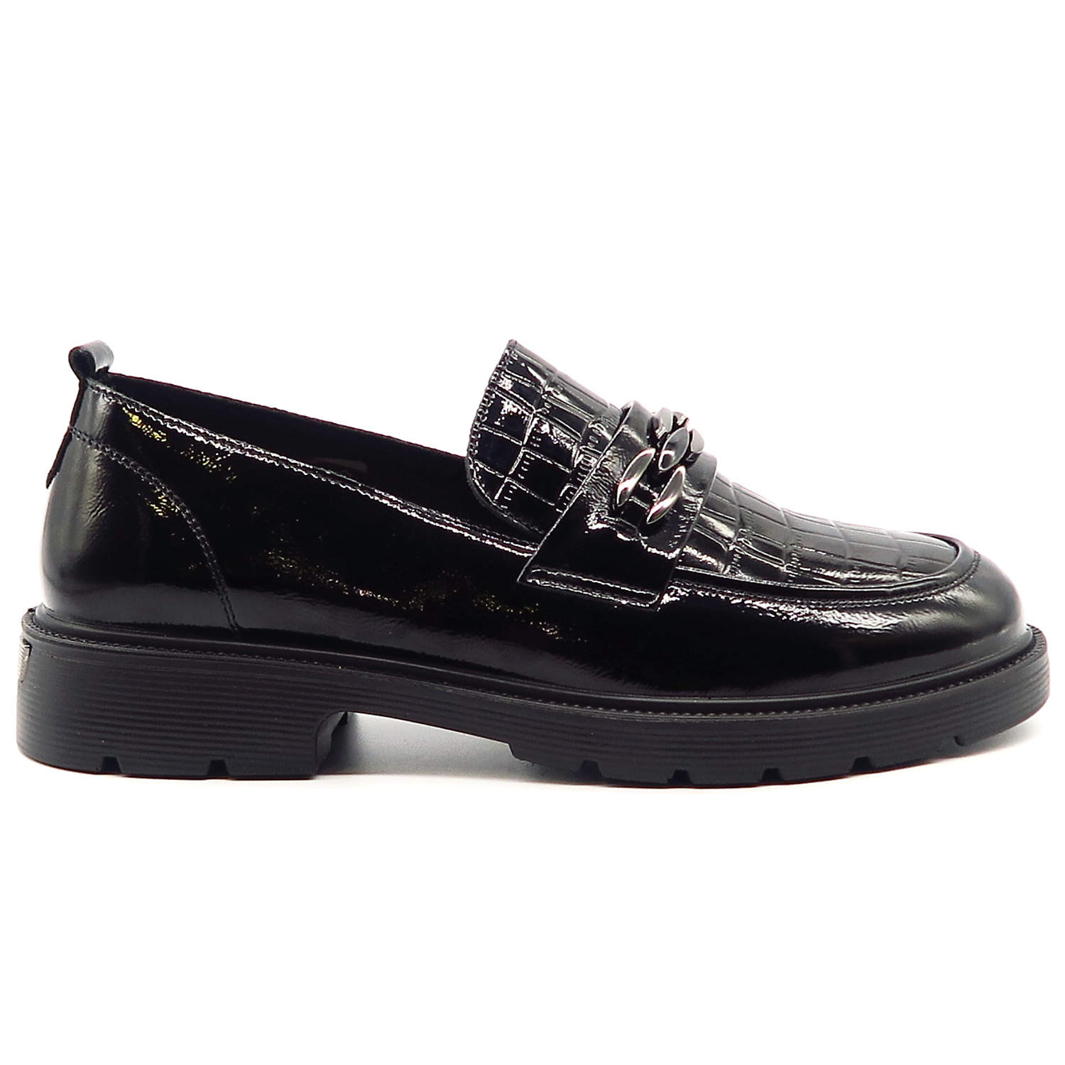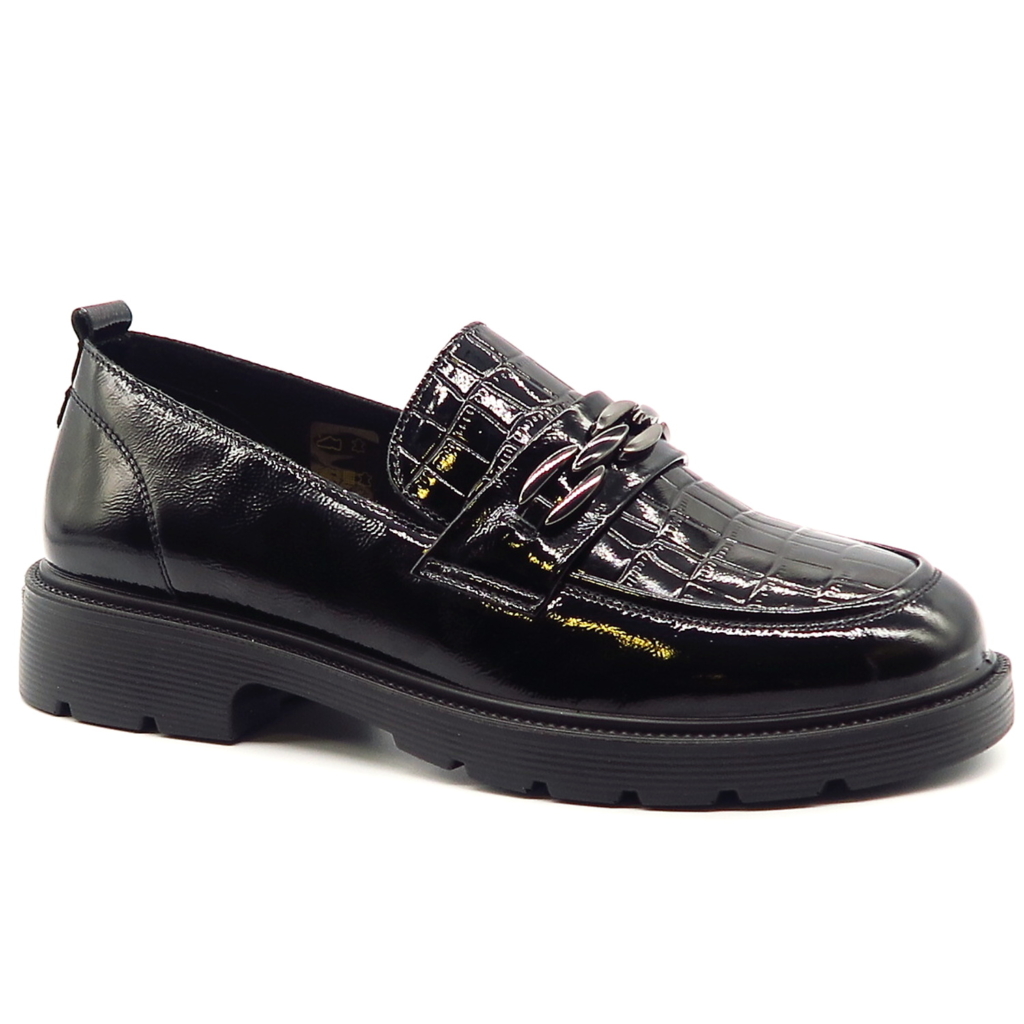 Dámske mokasíny od kvalitnej značky PASS. Model v čiernej farbe. Zvršok vyrobený z prírodnej kože. Ich lakovaný vzhľad s croco potlačou dodáva celému modelu eleganciu. Pekným doplnkom je retiazková aplikácia na narte. Výhodou tohto modelu je ich komfort, a vďaka mäkkej kože pekne sadnú na chodidlo. Topánky, ktoré určite nesklamú.