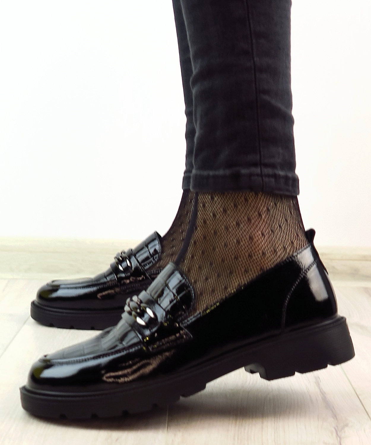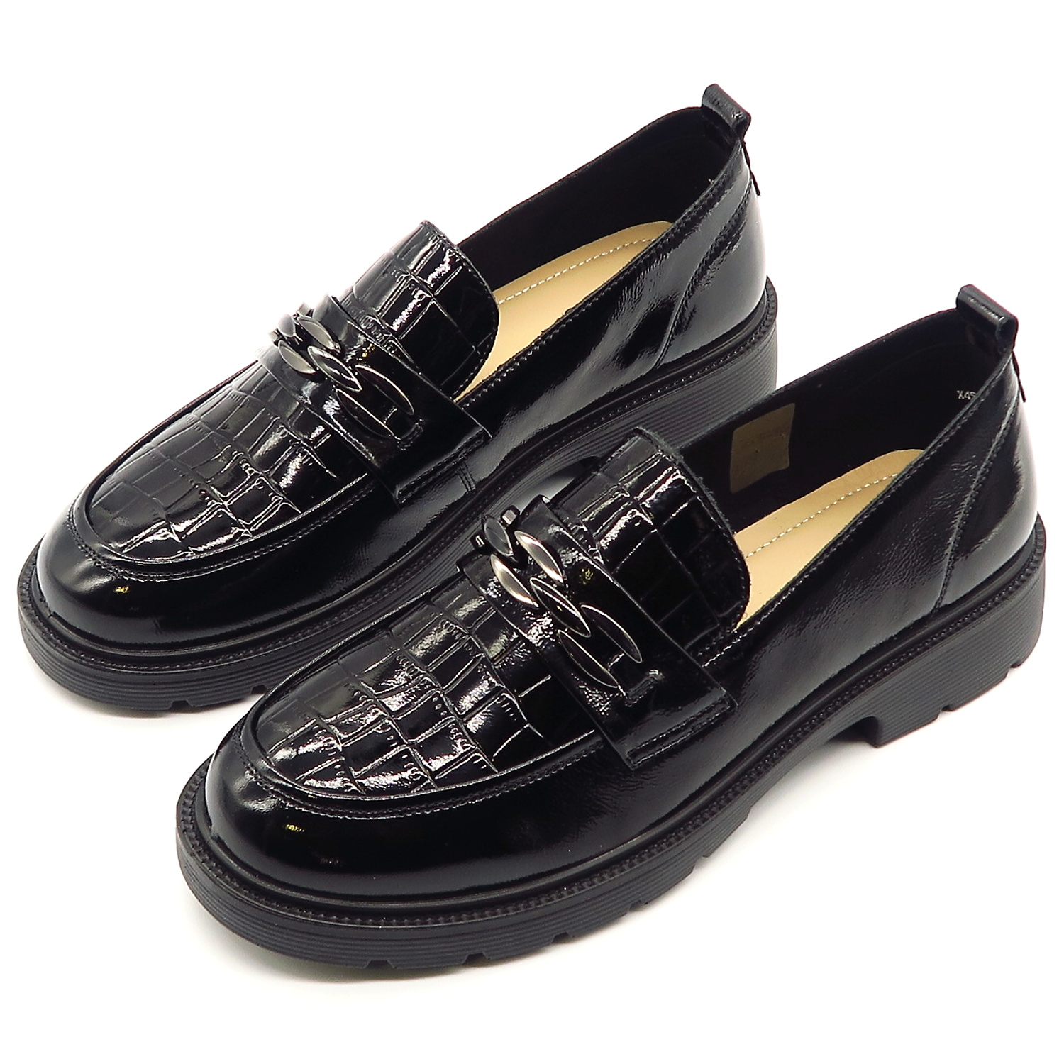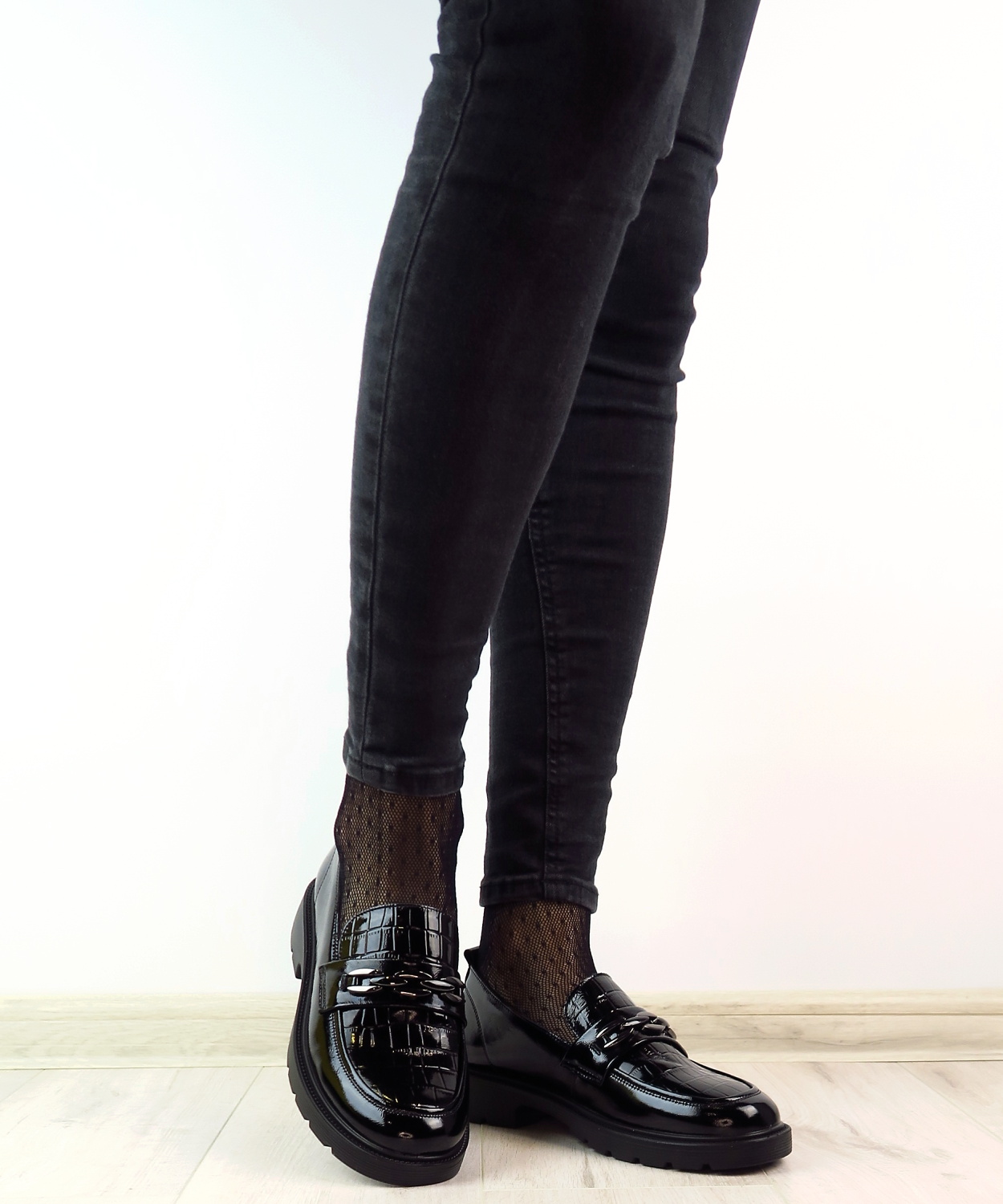 Dámske mokasíny od kvalitnej značky PASS. Model v čiernej farbe. Zvršok vyrobený z prírodnej kože. Ich lakovaný vzhľad s croco potlačou dodáva celému modelu eleganciu. Pekným doplnkom je retiazková aplikácia na narte. Výhodou tohto modelu je ich komfort, a vďaka mäkkej kože pekne sadnú na chodidlo. Topánky, ktoré určite nesklamú.