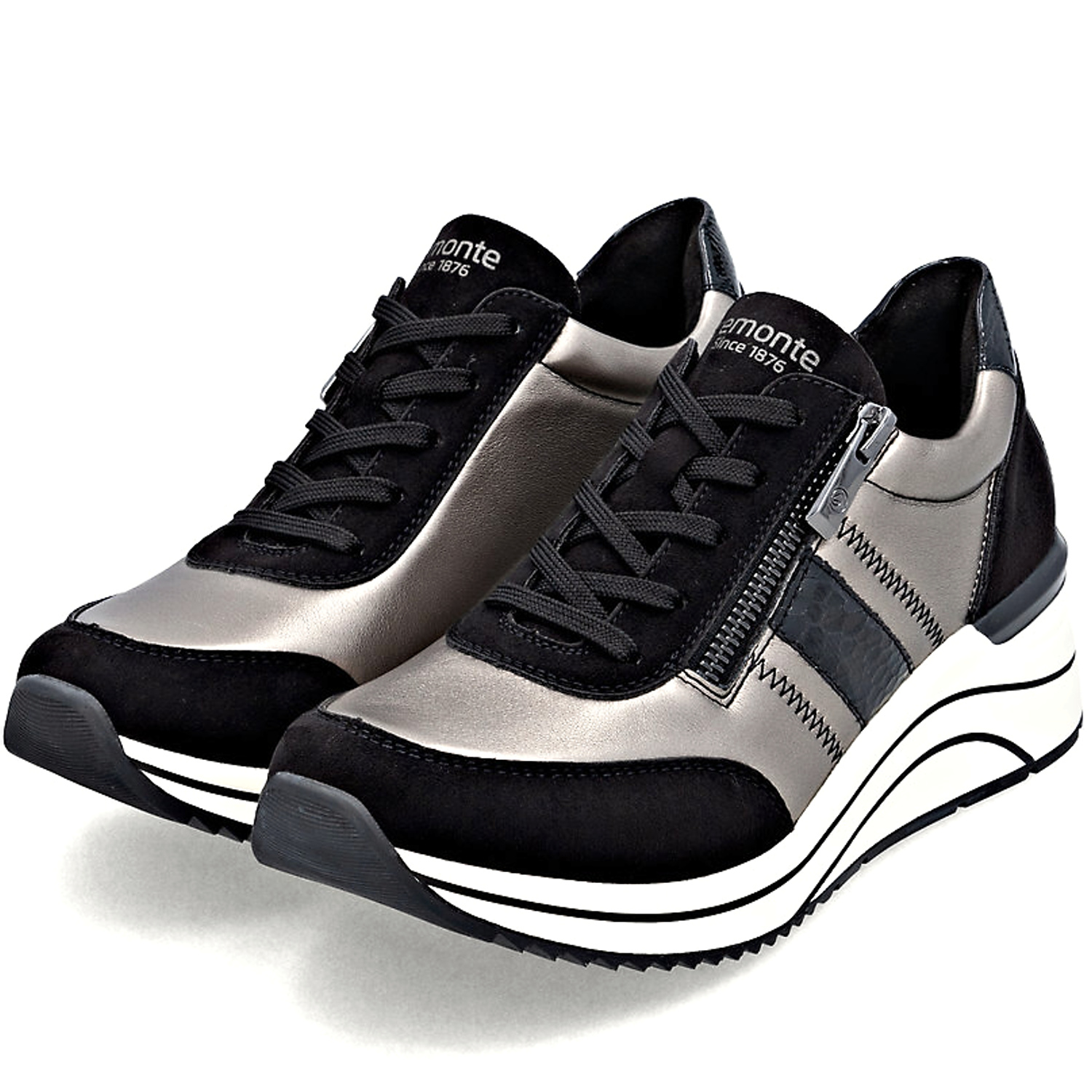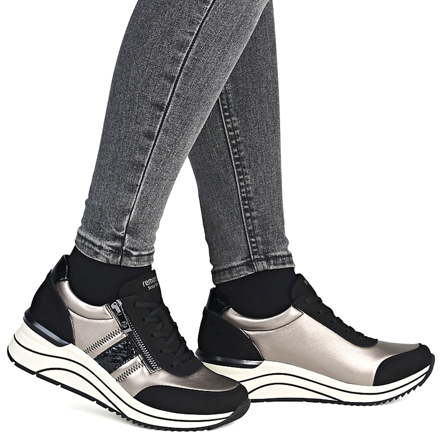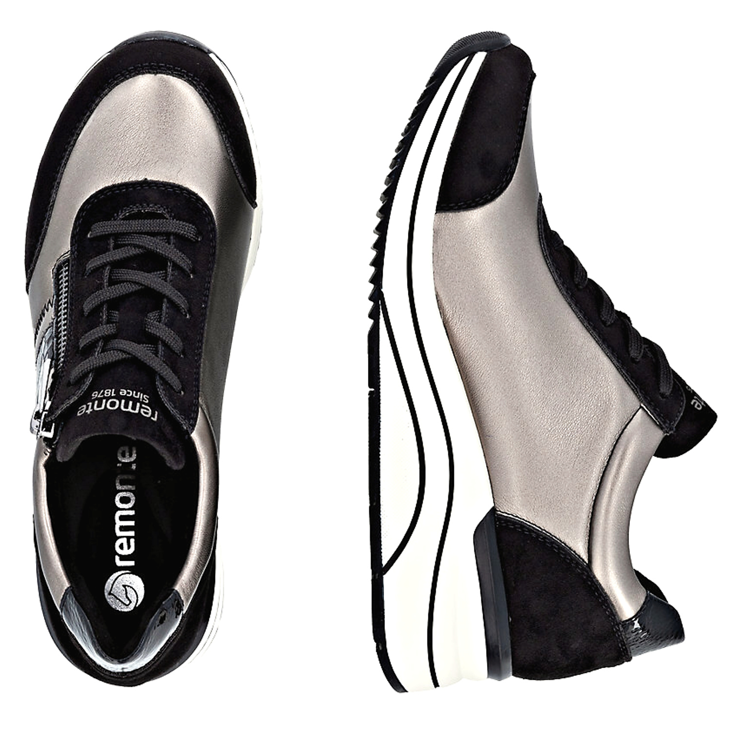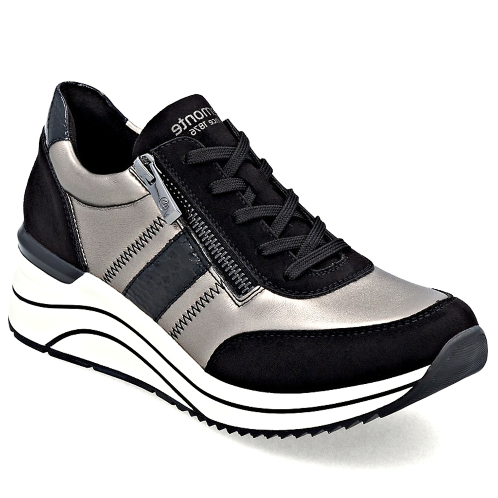 Dámske trendové sneakersy od nemeckej značky REMONTE. Model v čiernej farbe v kombinácii s metalickým odleskom. Zvršok tvorí ekologická koža a textil. Veľmi ľahké a komfortné topánky s pamäťovou stielkou. Zapínanie šnurovanie, ale aj bočný zips. Vyššia podrážka doplnená o čierne pásiky robí tento model štýlovým.