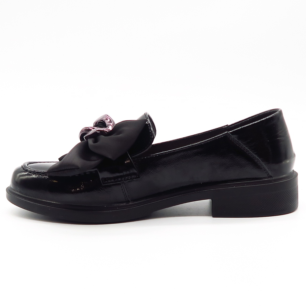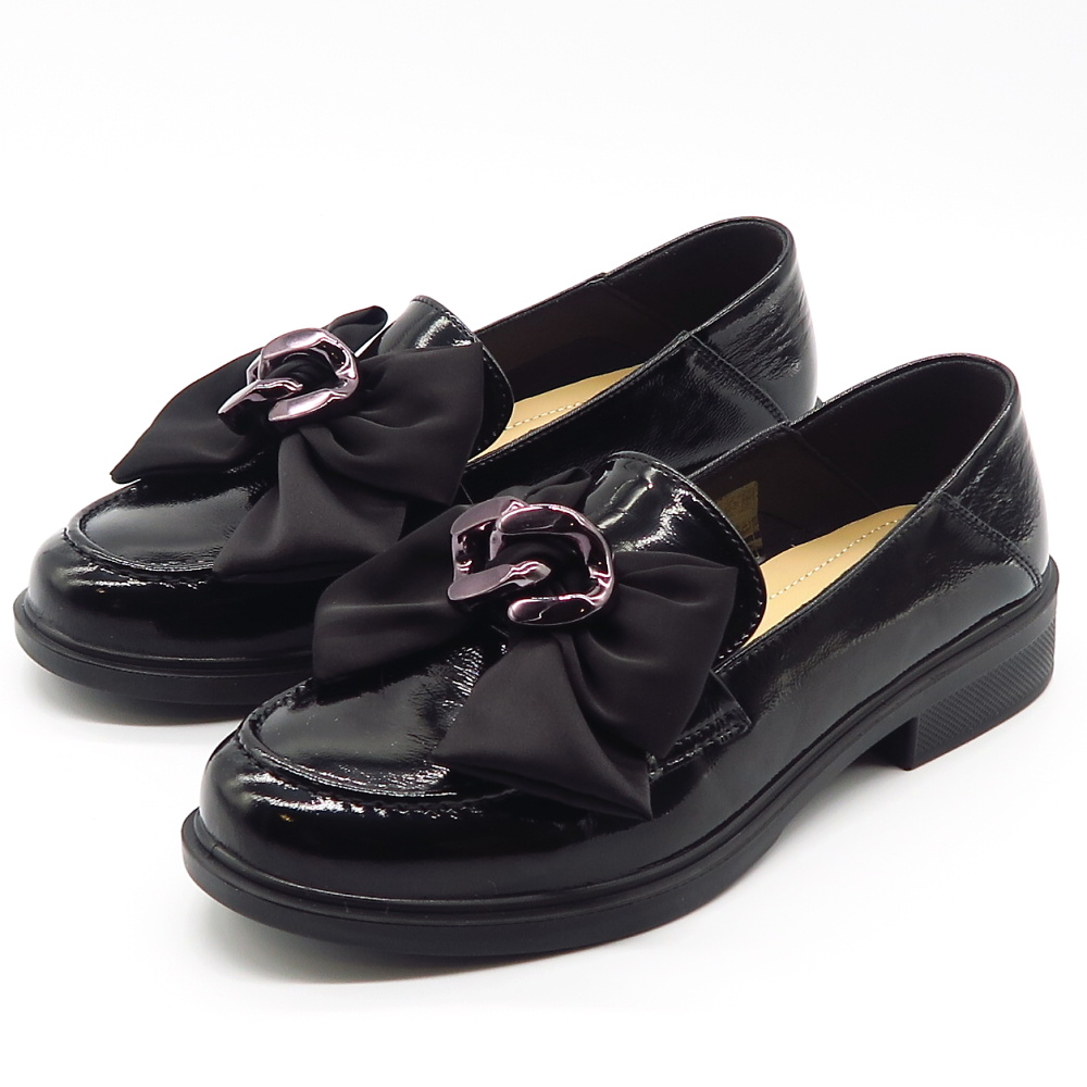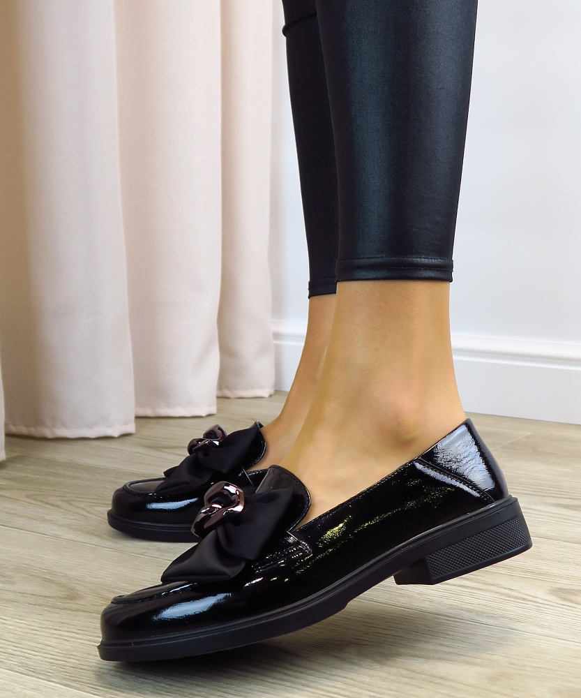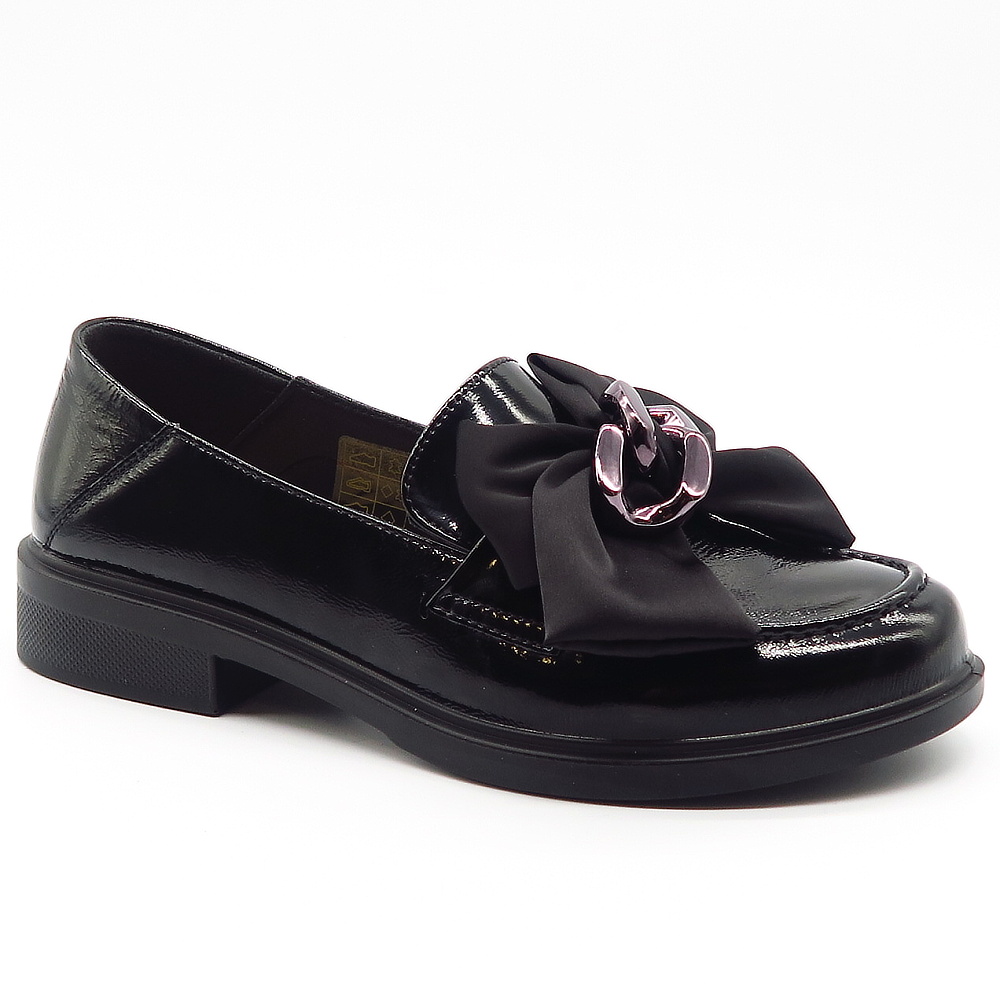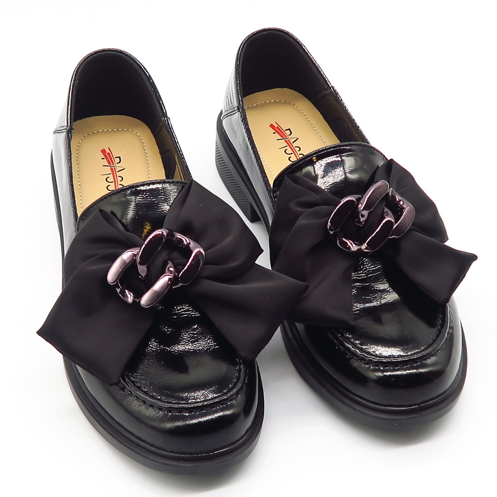 Dámske mokasíny od kvalitnej značky PASS. Model v lakovanej čiernej farbe. Zvršok vyrobený z prírodnej kože. Prednú časť zdobí výrazná mašľa z jemnej látky s modernou kovovou prackou, ktorá topánkam dodáva štýlový a ženský charakter. Výhodou tohto modelu je ich komfort, a vďaka mäkkej kože pekne sadnú na chodidlo. Topánky, ktoré určite nesklamú.
