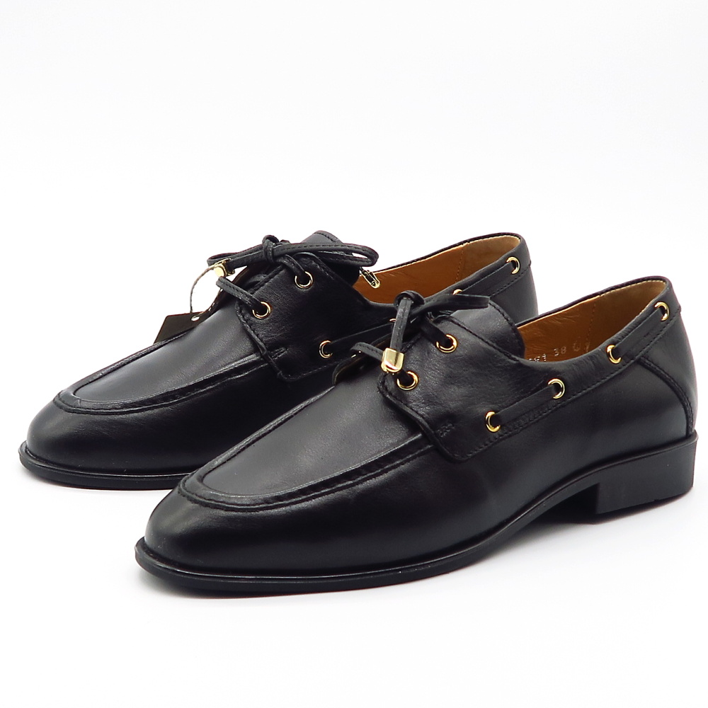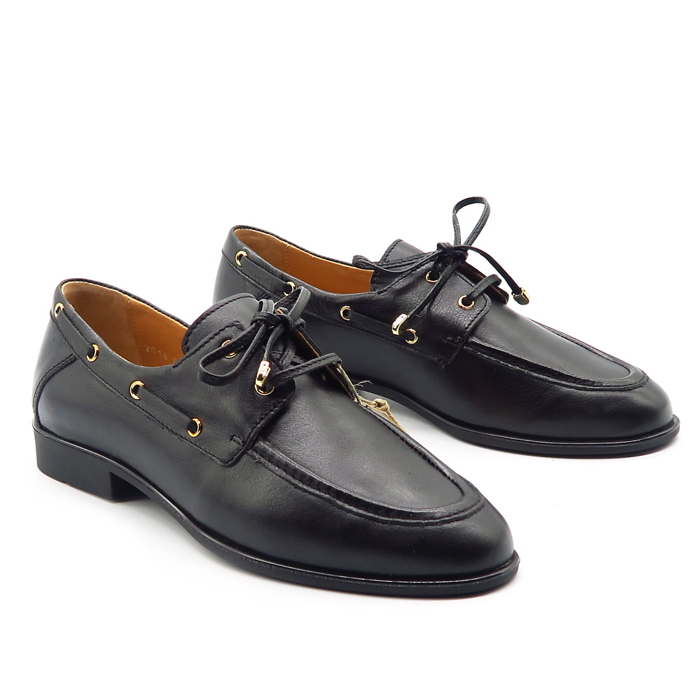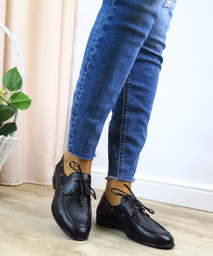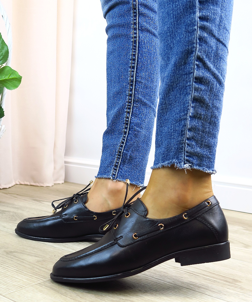 Elegantné dámske mokasíny značky SIMEN sú ideálnou voľbou pre ženy, ktoré hľadajú spojenie štýlu, pohodlia a kvalitného spracovania. Model je vyrobený z kvalitnej kože, ktorá je príjemná na nosenie, prispôsobí sa chodidlu a zabezpečuje komfort počas celého dňa. Klasický čierny dizajn dopĺňajú jemné zlaté detaily na šnurovaní a po bokoch topánky, ktoré dodávajú mokasínam elegantný a moderný vzhľad. Dekoratívne šnurovanie zároveň umožňuje lepšie prispôsobenie na nohe.