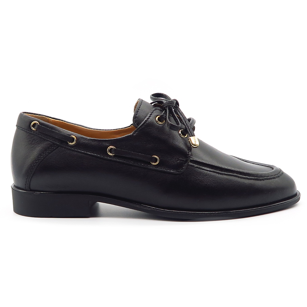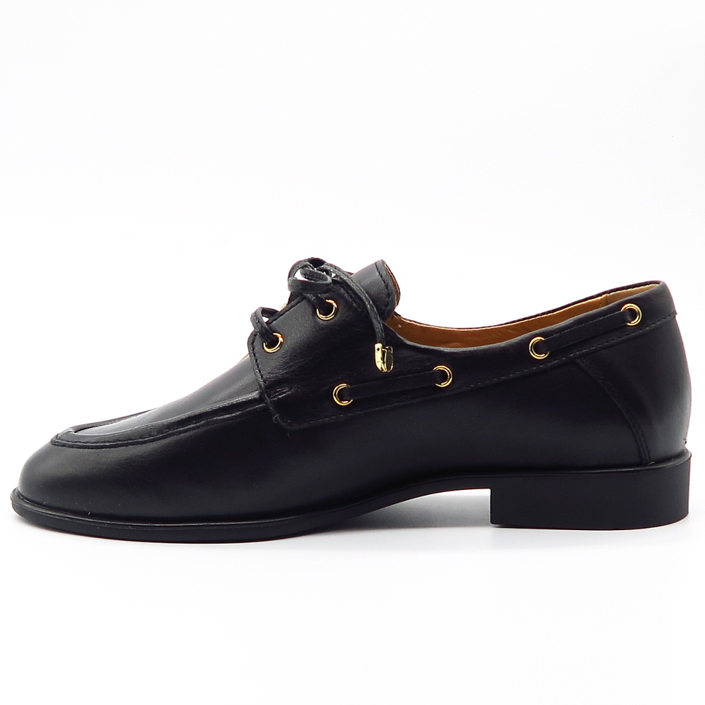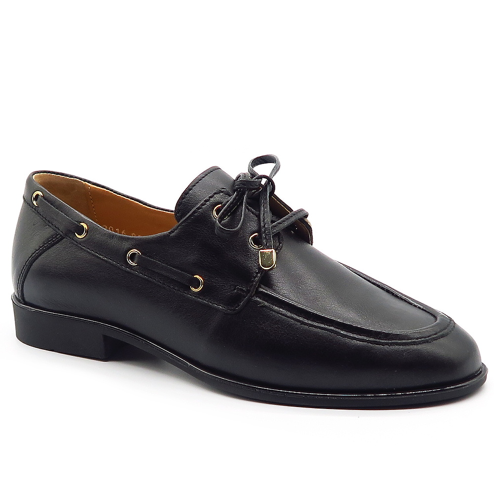 Elegantné dámske mokasíny značky SIMEN sú ideálnou voľbou pre ženy, ktoré hľadajú spojenie štýlu, pohodlia a kvalitného spracovania. Model je vyrobený z kvalitnej kože, ktorá je príjemná na nosenie, prispôsobí sa chodidlu a zabezpečuje komfort počas celého dňa. Klasický čierny dizajn dopĺňajú jemné zlaté detaily na šnurovaní a po bokoch topánky, ktoré dodávajú mokasínam elegantný a moderný vzhľad. Dekoratívne šnurovanie zároveň umožňuje lepšie prispôsobenie na nohe.