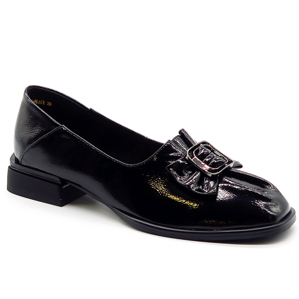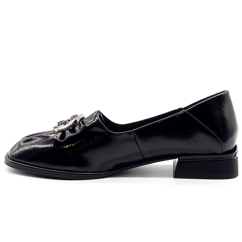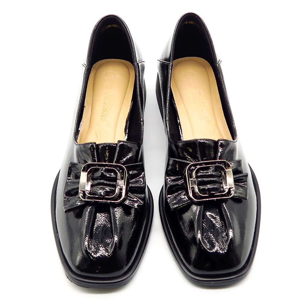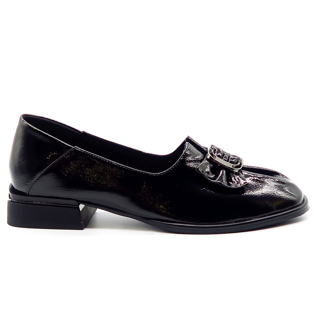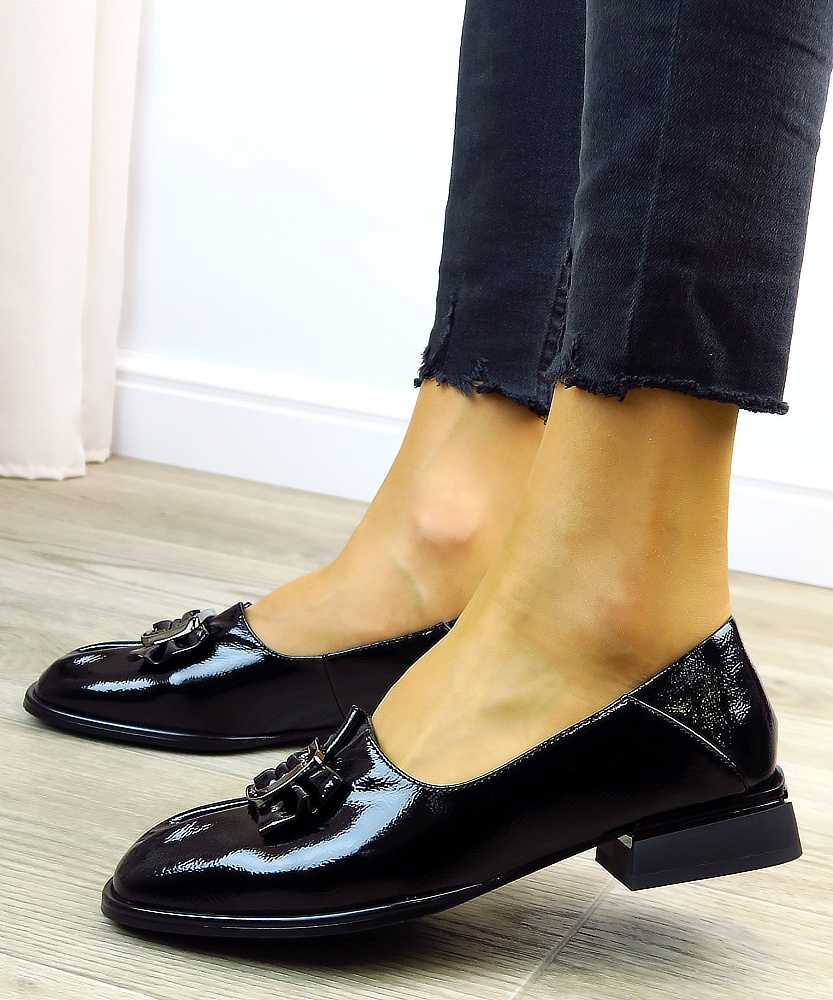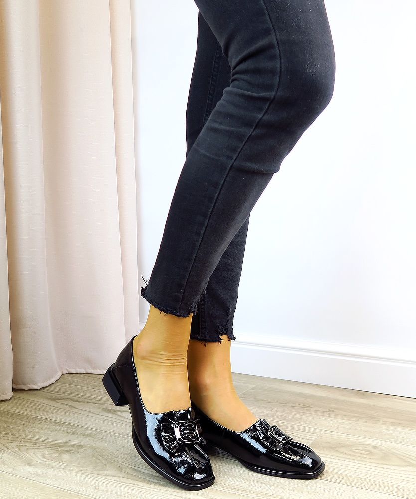 Elegantné dámske topánky v nadčasovom dizajne, ktoré skvele doplnia váš každodenný aj formálny outfit. Celokožený model v čiernom odtieni pôsobí veľmi sofistikovane a ľahko sa kombinuje s rôznymi štýlmi oblečenia. Lakovaný povrch dodáva topánkam luxusný vzhľad, zatiaľ čo dekoratívna mašľa s kovovou sponou na priehlavku pridáva ženský a štýlový detail. Stabilný, nižší podpätok zabezpečuje pohodlie pri celodennom nosení, vďaka čomu sú ideálnou voľbou do práce aj na spoločenské príležitosti.
