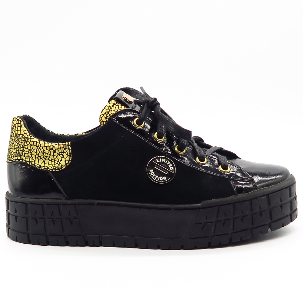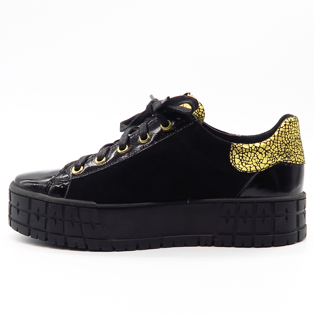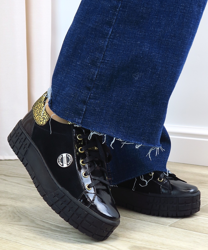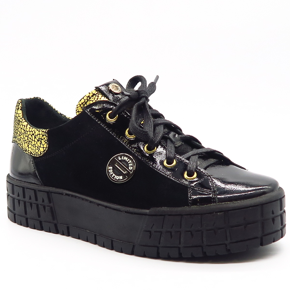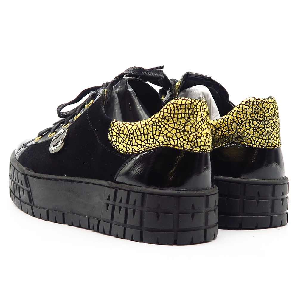 Štýlové dámske poltopánky, ktoré na prvý pohľad zaujmú kombináciou lesklého čierneho materiálu a výrazných zlatých detailov. Elegantný dizajn dopĺňa dekoratívne logo na boku a originálna vzorovaná pätová časť v zlatom prevedení. Zvršok vyrobený z prírodnej kože. Topánky majú klasické šnurovanie s kovovými očkami v zlatej farbe, pevnú a odolnú podrážku s výraznejším vzorom pre stabilný krok a pohodlný vnútorný priestor vhodný na celodenné nosenie.