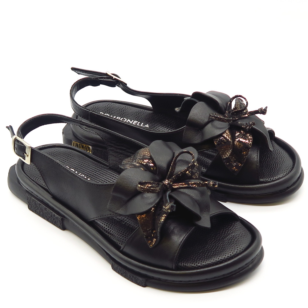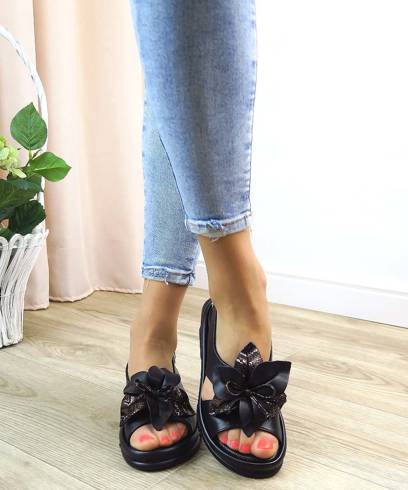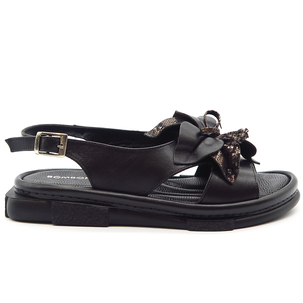 Elegantné dámske sandále značky BOMBONELLA. Model v čiernom prevedení ideálny pre ženy, ktoré hľadajú pohodlie bez kompromisov v štýle. Zvršok vyrobený z prírodnej kože. Dominantným prvkom je veľká ozdoba na priehlavku, ktorá dodáva topánkam luxusný vzhľad. Mäkká stielka vo vnútri Vám poskytne maximálny komfort. Trendový kúsok, ktorý ohúri na prvý pohľad.