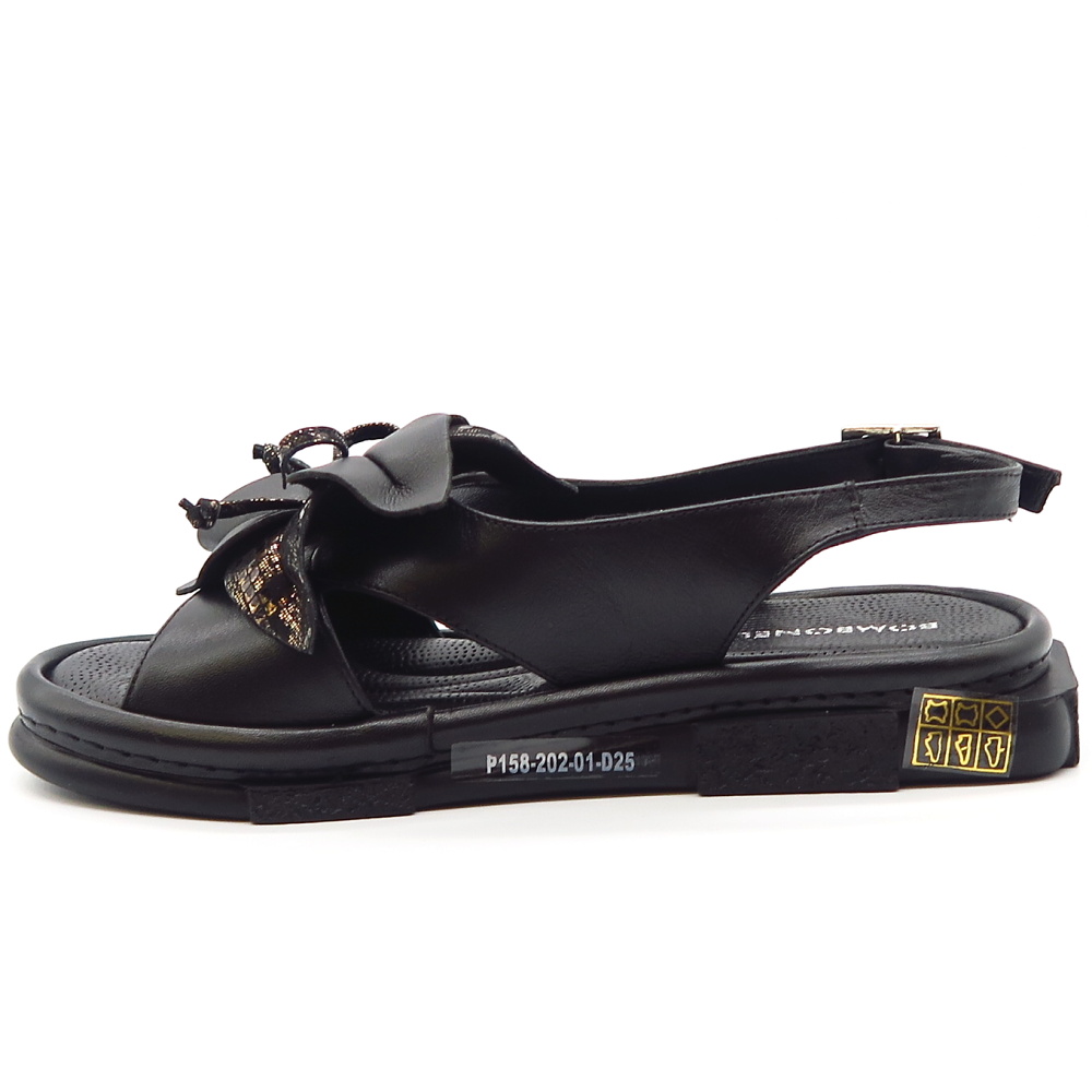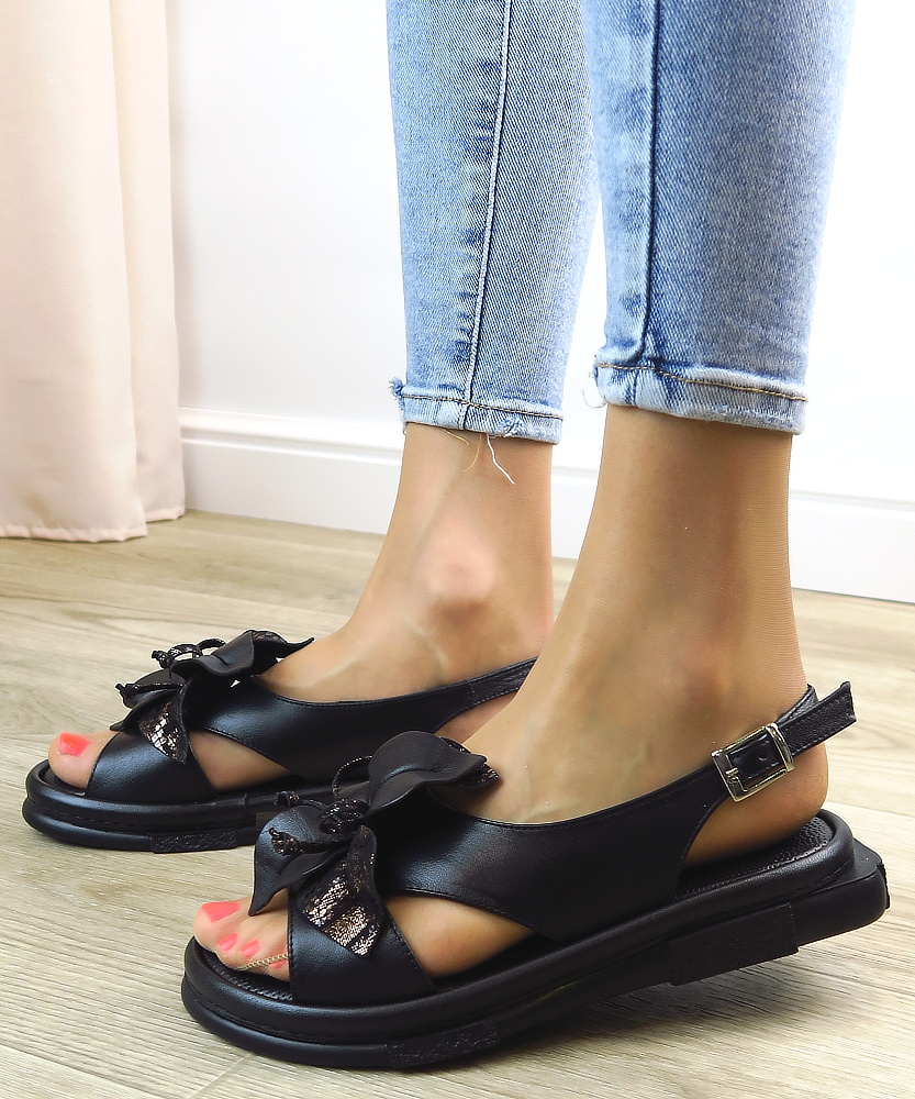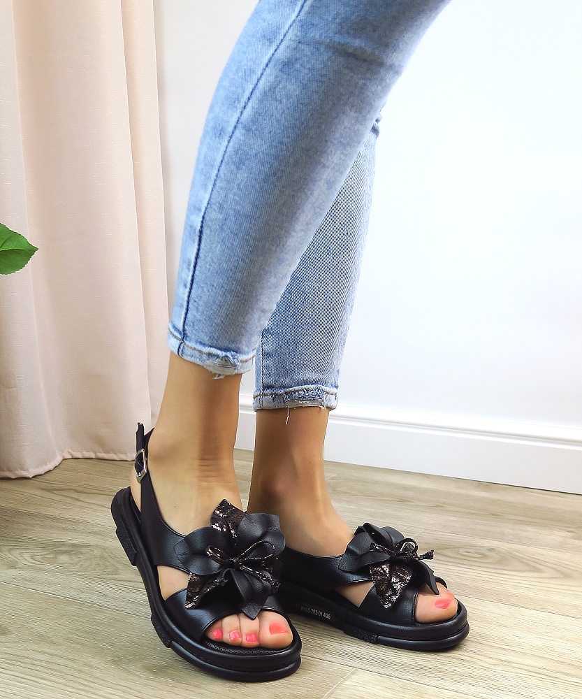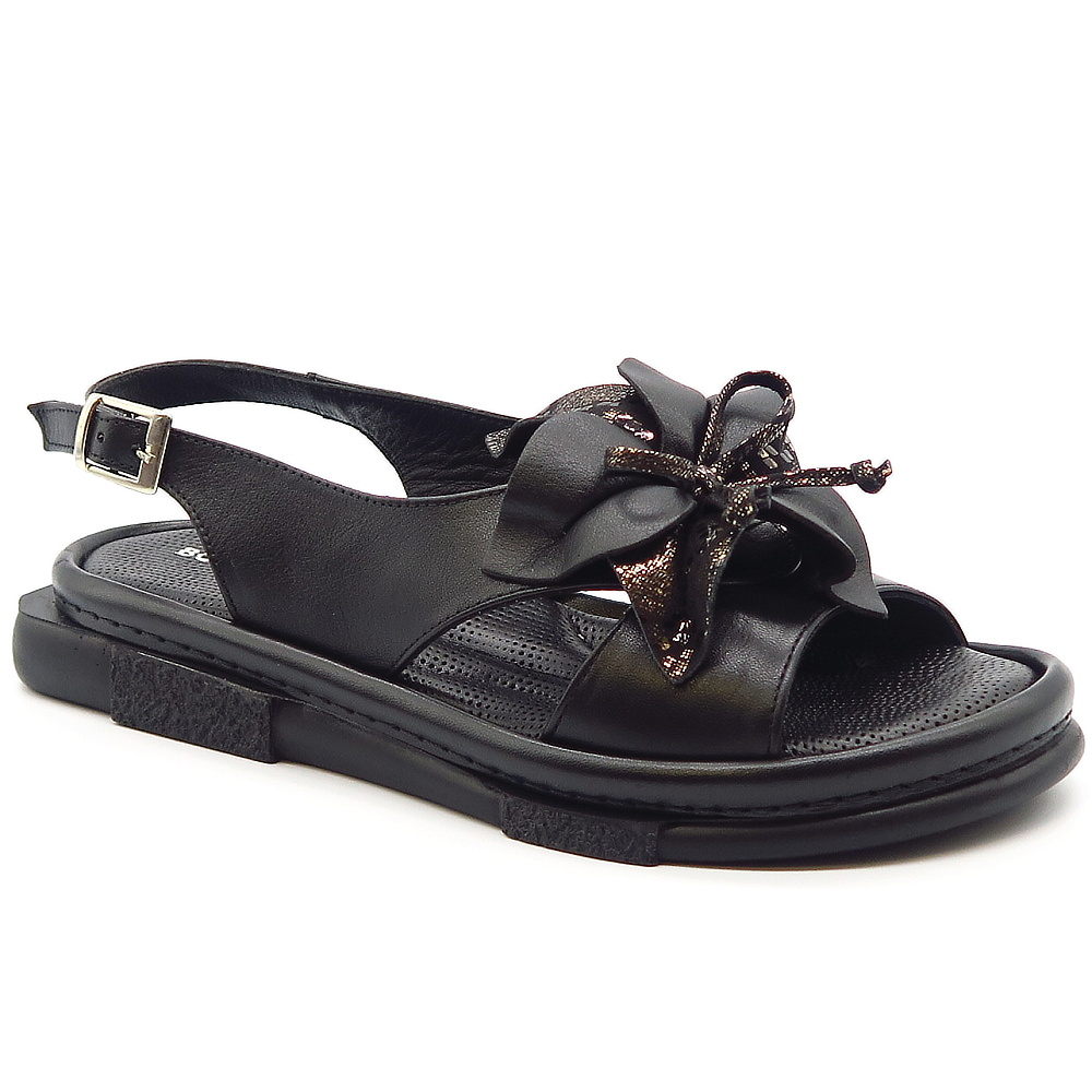 Elegantné dámske sandále značky BOMBONELLA. Model v čiernom prevedení ideálny pre ženy, ktoré hľadajú pohodlie bez kompromisov v štýle. Zvršok vyrobený z prírodnej kože. Dominantným prvkom je veľká ozdoba na priehlavku, ktorá dodáva topánkam luxusný vzhľad. Mäkká stielka vo vnútri Vám poskytne maximálny komfort. Trendový kúsok, ktorý ohúri na prvý pohľad.