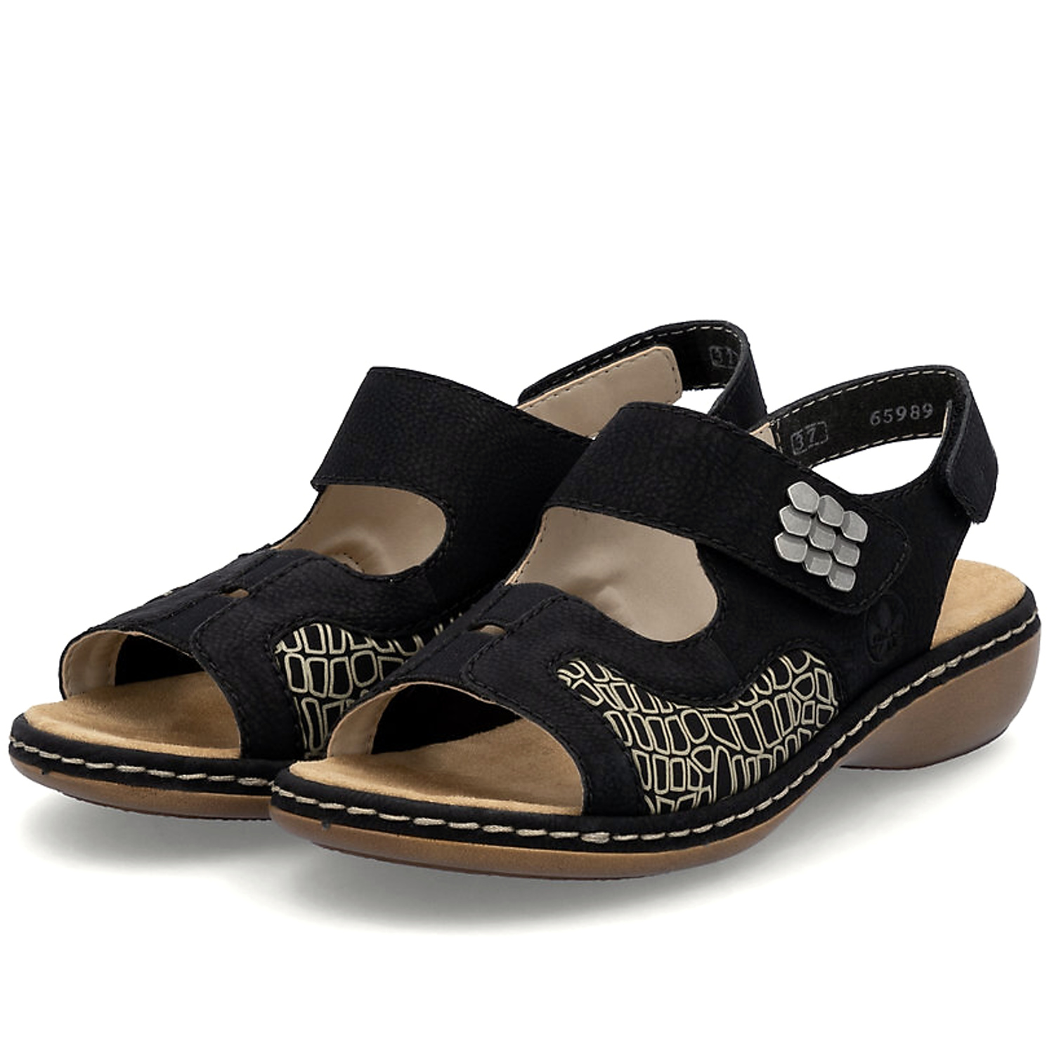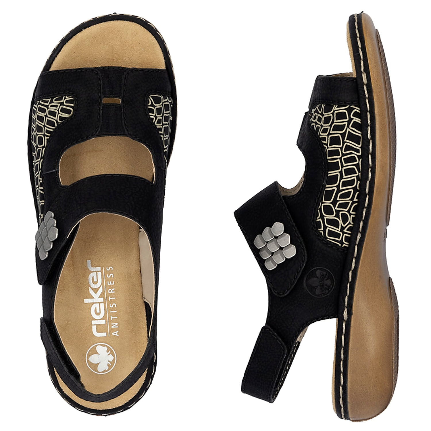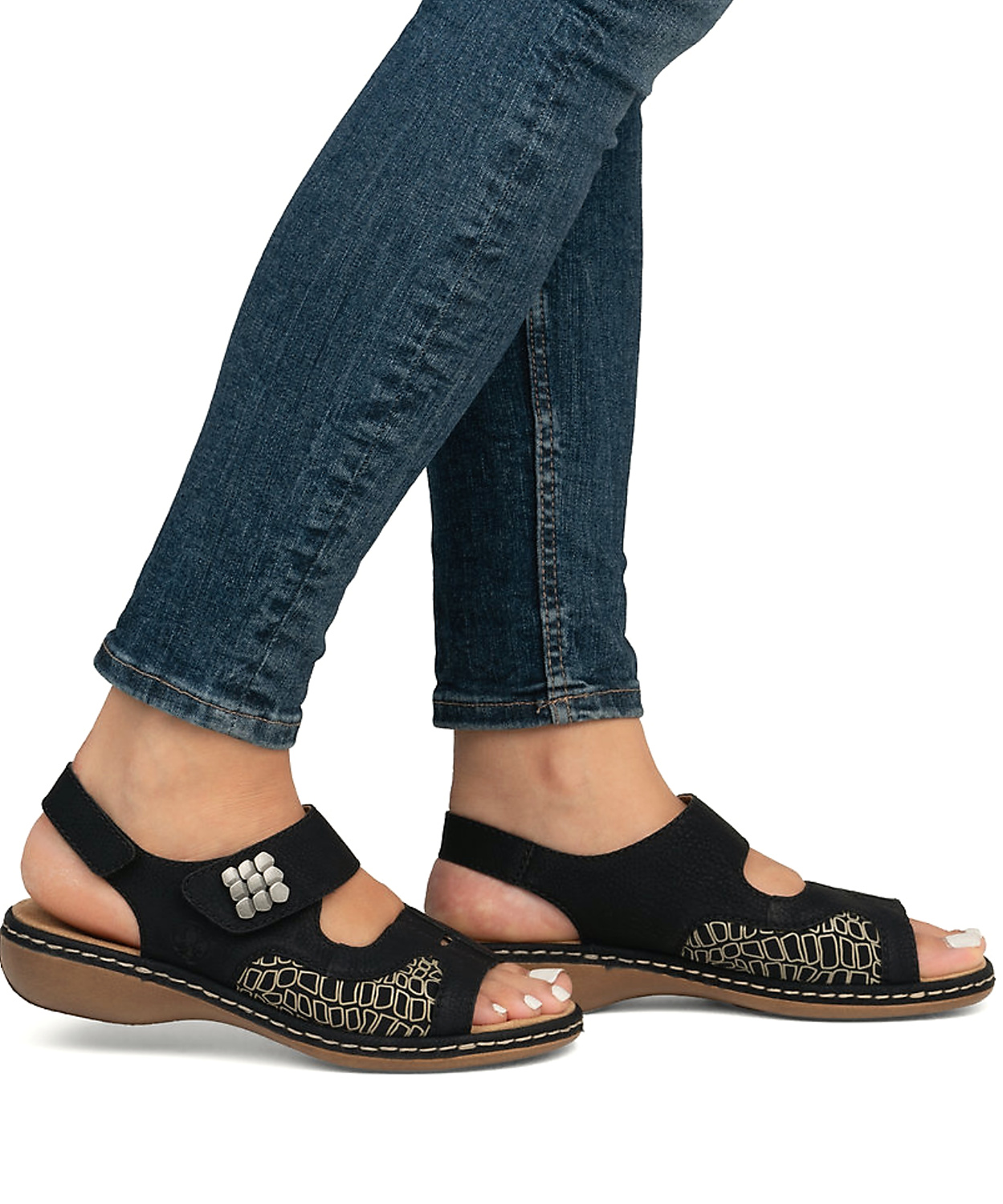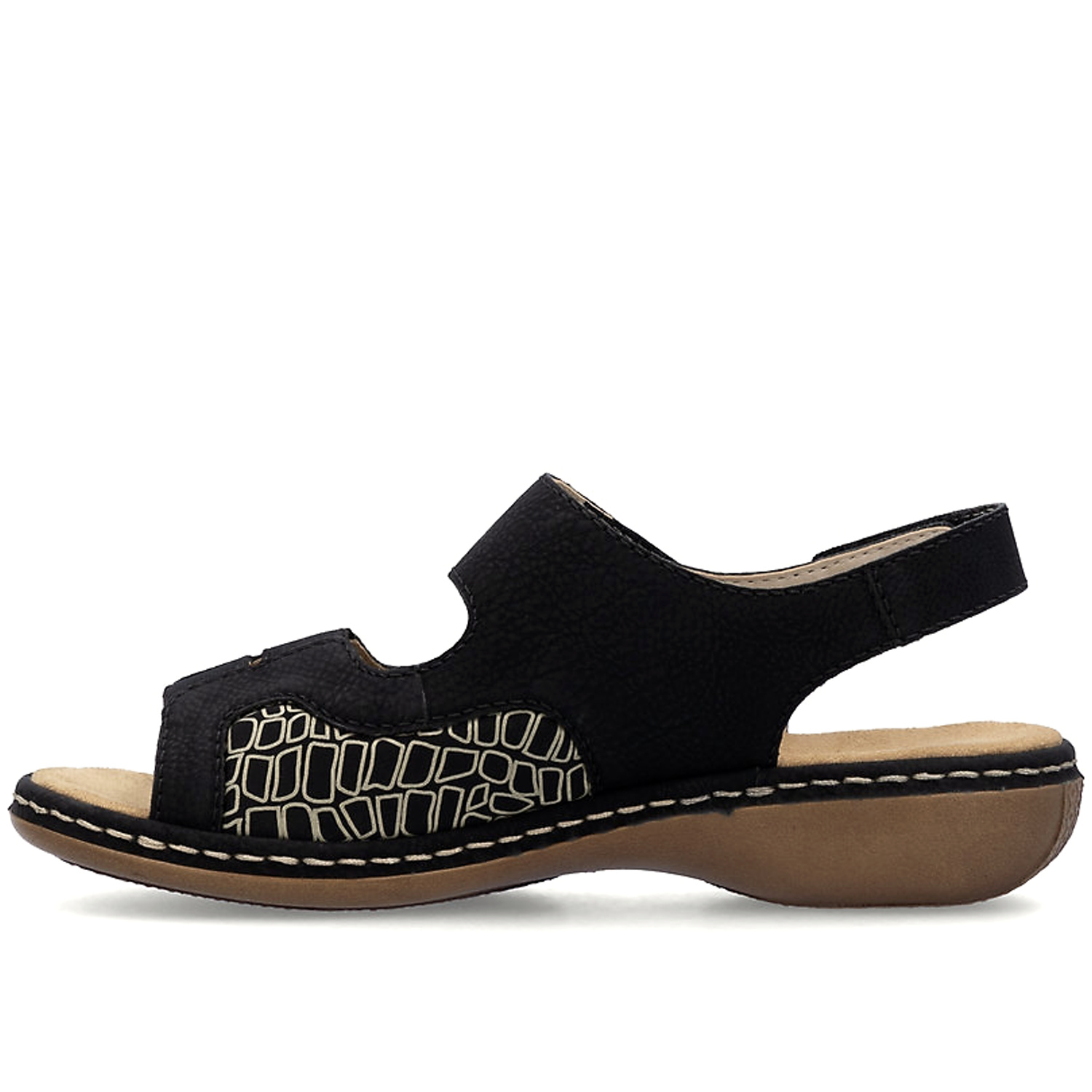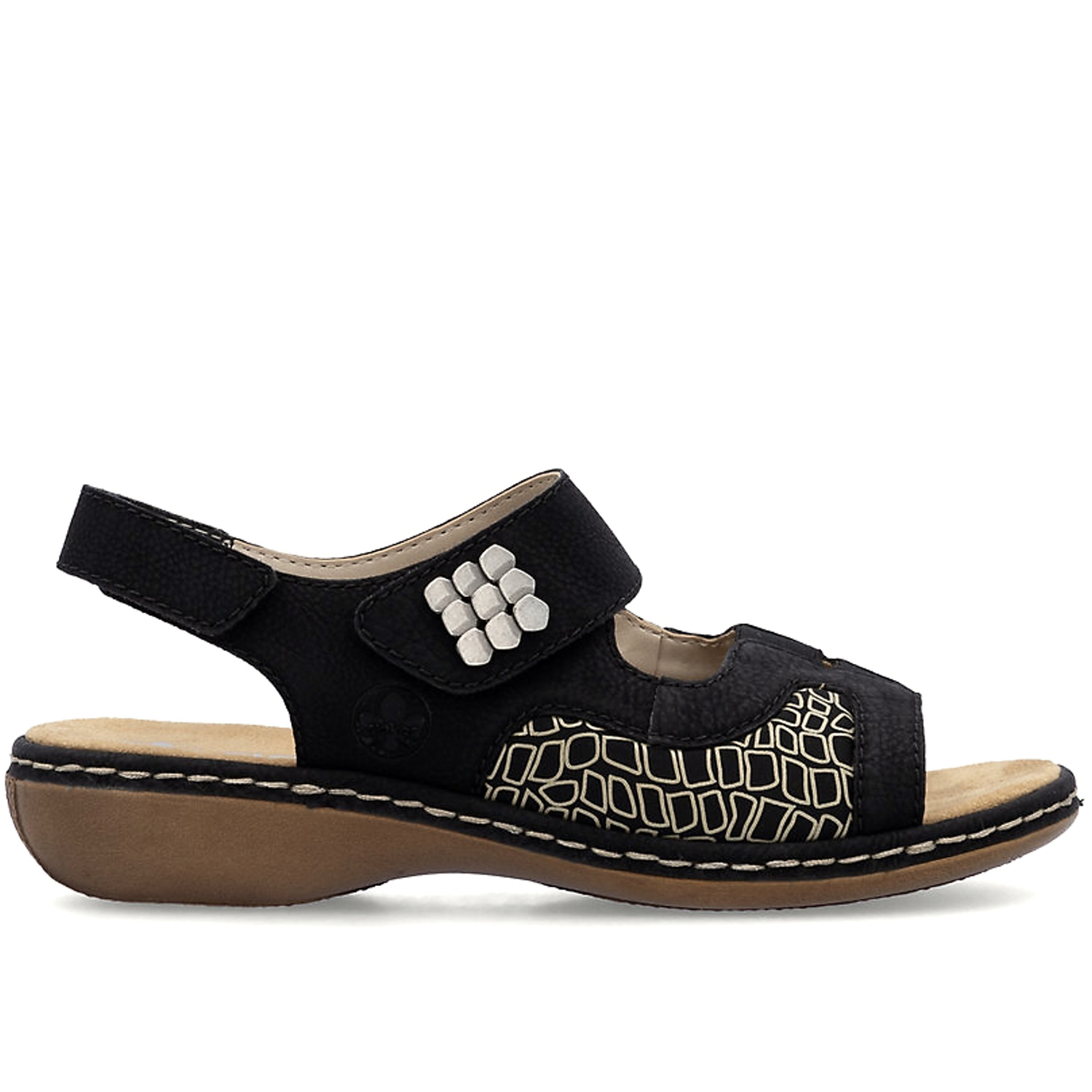 Dámske sandále od nemeckej značky RIEKER. Model v čiernej farbe s výraznou potlačou a dekoráciou na pásiku, ktorá dodáva modelu jedinečný charakter. Pásiky vybavené suchými zipsami umožňujú jednoduché nastavenie a pohodlné nosenie podľa vašich potrieb. Mäkká stielka sa postará o príjemný pocit pri každom kroku, zatiaľ čo špeciálna podošva tlmiaca nárazy zaistí komfort aj pri dlhšom nosení.