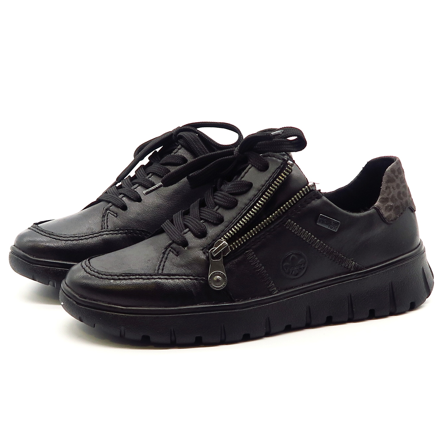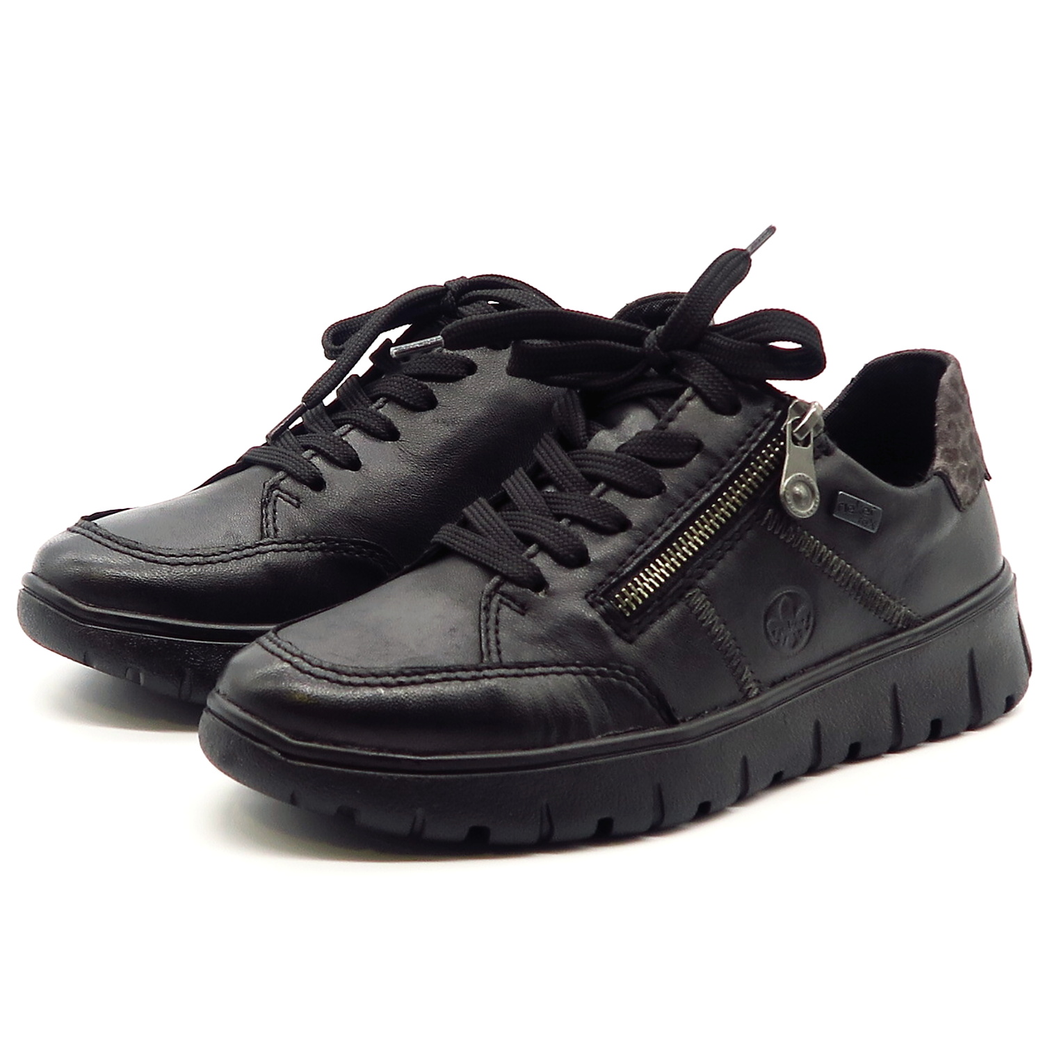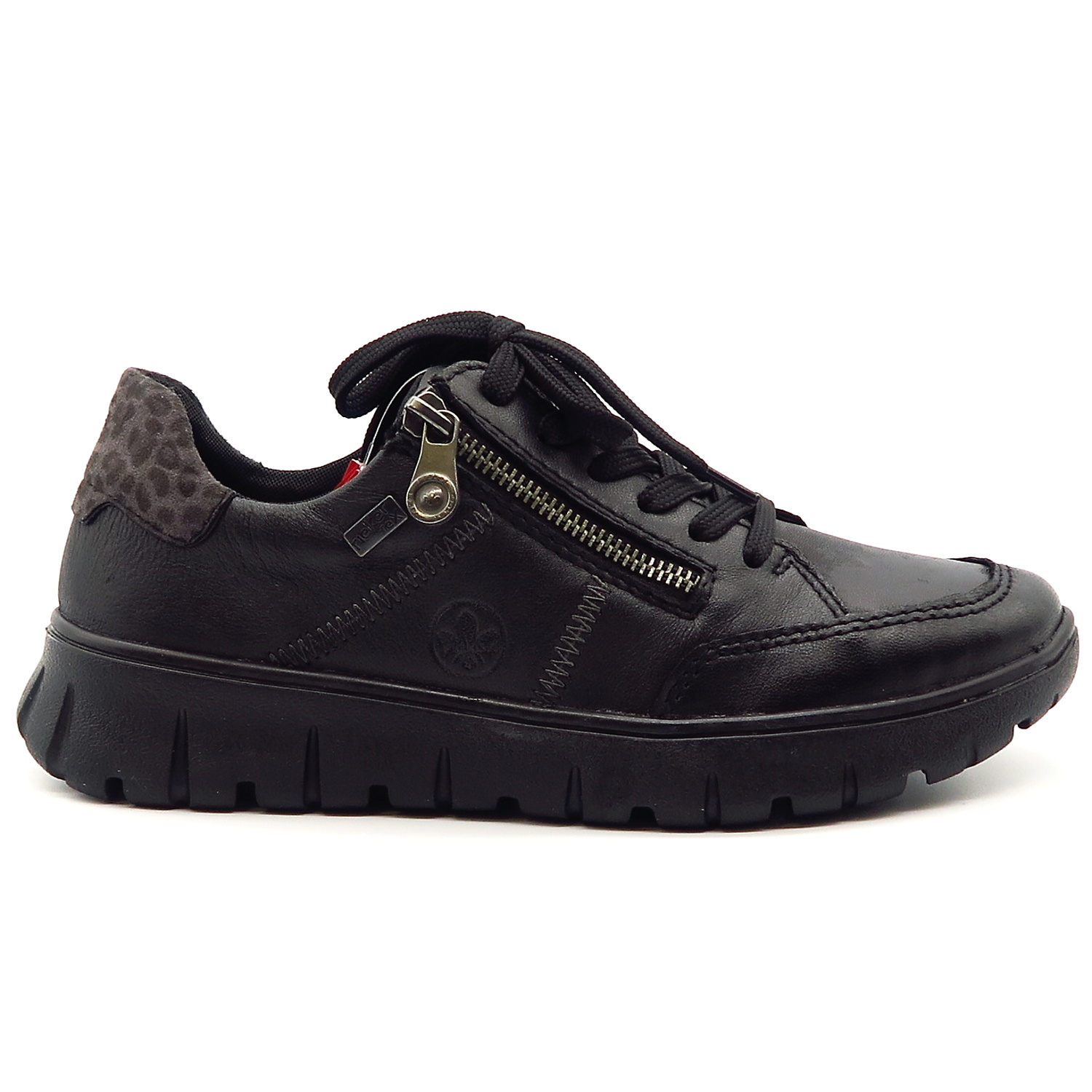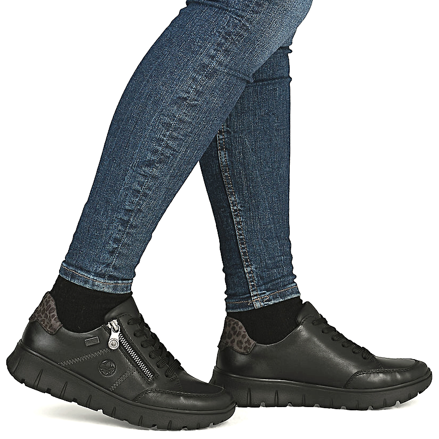 Dámske čierne poltopánky nemeckej značky RIEKER. Model v čiernej farbe. Zvršok vyrobený z prírodnej kože. Vnútro aj stielka sú z mäkkého textilu, ktorý zabezpečuje príjemný pocit pri chôdzi. Typická technológia ANTISTRESS prispieva k lepšiemu odpruženiu, flexibilite a znižuje únavu nôh. Podrážka je ľahká, protišmyková a dobre tlmí nárazy. Zapínanie – šnurovanie, ale aj bočný zips.