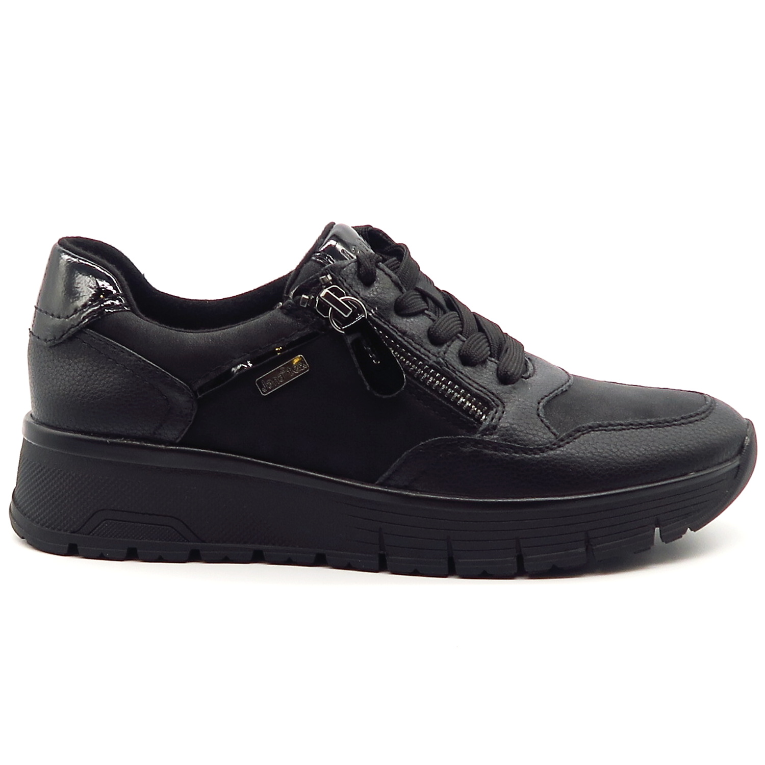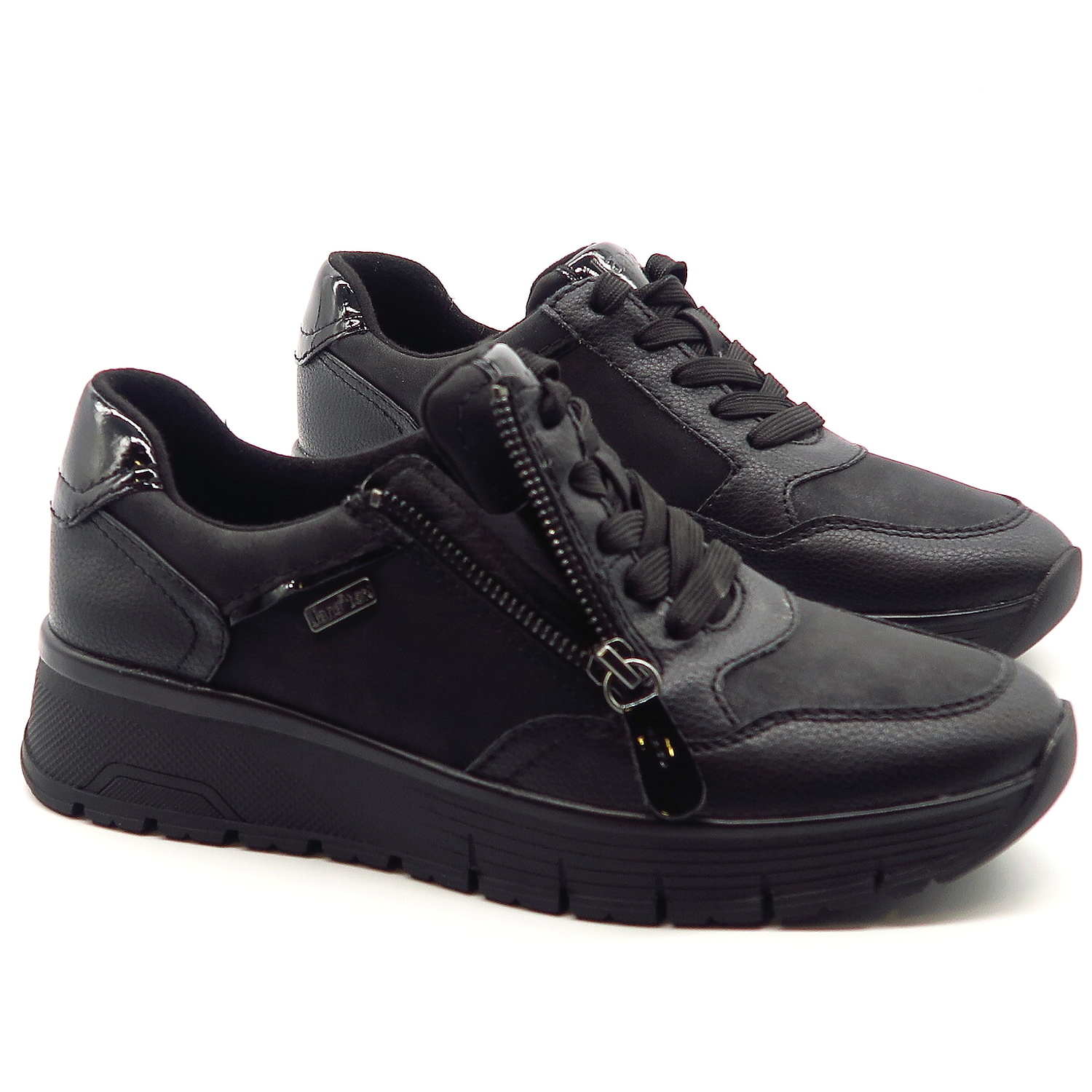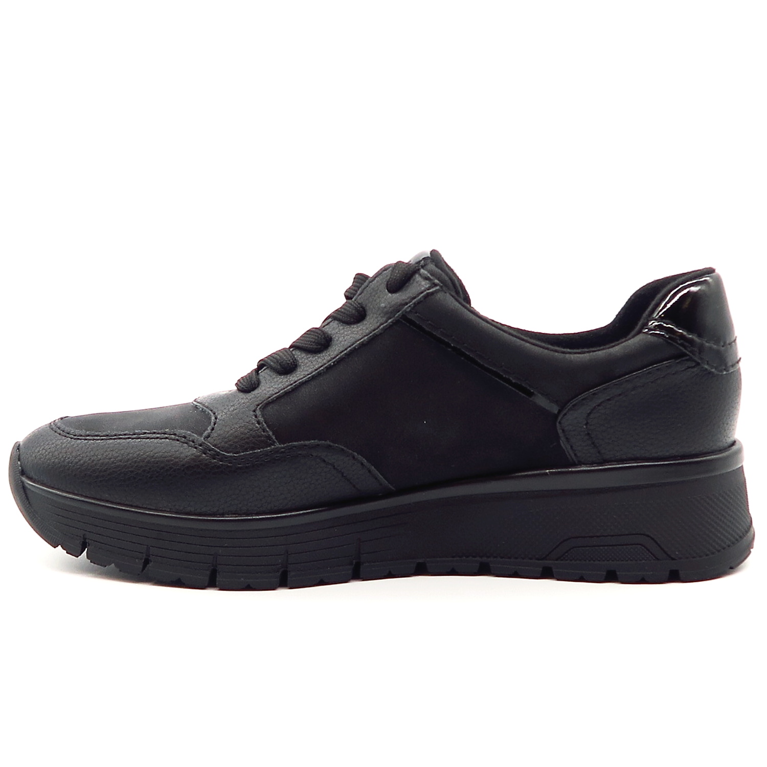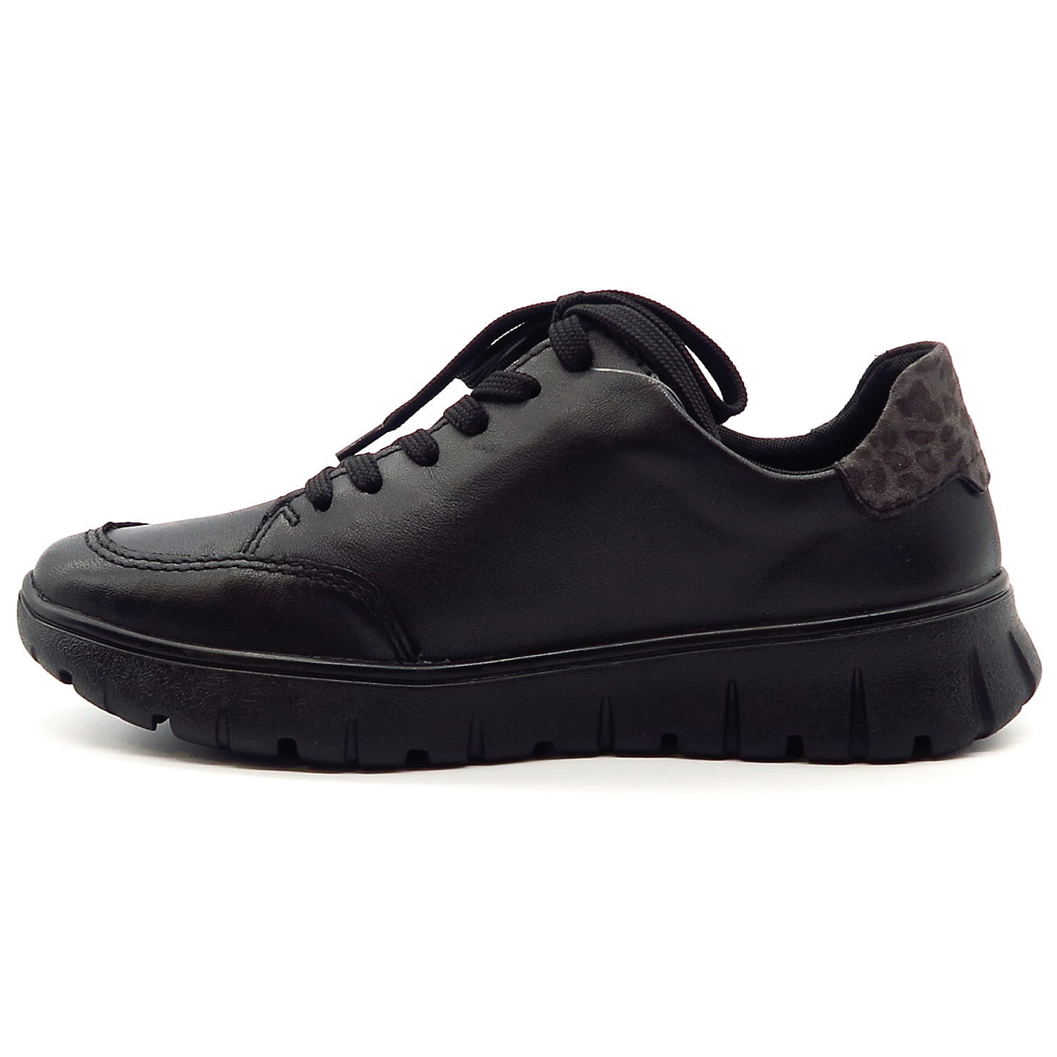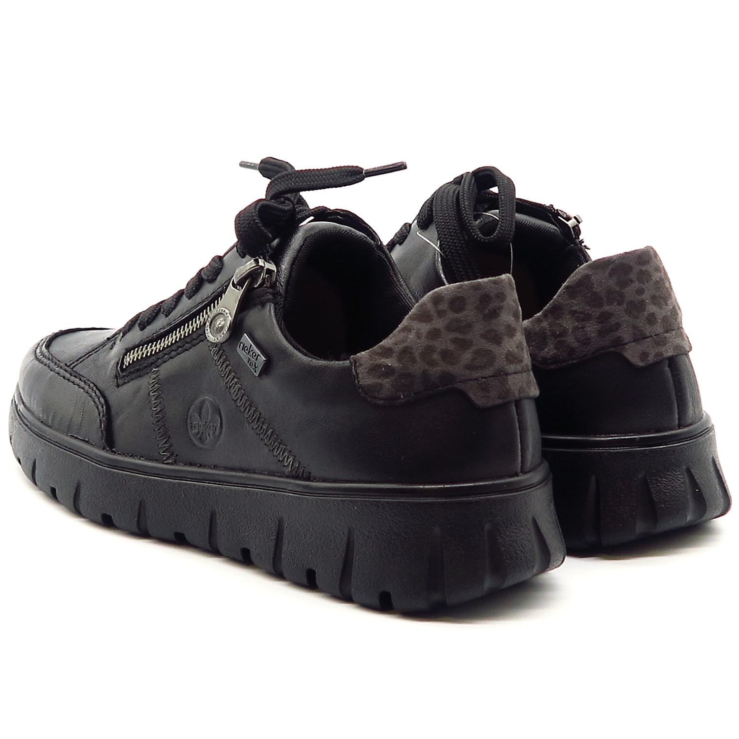 Dámske čierne poltopánky nemeckej značky RIEKER. Model v čiernej farbe. Zvršok vyrobený z prírodnej kože. Vnútro aj stielka sú z mäkkého textilu, ktorý zabezpečuje príjemný pocit pri chôdzi. Typická technológia ANTISTRESS prispieva k lepšiemu odpruženiu, flexibilite a znižuje únavu nôh. Podrážka je ľahká, protišmyková a dobre tlmí nárazy. Zapínanie – šnurovanie, ale aj bočný zips.