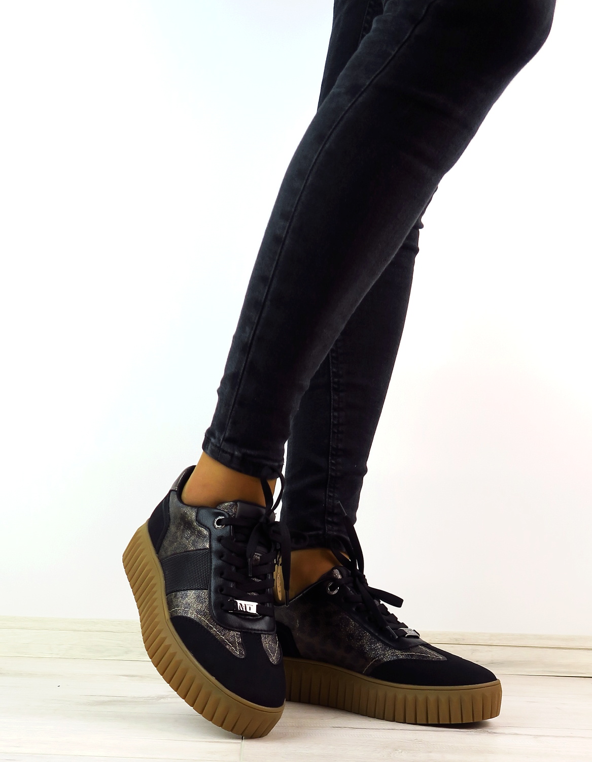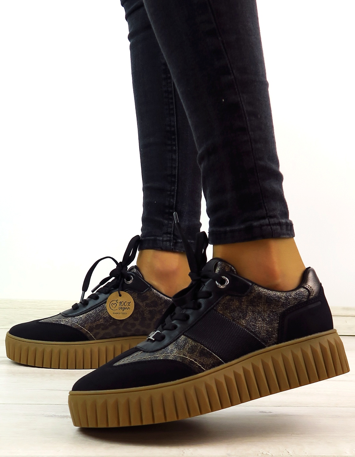 Dámske tenisky nemeckej značky MARCO TOZZI. Čierna farba doplnená o zvierací motív, ktorý topánkam dodáva módny look. Zvršok vyrobený z ekologickej kože. Masívna platformová podrážka v hnedej farbe zabezpečuje stabilitu a pohodlné nosenie. Tenisky majú klasické šnurovanie, ktoré zdobí strieborné logo značky. Pohodlné a trendové tenisky ideálne na túto sezónu.