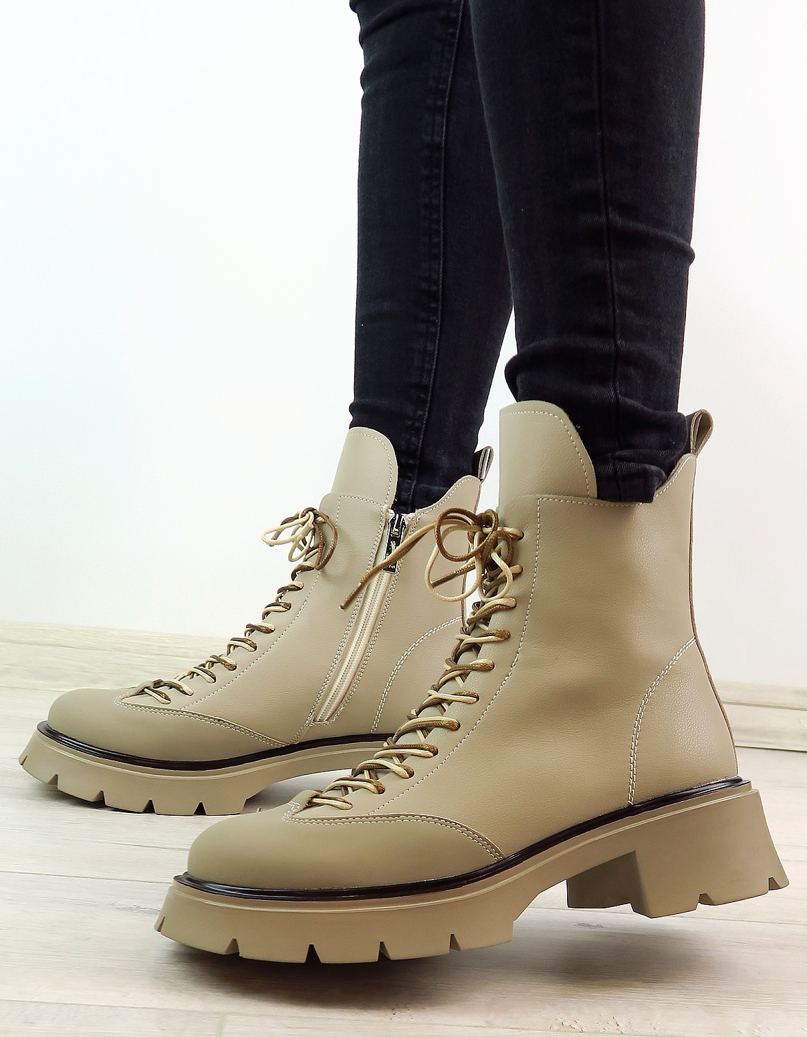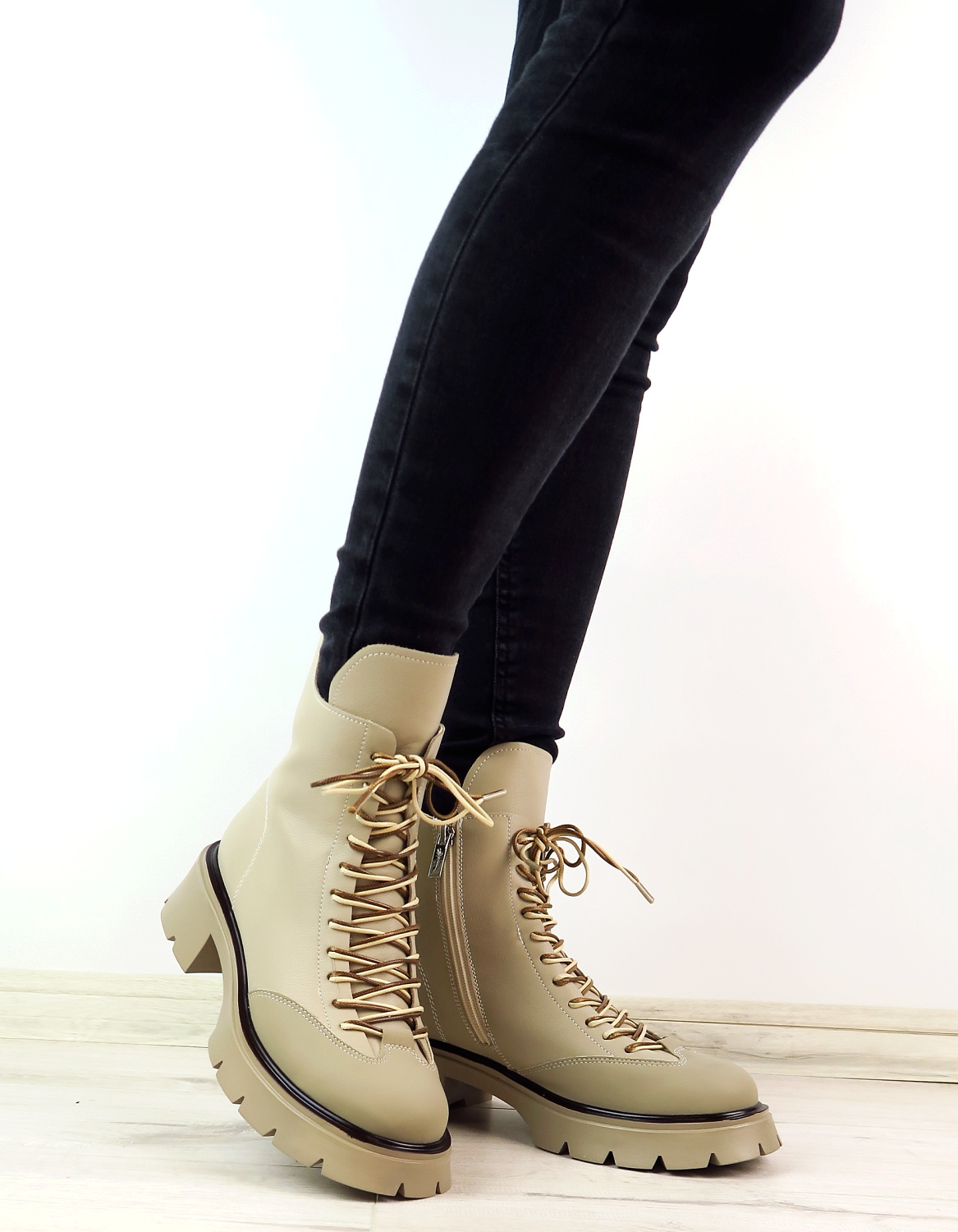 Štýlové dámske workery v trendy béžovej farbe, ktoré nesmú chýbať vo vašom šatníku. Masívna podrážka nielenže pôsobí moderne, ale zároveň poskytuje stabilitu a komfort pri každom kroku. Šnurovanie umožňuje dokonalé prispôsobenie chodidlu, vďaka čomu sa budete cítiť pohodlne počas celého dňa. Zvršok vyrobený z prírodnej kože. Vhodné na chladnejšie obdobie. Zateplené jemnou kožušinou.