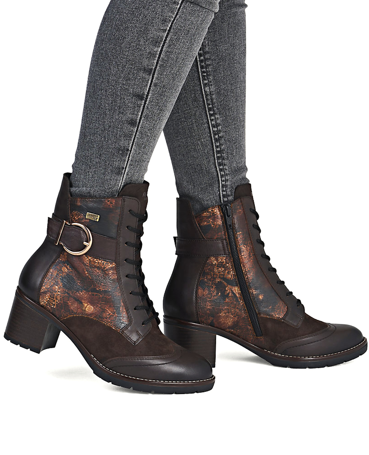 Dámske členkové topánky od nemeckej značky REMONTE. Model v krásnej tmavohnedej až čiernej farbe s dekoratívnymi hnedými detailmi a štruktúrovanou potlačou. Predná časť je riešená šnurovaním, na boku je ozdobná kovová pracka v zlatej farbe. Topánky majú zaoblenú špičku a pôsobia elegantne, no zároveň prakticky. Vďaka TEX membráne budú vaše nohy v suchu. Komfortný kúsok ideálny na každý deň.