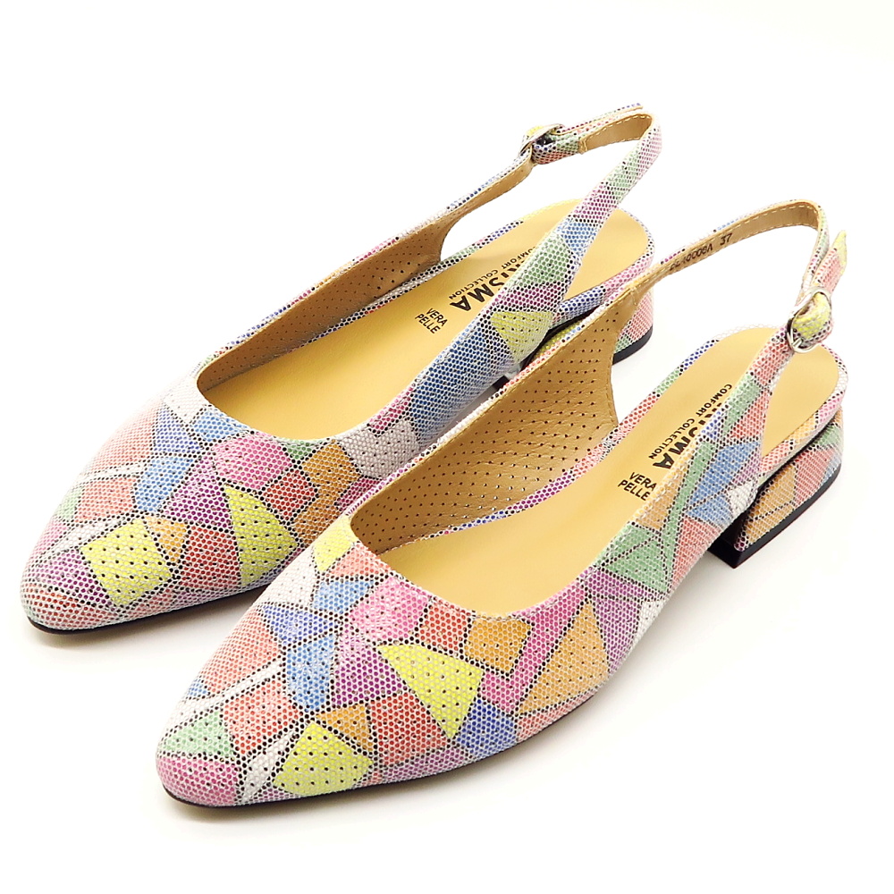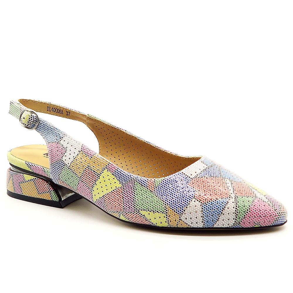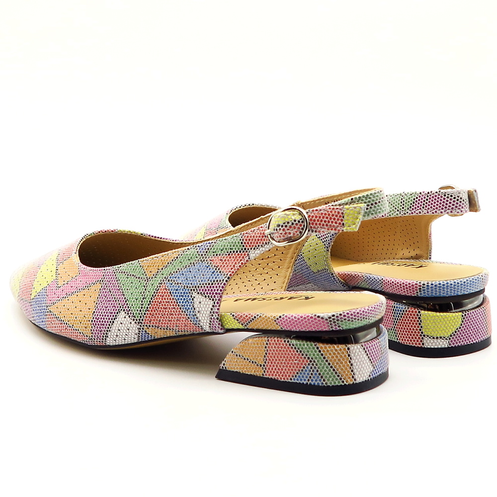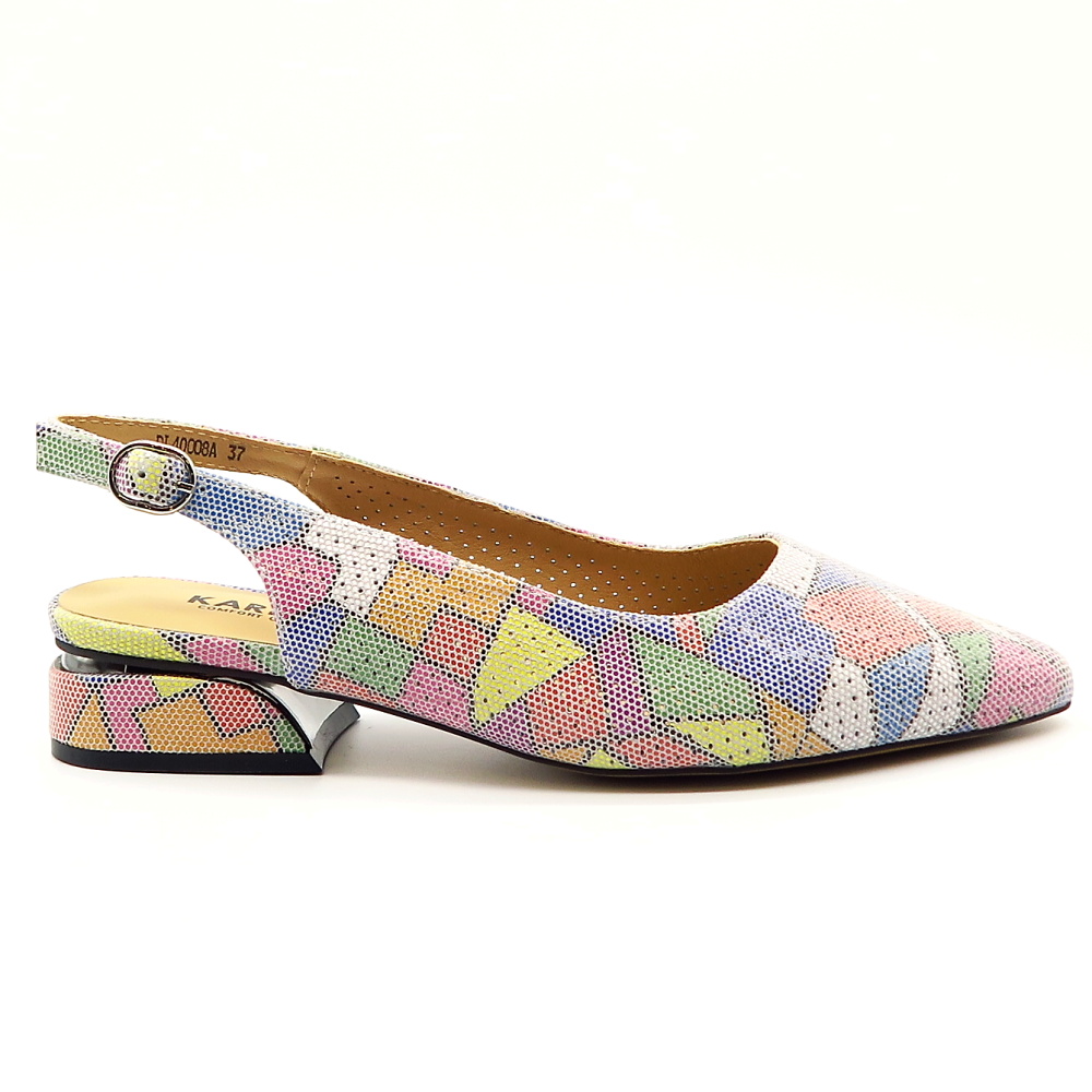 Elegantné dámske sandále značky KARISMA. Model v krásnom farebnom dizajne, ktorý oživí každý outfit. Sandále na pohodlnom nízkom podpätku s nastaviteľným ramienkom okolo päty pre lepšie prispôsobenie a stabilitu pri chôdzi. Jemný perforovaný zvršok zabezpečuje priedušnosť a komfort počas celého dňa. Viacfarebný geometrický vzor pôsobí moderne a zároveň ľahko kombinovateľne. Mäkká vnútorná stielka poskytuje príjemný pocit pri nosení.