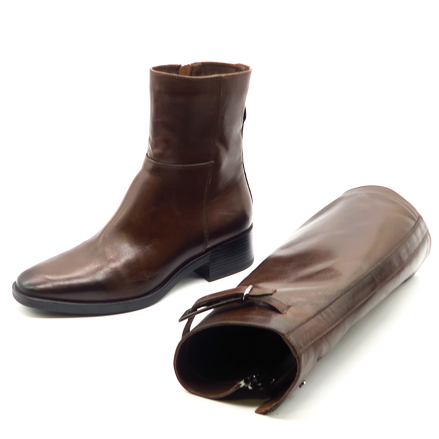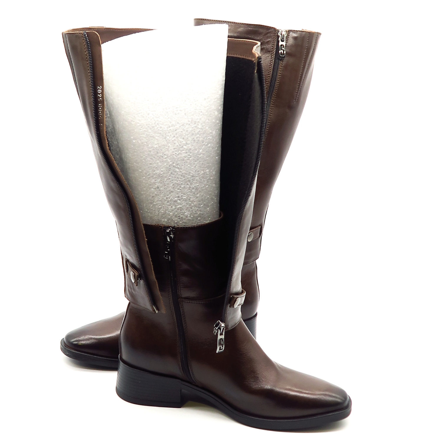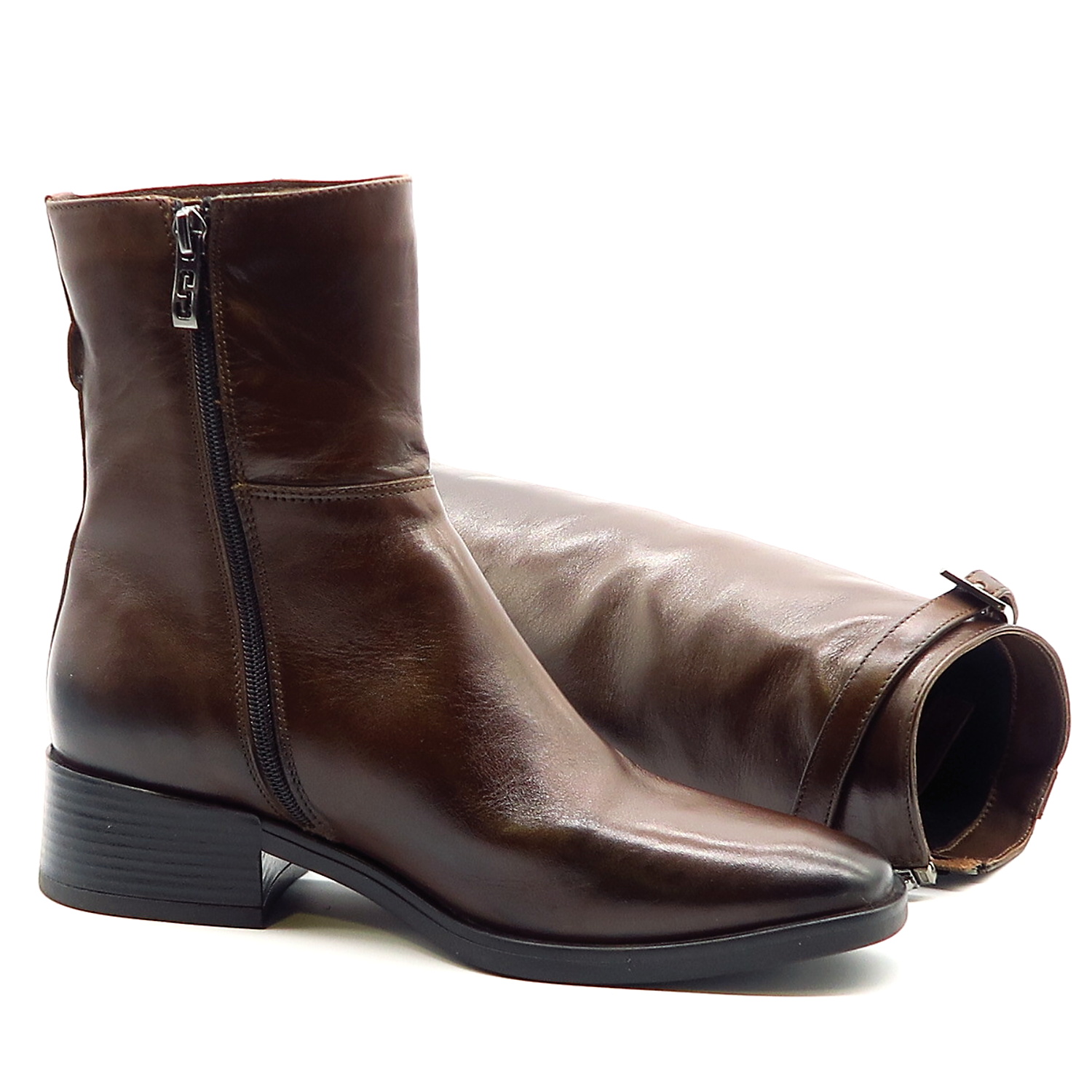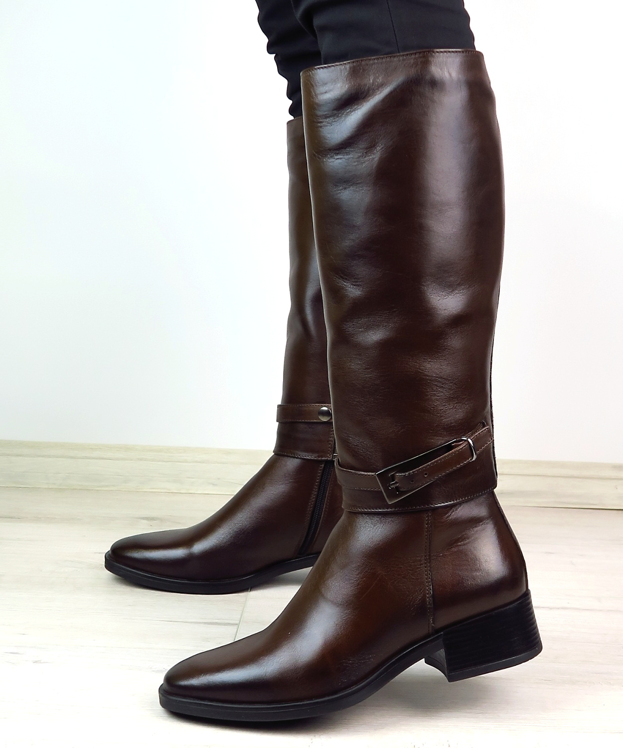 Elegantné dámske čižmy v tmavohnedej farbe vyrobené z prírodnej kože. Štýlovo pôsobí dekoratívny ramienok s kovovou sponou, ktorý dodáva obuvi moderný vzhľad. Praktickým prvkom je dvojitý zips po vnútornej strane, vďaka ktorému sa čižmy ľahko obúvajú a zároveň ich možno pohodlne skrátiť – takže ich môžete nosiť nielen ako vysoké čižmy, ale aj ako členkovú obuv. Stabilný nižší podpätok zaručuje komfort pri chôdzi.