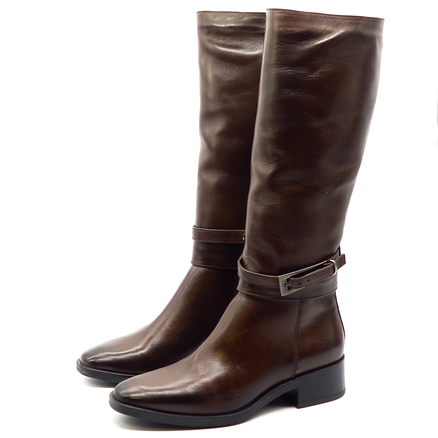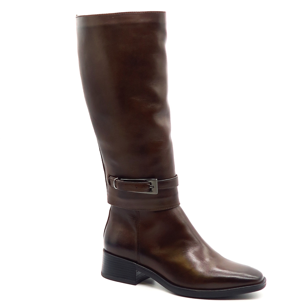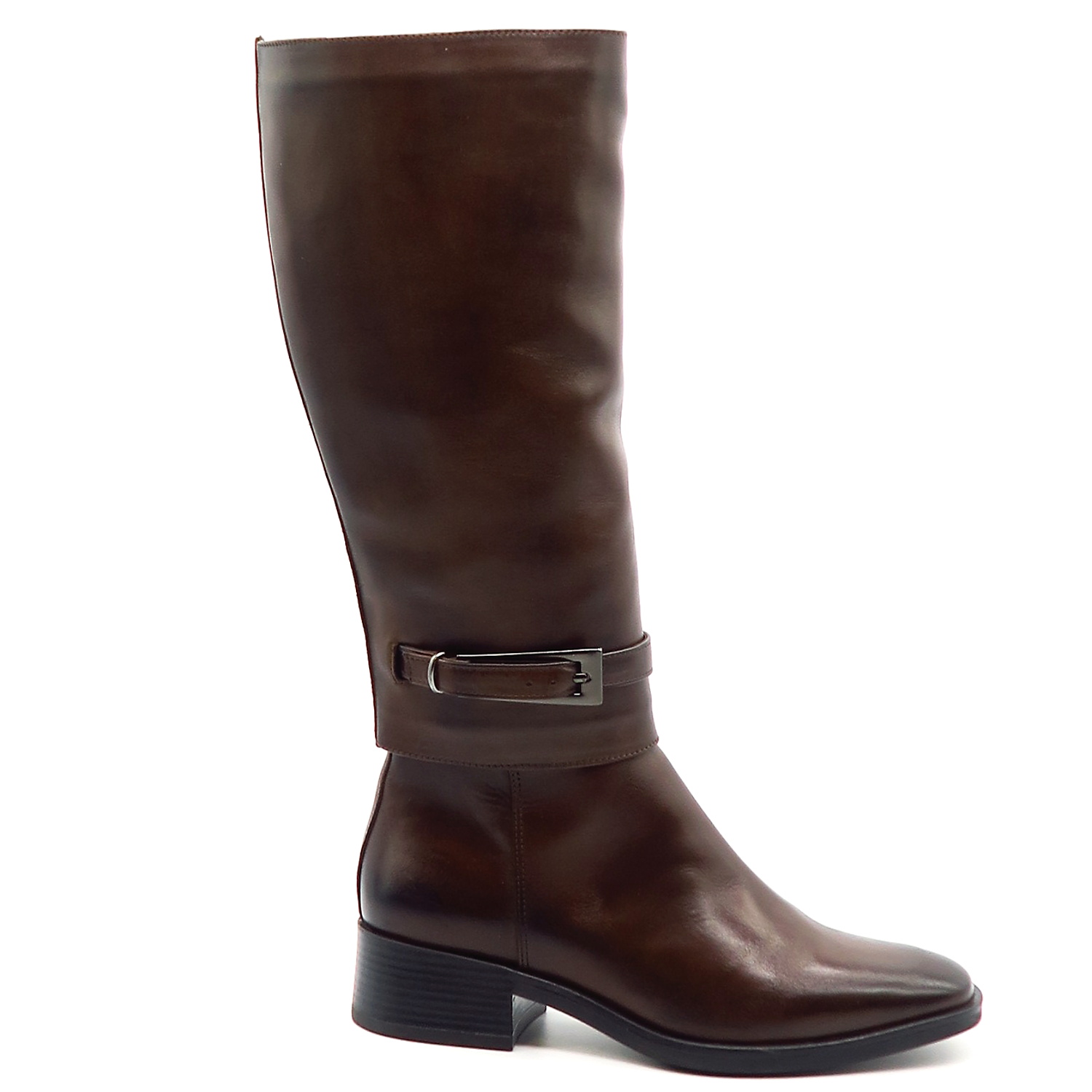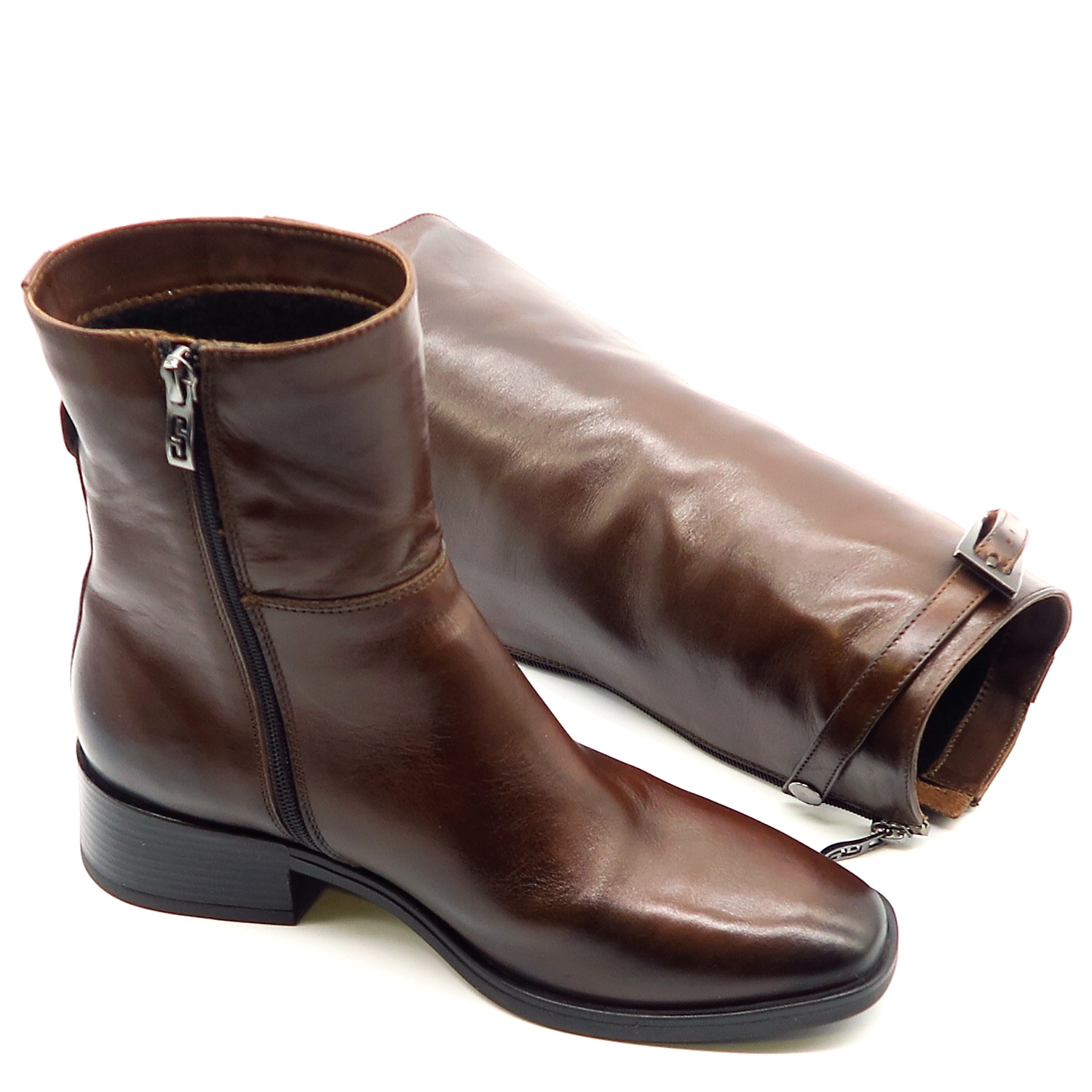 Elegantné dámske čižmy v tmavohnedej farbe vyrobené z prírodnej kože. Štýlovo pôsobí dekoratívny ramienok s kovovou sponou, ktorý dodáva obuvi moderný vzhľad. Praktickým prvkom je dvojitý zips po vnútornej strane, vďaka ktorému sa čižmy ľahko obúvajú a zároveň ich možno pohodlne skrátiť – takže ich môžete nosiť nielen ako vysoké čižmy, ale aj ako členkovú obuv. Stabilný nižší podpätok zaručuje komfort pri chôdzi.