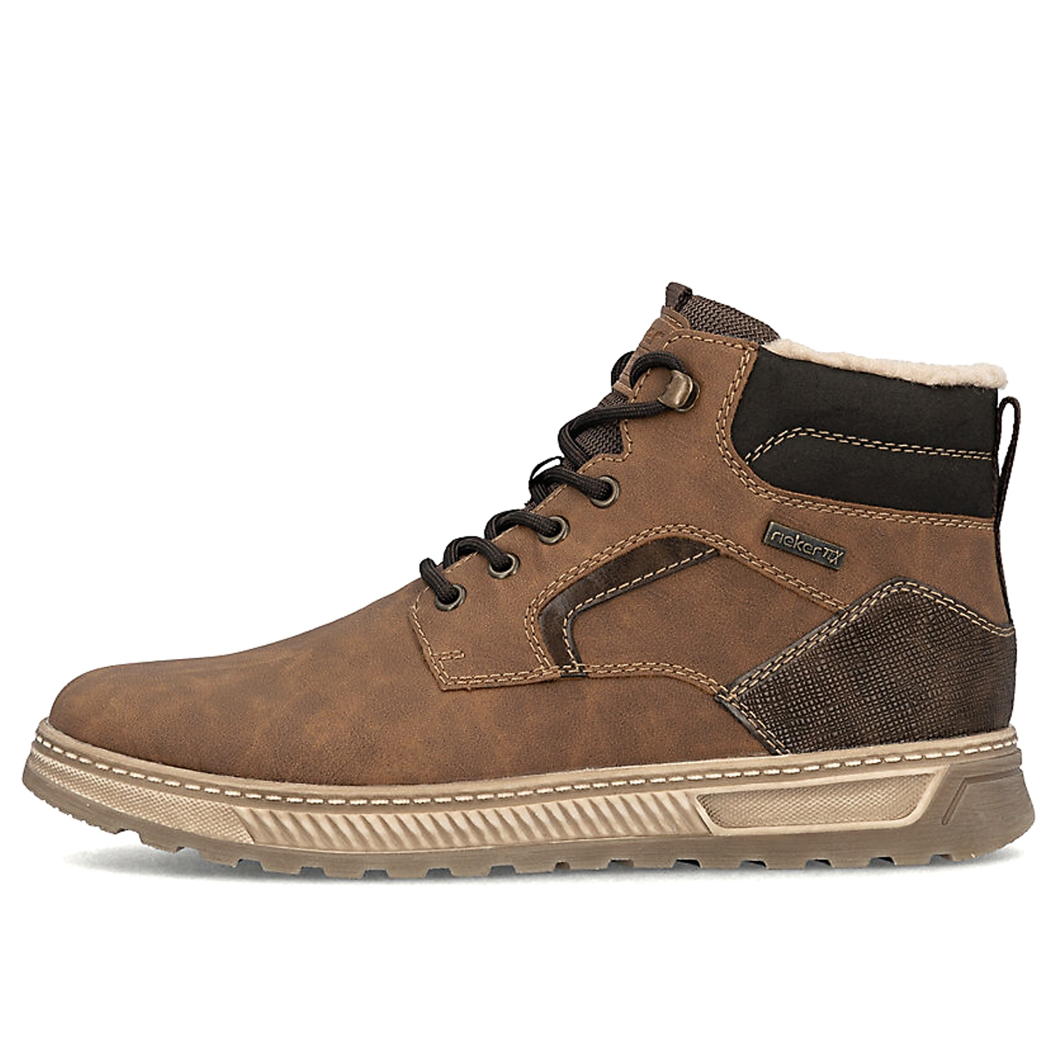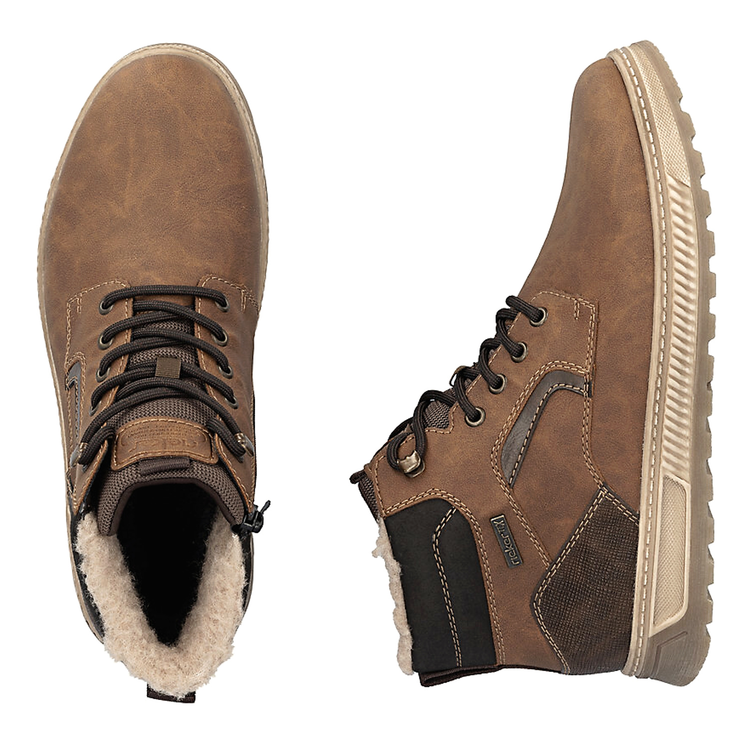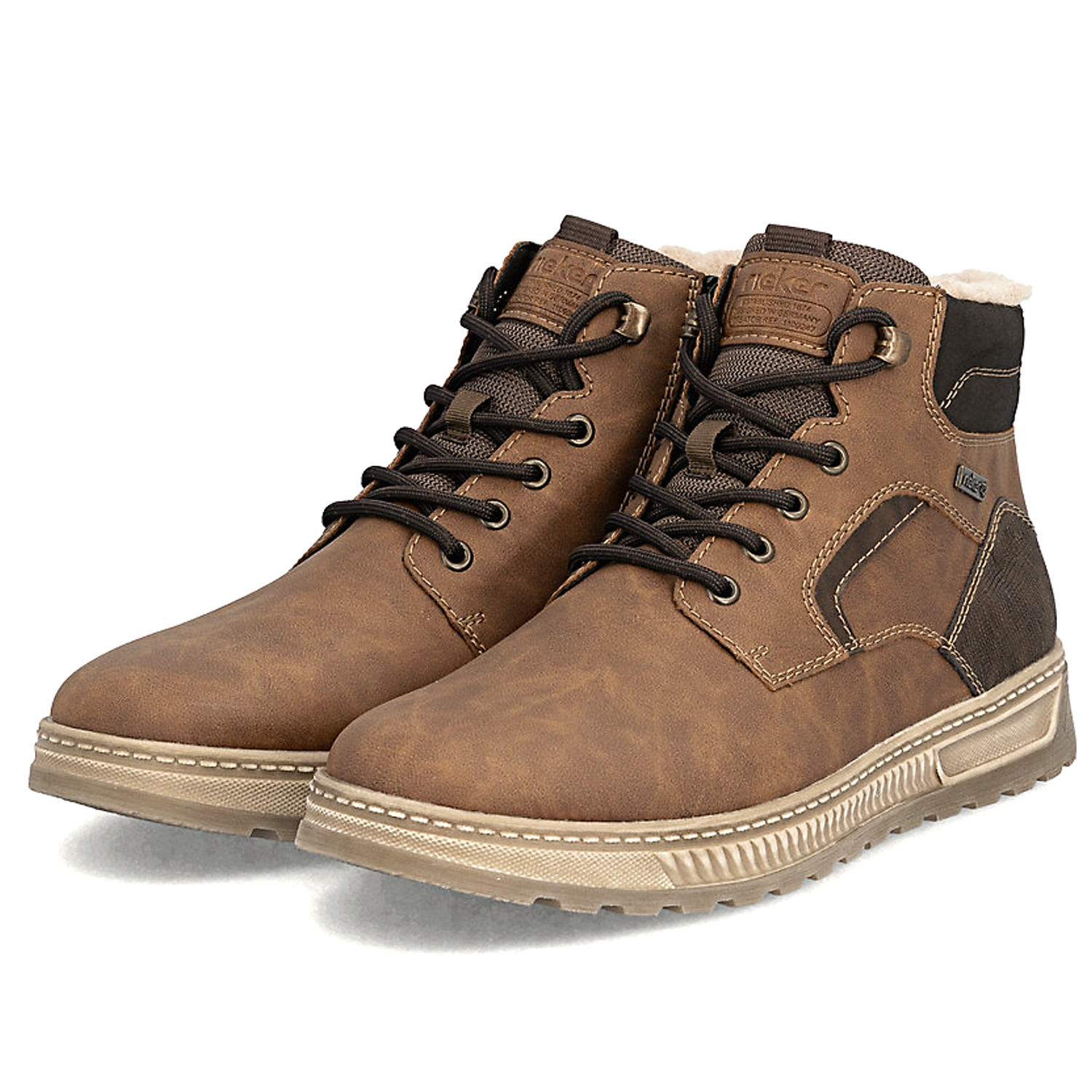 Pánske členkové topánky nemeckej značky RIEKER. Model v hnedej farbe. Zvršok tvorí ekologická koža. Model vhodný na zimu, vďaka teplej kožušine vo vnútri. Zapínanie – šnurovanie, ale aj zips. Topánky vhodné na širšie chodidlá. TEX membrána zaručí pocit sucha. Vnútorná stielka s technológiou ANTISTRESS Vám zaručí komfortný krok.