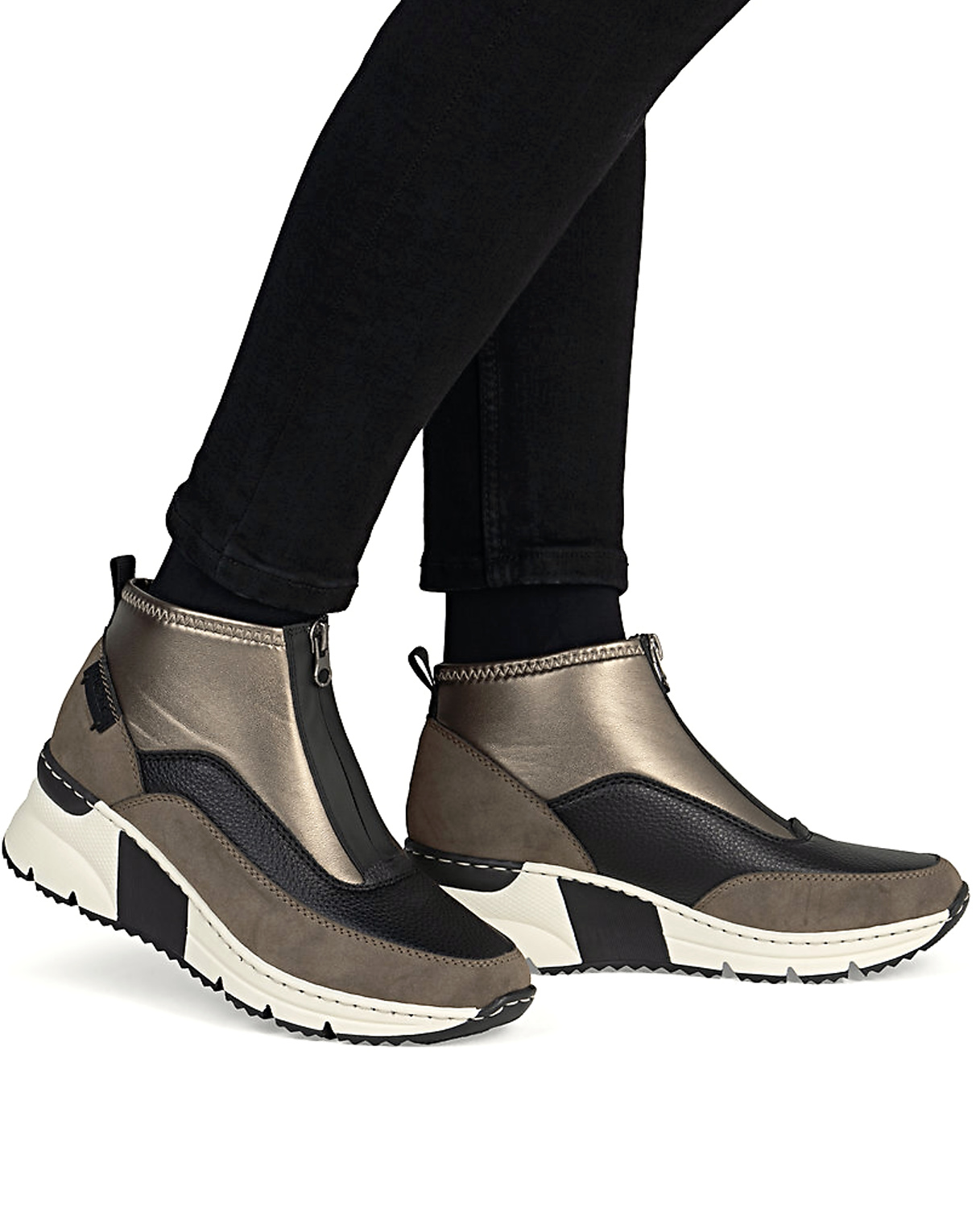 Dámske členkové topánky nemeckej značky RIEKER. Model v štýlovom metalickom vzhľade, ktorý kombinuje moderný dizajn s maximálnym komfortom. Praktický predný zips umožňuje rýchle obúvanie, zatiaľ čo ľahká klinová podrážka s ANTISTRESS technológiou tlmí nárazy a uľahčuje chôdzu. Vyberateľná pamäťová stielka sa prispôsobí chodidlu a poskytne celodenné pohodlie – ideálne na bežné nosenie aj na voľný čas.