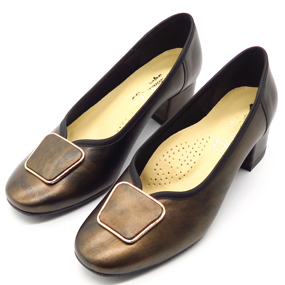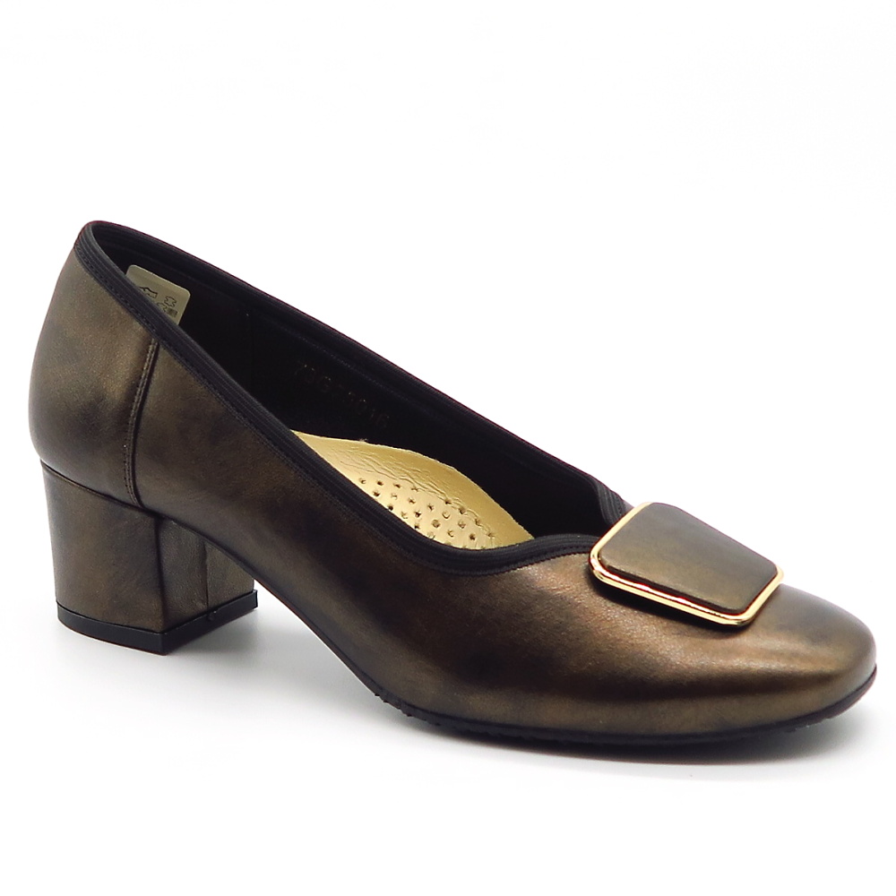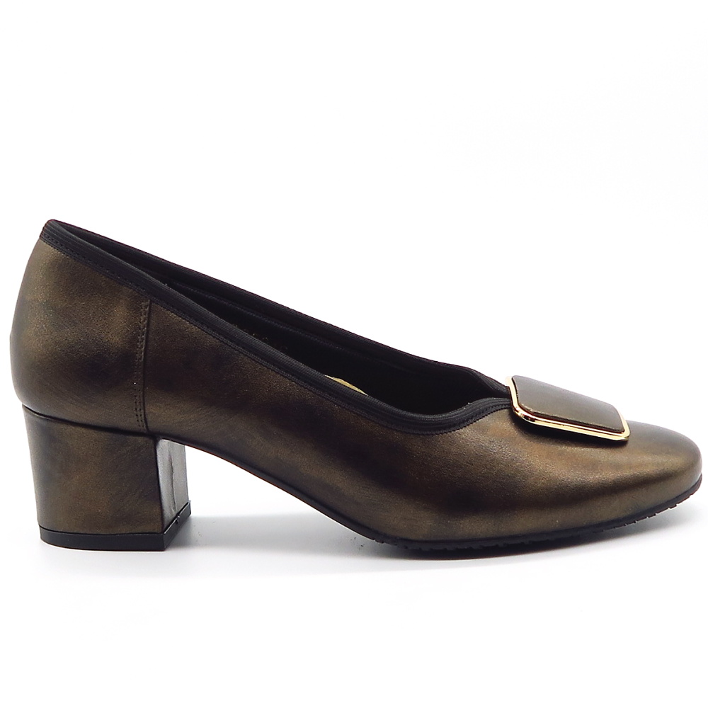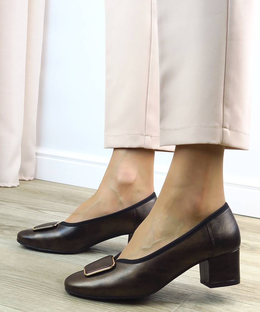 Doprajte si pohodlie a štýl týmito exkluzívnymi lodičkami v modernom hnedom odtieni. Vyrobené z prírodnej kože. Ergonomický tvarovaná vnútorná stielka Vám zaisti maximálnu oporu pre chodidla. Hrubý podpätok zaistí komfortný krok. Veľká ozdobná spona dodáva topánkam exkluzívny vzhľad. Perfektne na každodenné nosenie aj špeciálne príležitosti! Model vhodný na širšie chodidla.