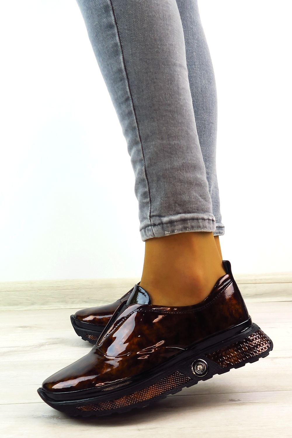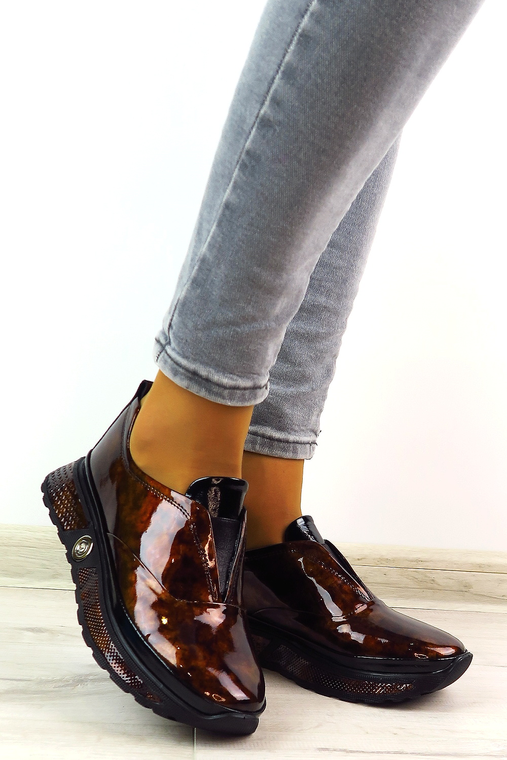 Originálne a odvážne – tieto mokasíny vás nenechajú splynúť s davom. Lesklý lakovaný povrch v unikátnom hnedo-čiernom mramorovanom vzore dodáva obuvi luxusný a extravagantný vzhľad. Vyššia podrážka poskytuje pohodlie pri chôdzi a moderný športovo-elegantný šmrnc. Perfektná voľba pre ženy, ktoré chcú spojiť pohodlie, kvalitu a výrazný štýl v jednej obuvi.