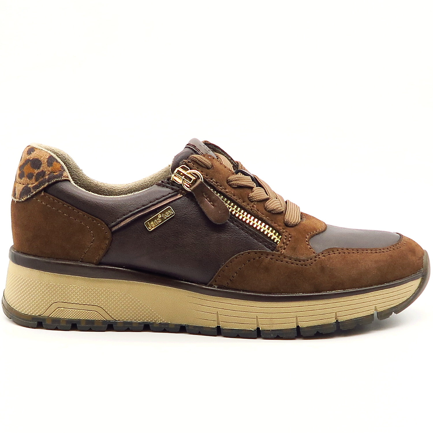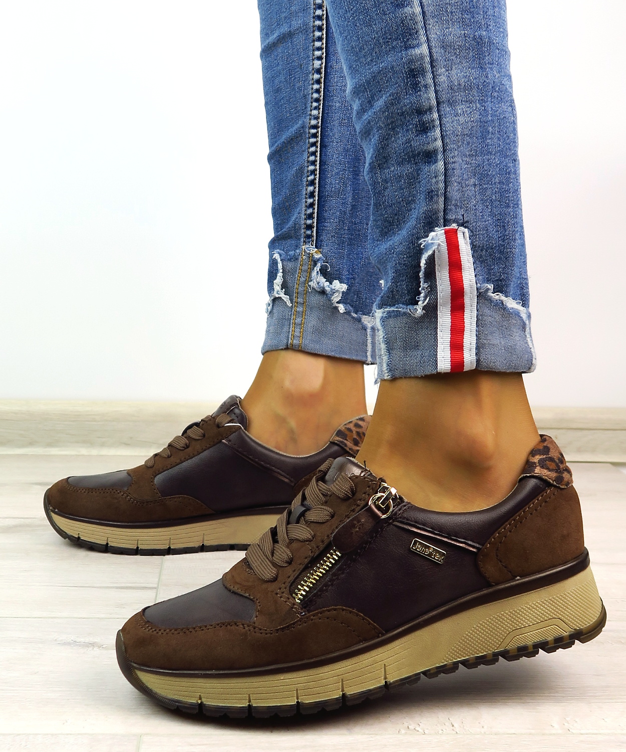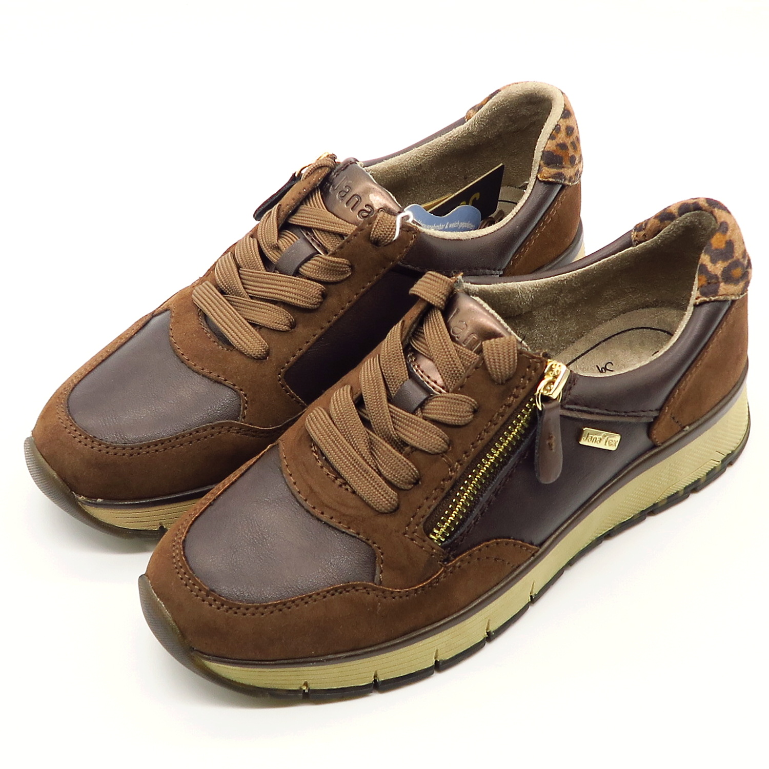 Dámske sneakersy od nemeckej značky JANA. Topánky v krásnej hnedej farbe so zvieracím motívom na päte.. Zvršok vyrobený z ekologickej kože. Na bočnej strane všitý zips, ktorý uľahčí obúvanie a zároveň je aj pekným doplnkom. Komfortný model na každodenné nosenie. Výhodou je ich mäkká pamäťová stielka SOFT LINE. TEX membrána Vám zaisti pocit sucha. Topánky vhodné na širšie chodidlo (kopyto H).