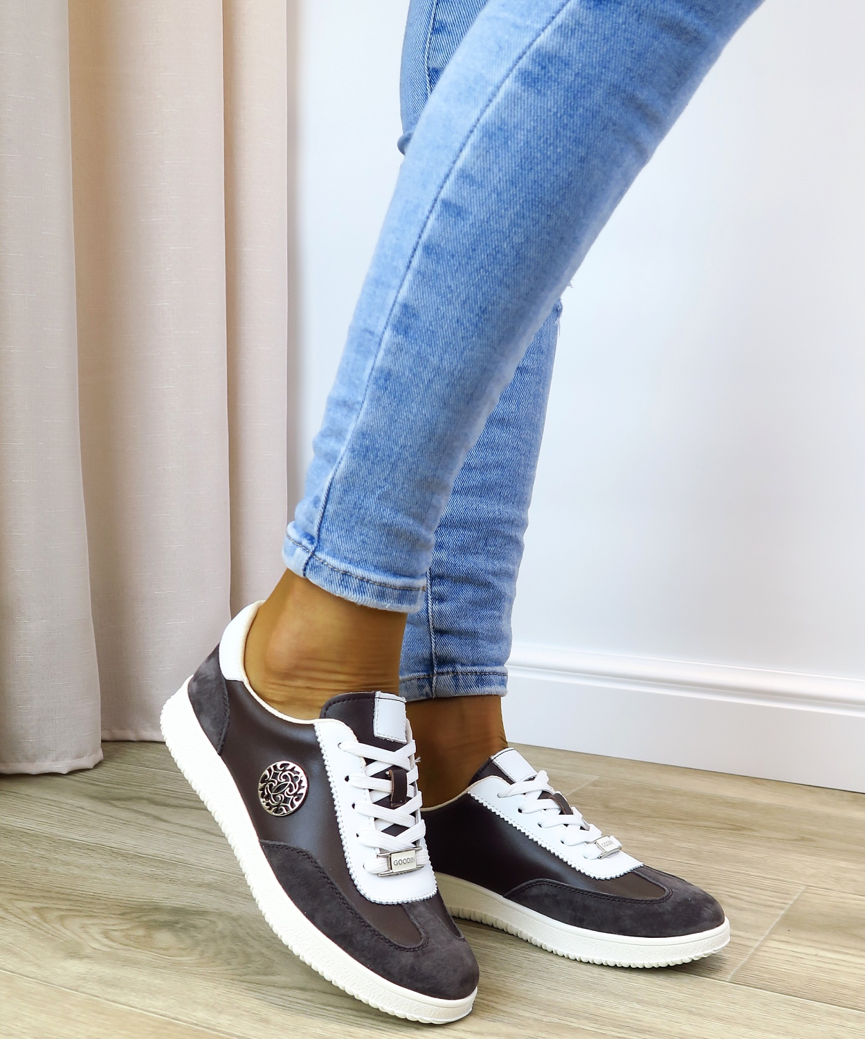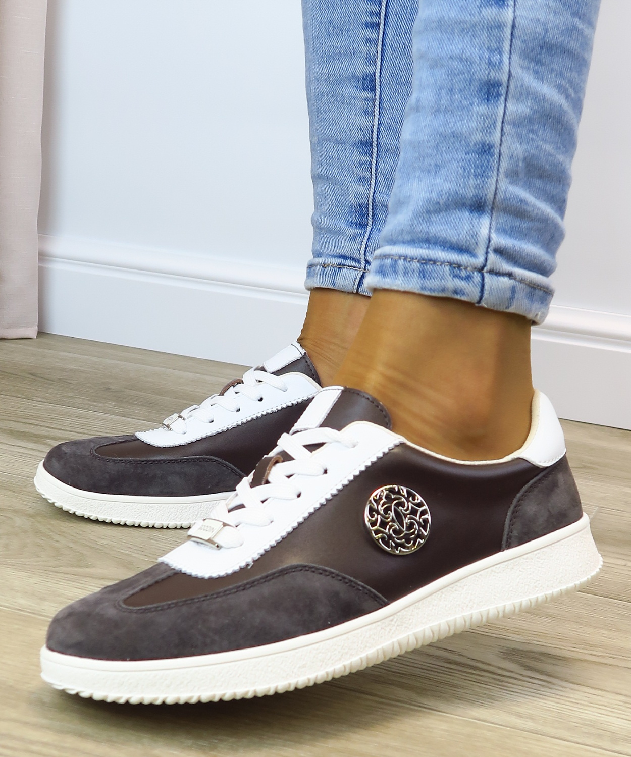Štýlové dámske tenisky z kvalitnej pravej kože v nadčasovej hnedej farbe. Kombinácia hladkej a jemne brúsenej kože spolu s bielymi detailmi pôsobí štýlovo a veľmi vkusne. Ozdobný kovový prvok na boku dodáva topánkam ženský a sofistikovaný akcent. Pohodlná mäkká stielka a flexibilná podrážka zabezpečujú komfort pri celodennom nosení. Tenisky sú ideálnou voľbou na bežné dni, do práce aj na voľný čas a ľahko sa kombinujú s rôznymi outfitmi.