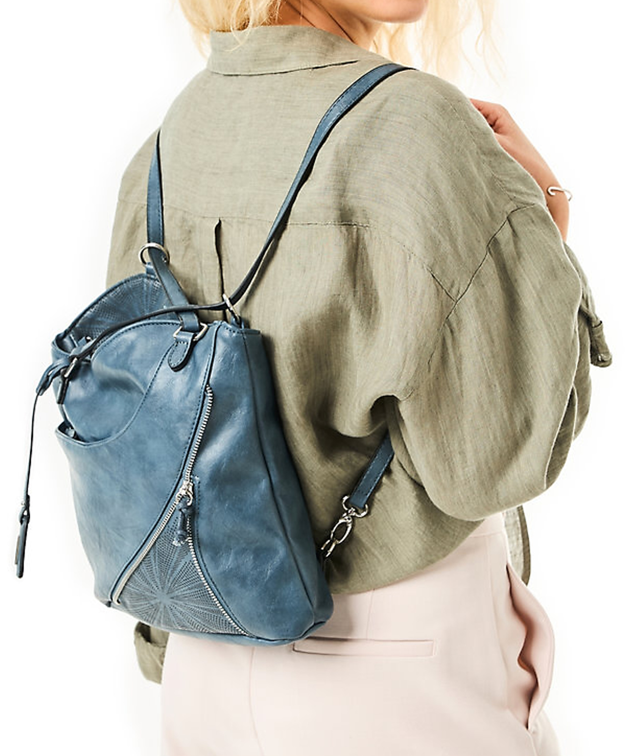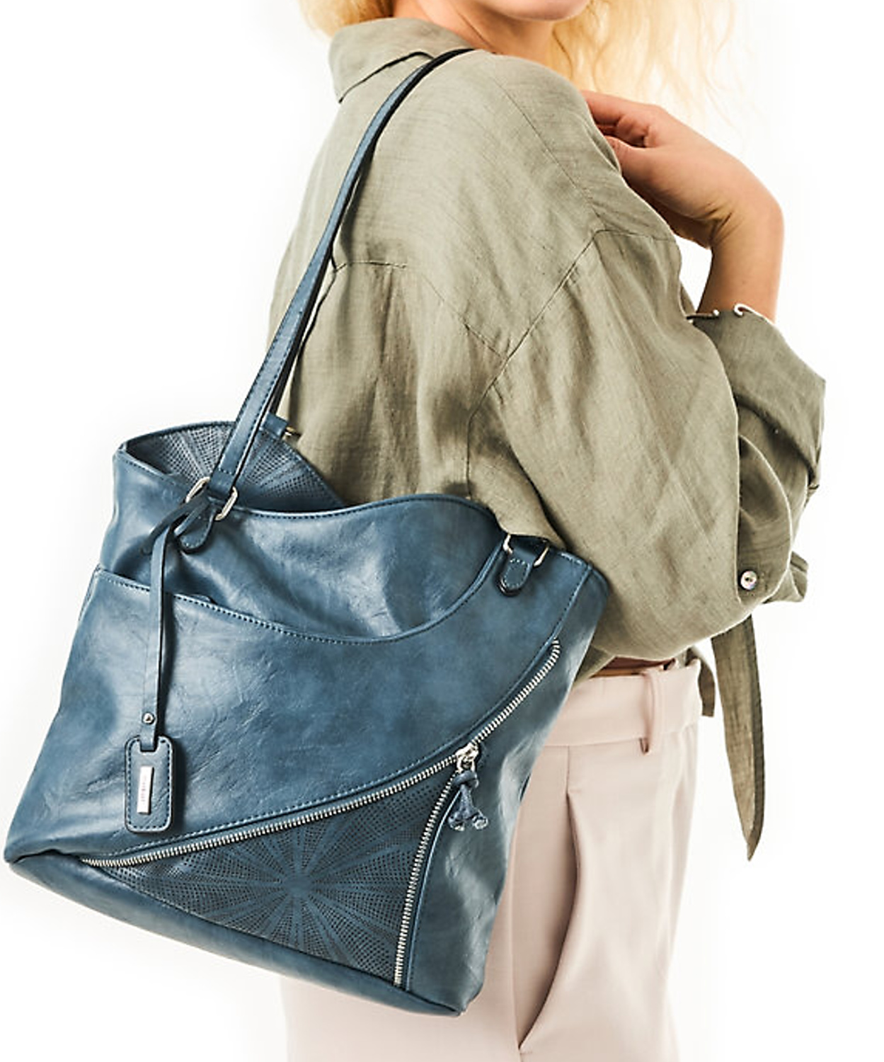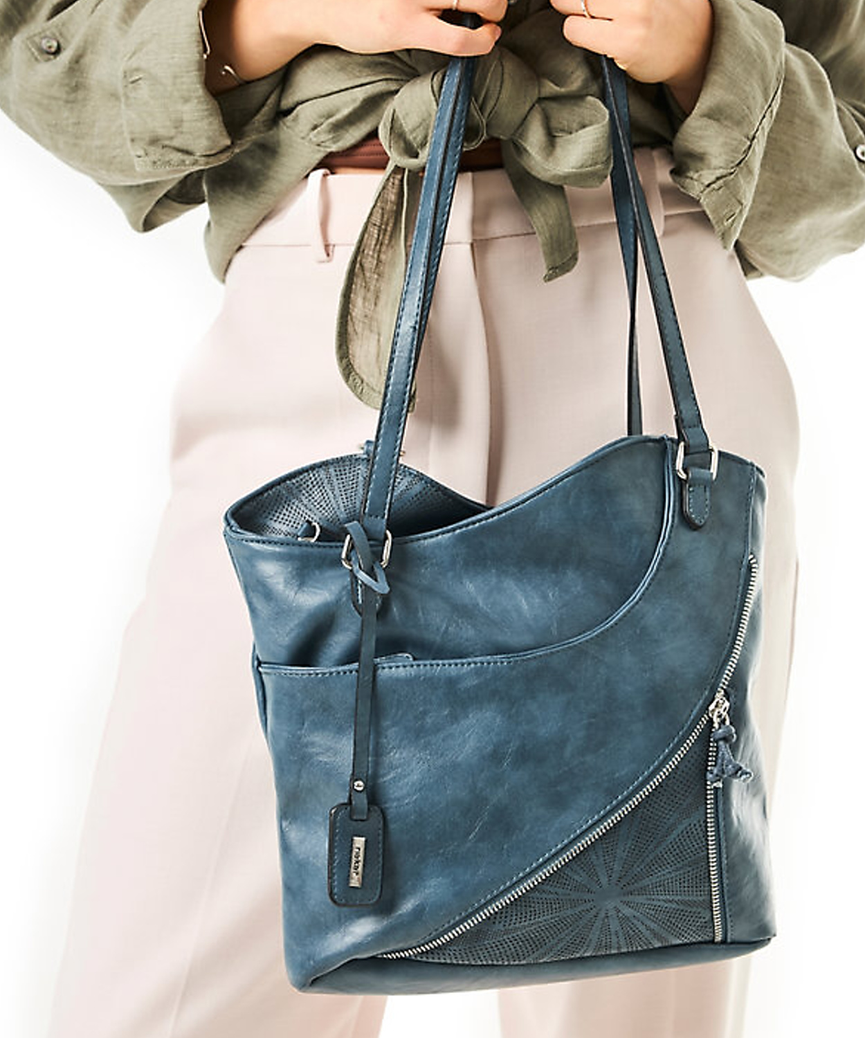 Kvalitná kabelka nemeckej značky RIEKER. Model v modrej farbe. Zvršok vyrobený z ekologickej kože. Kabelka je vybavená dvoma dlhšími popruhmi, vďaka čomu ju môžete pohodlne nosiť cez rameno alebo zvoliť variantu batohu.