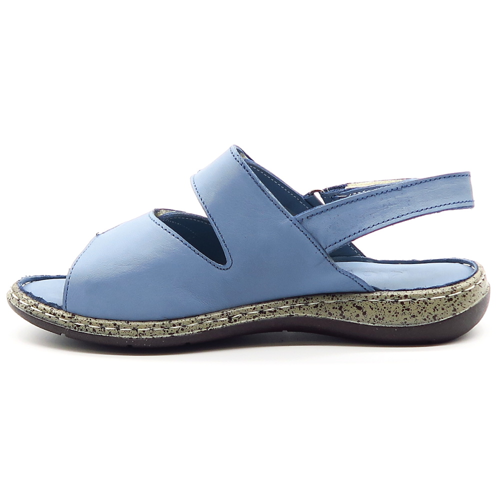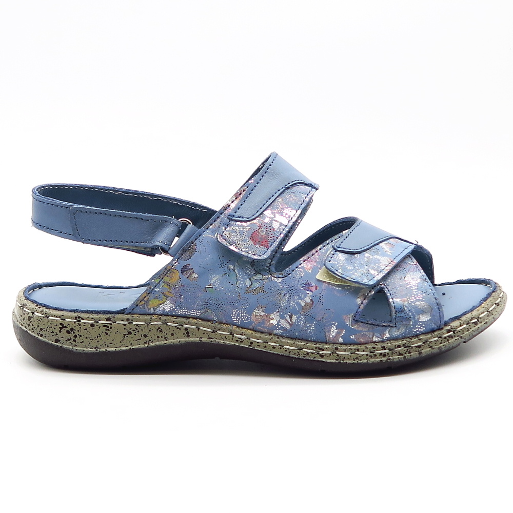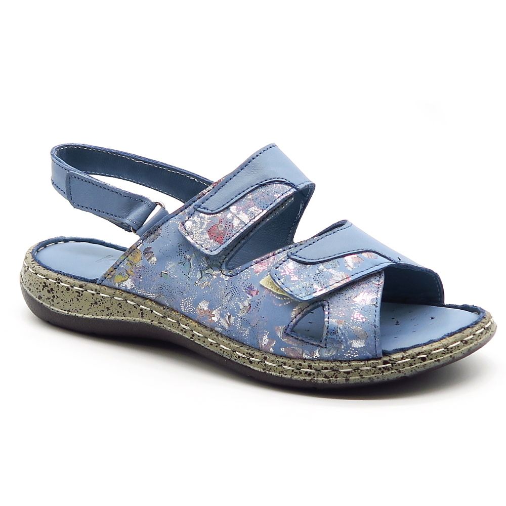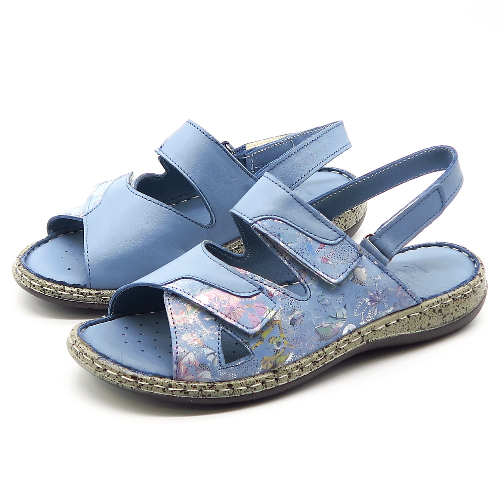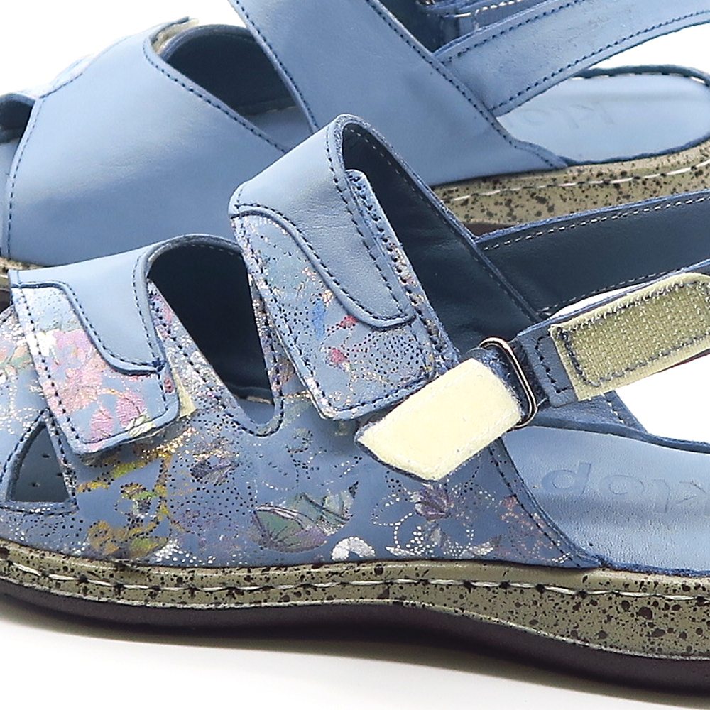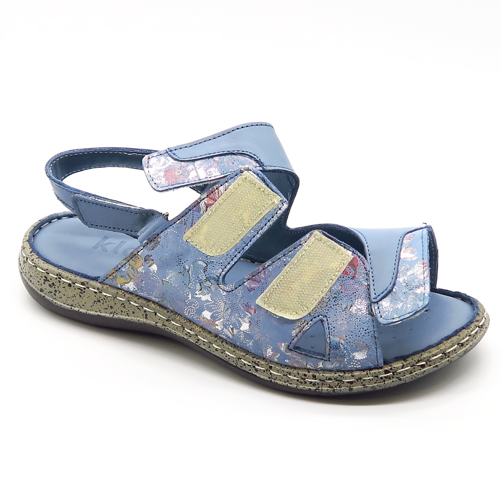 Dámske pohodlné sandále značky KLOP. Modrá farba s jemným vzorom dodáva sandálom štýlový vzhľad, ktorý sa ľahko kombinuje s rôznymi outfitmi. Vďaka praktickému zapínaniu na suchý zips sa sandále ľahko prispôsobia chodidlu a umožňujú rýchle a pohodlné obúvanie. Mäkká, kožená tvarovaná stielka poskytuje maximálny komfort a príjemný pocit aj pri dlhšom nosení. Sandále vhodné aj na širšie chodidlá.