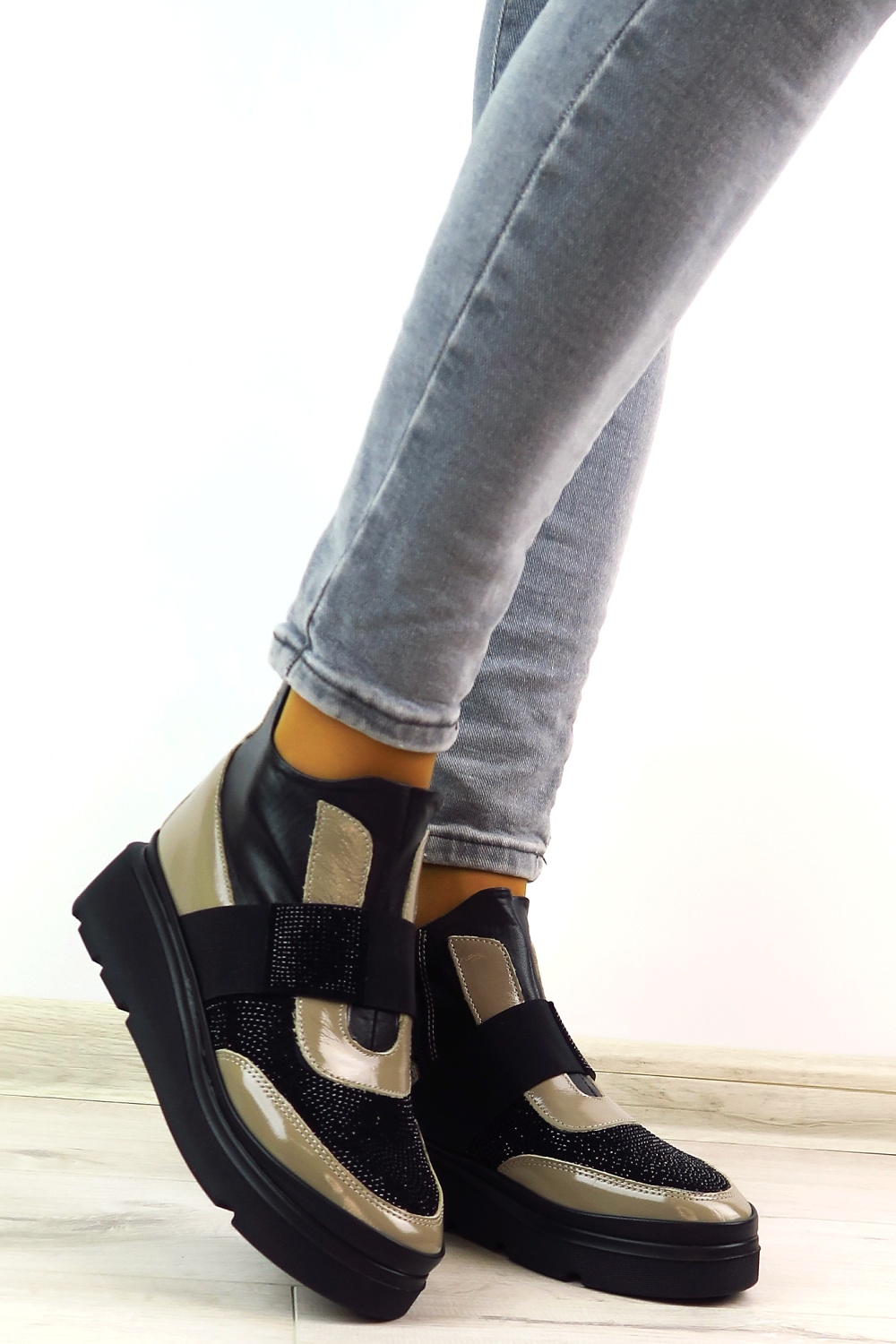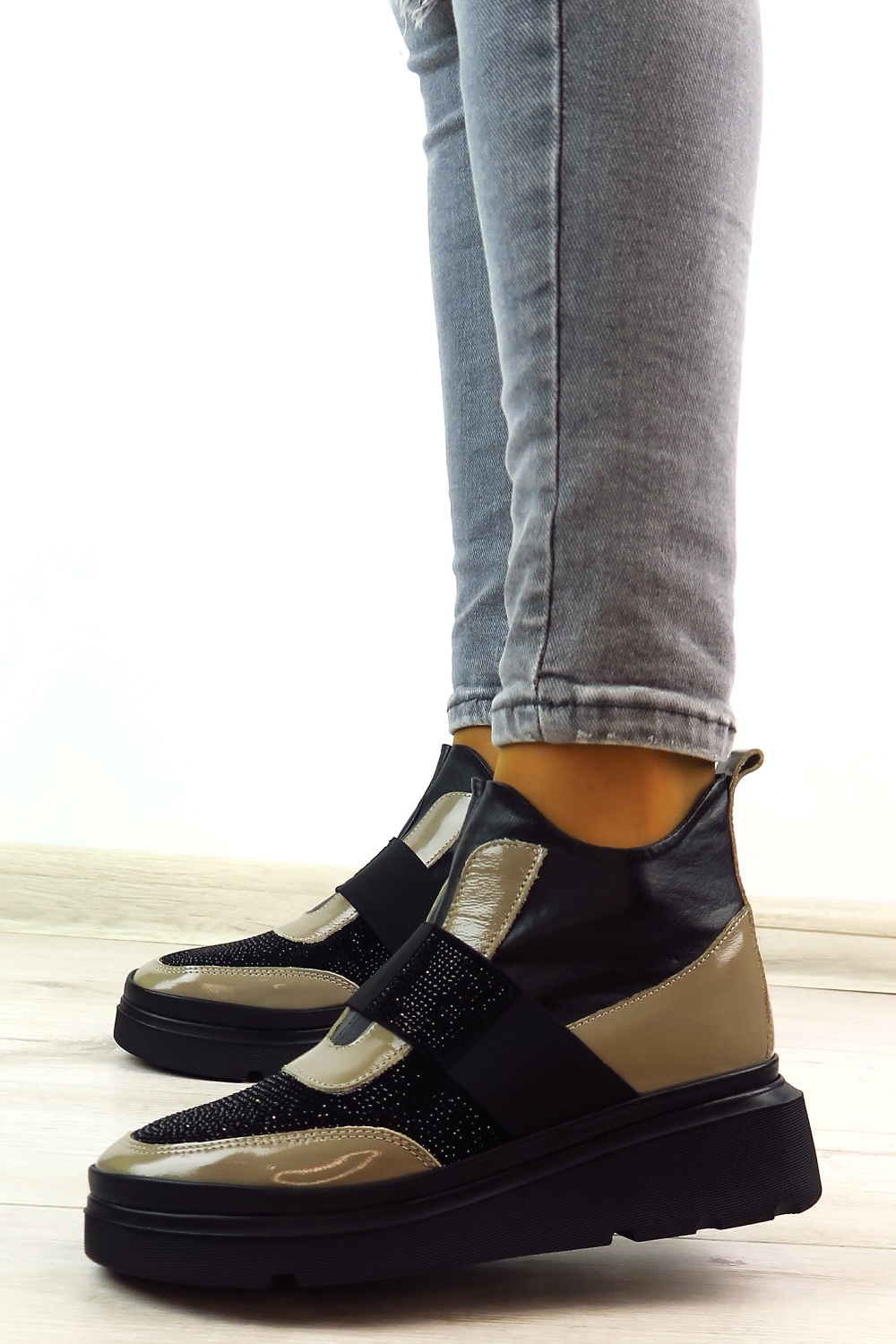 Členkové topánky od značky BOMBONELLA. Zvršok vyrobený z kombinácie hladkej čiernej kože a béžových lakovaných detailov, ktoré dodávajú obuvi elegantný kontrast. Predná časť je zdobená drobnými trblietavými kamienkami. Pružný elastický pás cez priehlavok nielen uľahčuje obúvanie, ale aj zabezpečuje stabilné držanie chodidla počas celého dňa. Vysoká podrážka poskytuje komfort pri chôdzi.