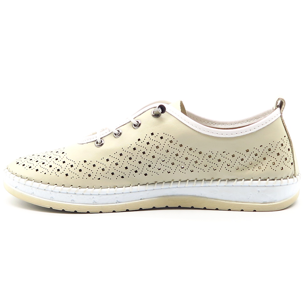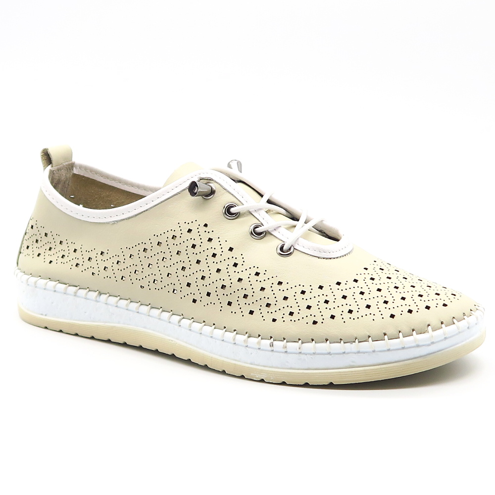 Dámske poltopánky od značky KLOP. Model v béžovej farbe. Celokožený kúsok, ktorá je ľahký, priedušný a ideálny na pohodlné nosenie. Zvršok má jemné perforácie, ktoré zabezpečujú priedušnosť. Pružná podrážka poskytuje výbornú flexibilitu a tlmenie nárazov pri chôdzi. Šnúrky sú pružné , vďaka čomu sa budú ľahšie obúvať. Vnútorná tvarovateľná stielka zaistí maximálny komfort a podporu chodidla.