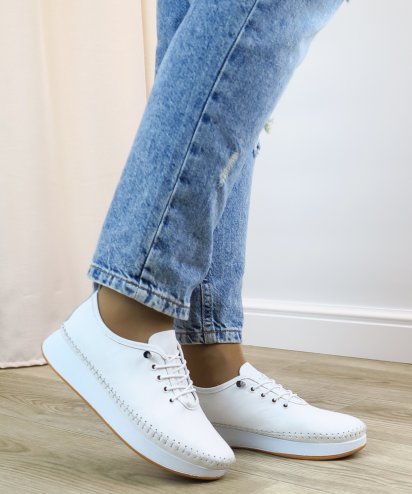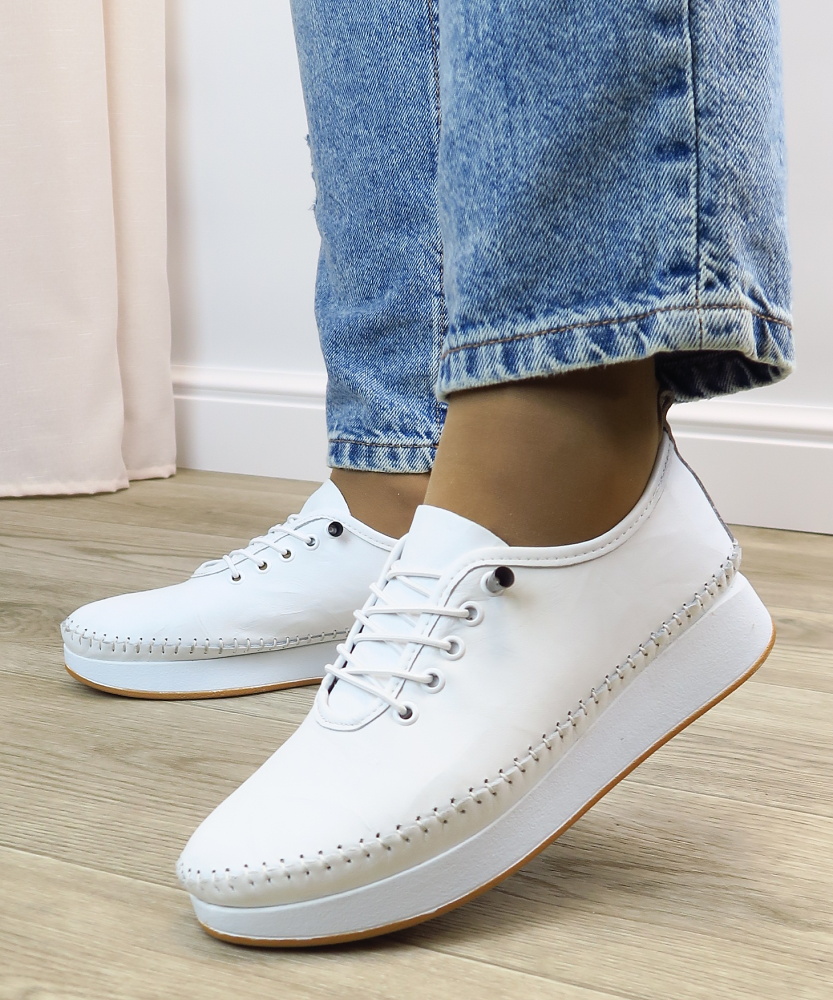 Dámske poltopánky značky KLOP. Štýlová biela kožená teniska s hrubšou podrážkou a detailným ručným prešívaním po obvode. Má elegantný jemne pokrčený povrch, ktorý dodáva jedinečný vzhľad. Hrubšia podrážka poskytuje lepšie odpruženie a komfort pri chôdzi. Veľkou výhodou je pružné šnurovanie, ktoré uľahči obúvanie. Táto topánka je ideálna pre tých, ktorí hľadajú štýl, kvalitu a funkčnosť v jednom.
