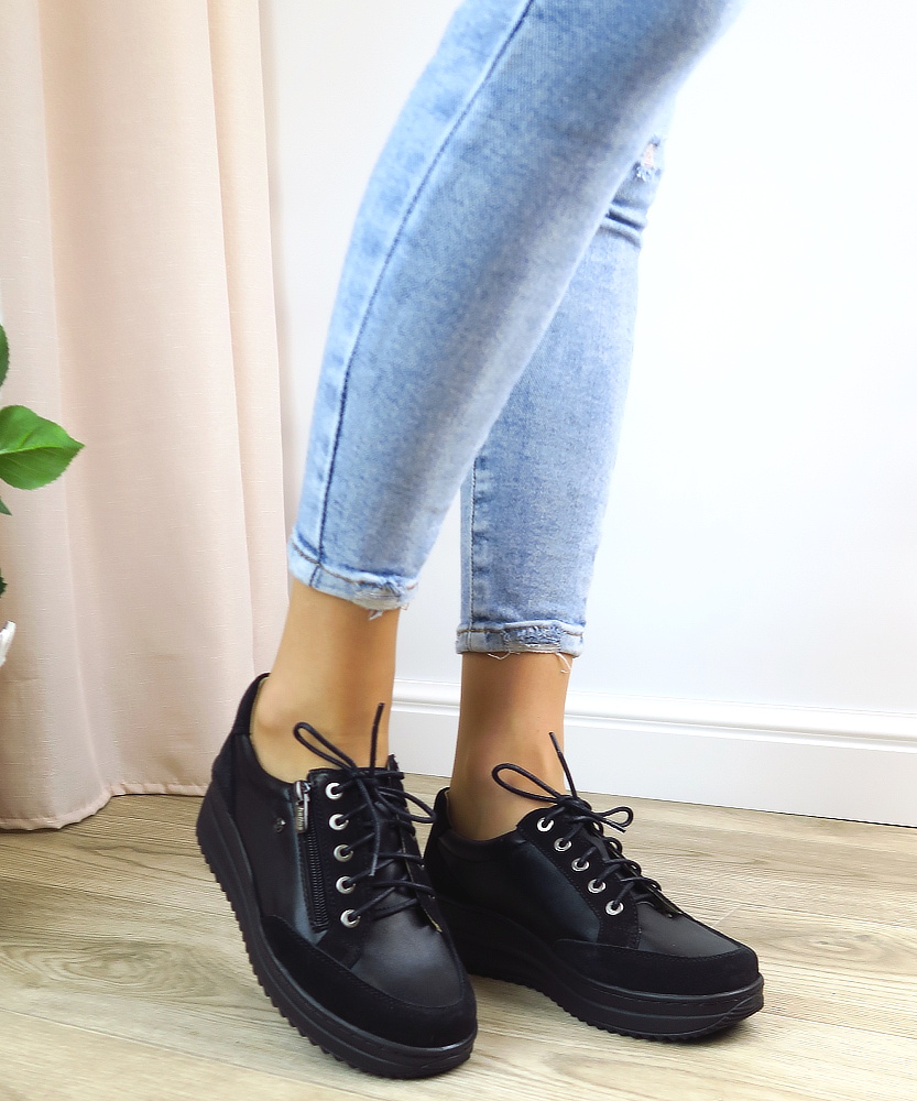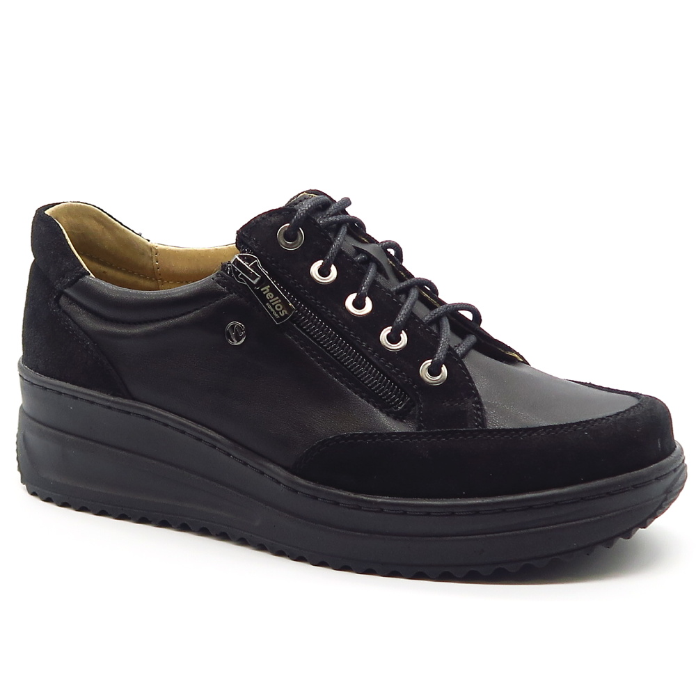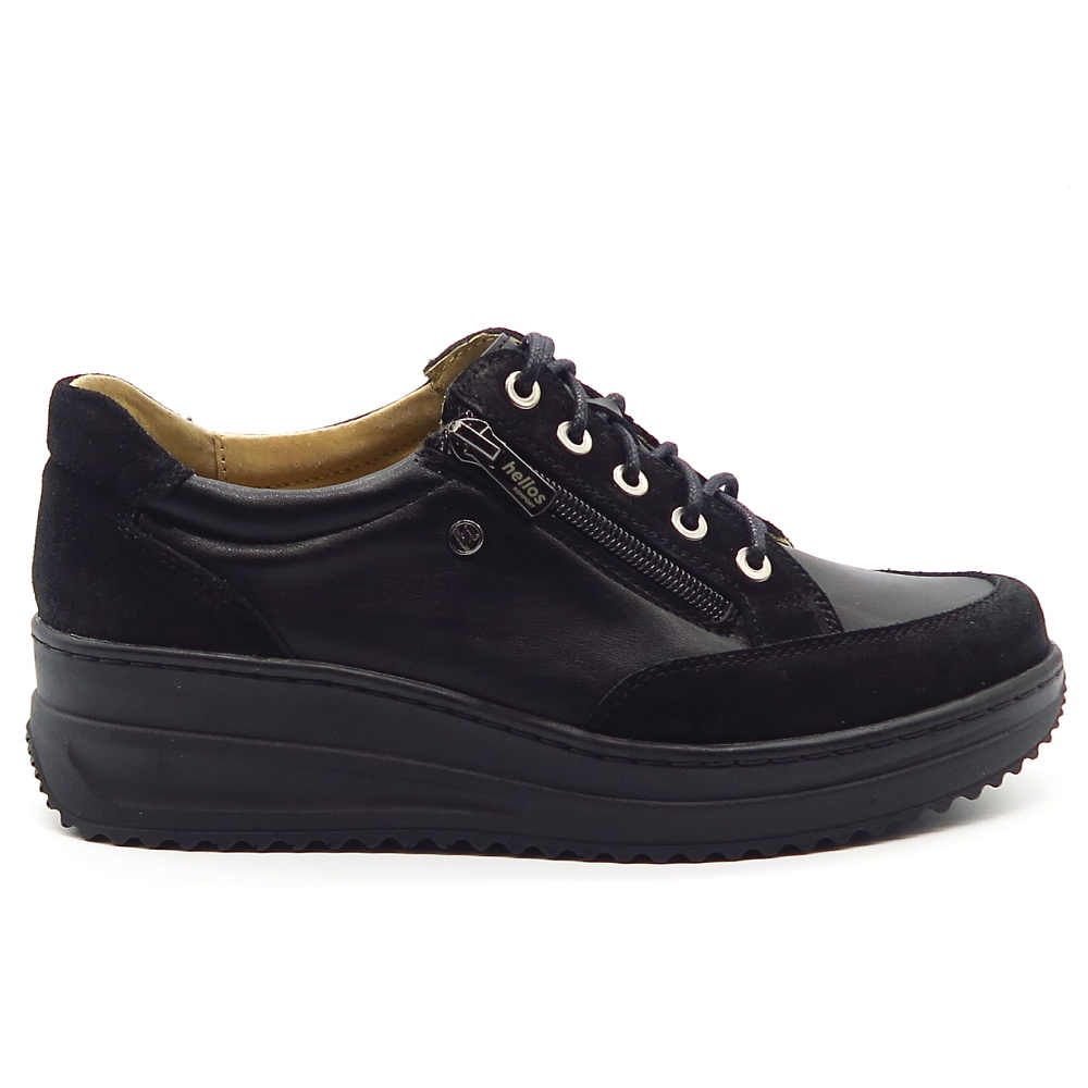 Dámske poltopánky od značky HELIOS. Model v čiernej farbe. Zvršok tvorí prírodná koža. Topánky sú vhodné aj na širšie chodidlá. Veľkou výhodou je ich kožená vnútorná stielka, ktorá je tvarovateľná a veľmi mäkká. Zapínanie šnurovanie, ale aj bočný zips.