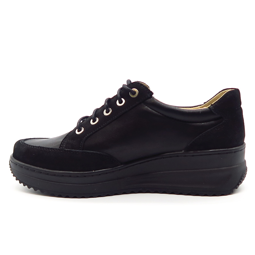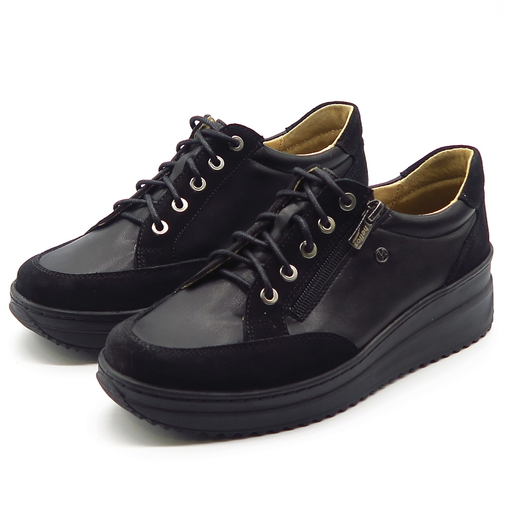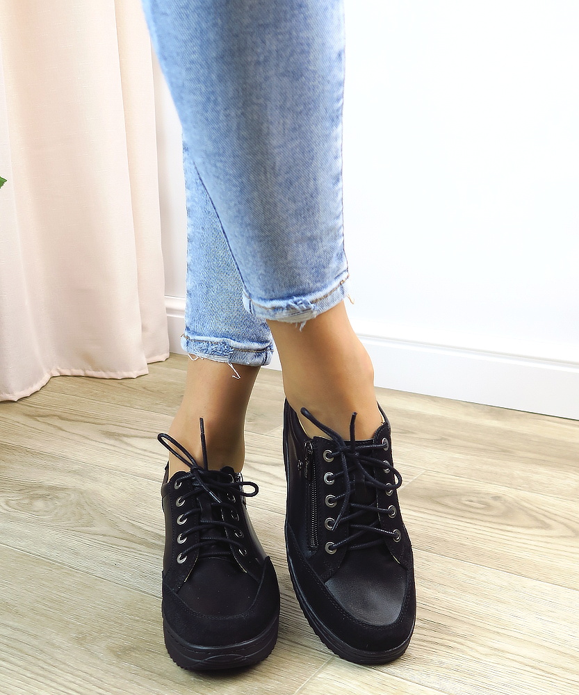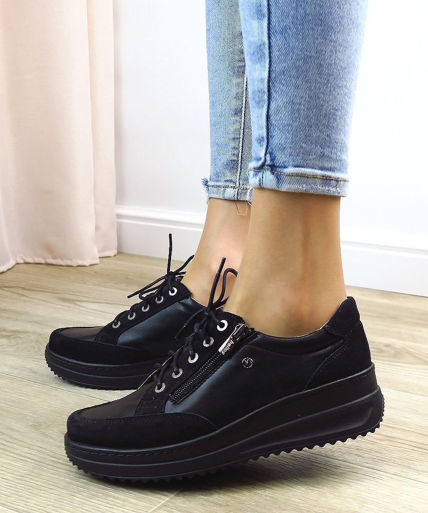 Dámske poltopánky od značky HELIOS. Model v čiernej farbe. Zvršok tvorí prírodná koža. Topánky sú vhodné aj na širšie chodidlá. Veľkou výhodou je ich kožená vnútorná stielka, ktorá je tvarovateľná a veľmi mäkká. Zapínanie šnurovanie, ale aj bočný zips.