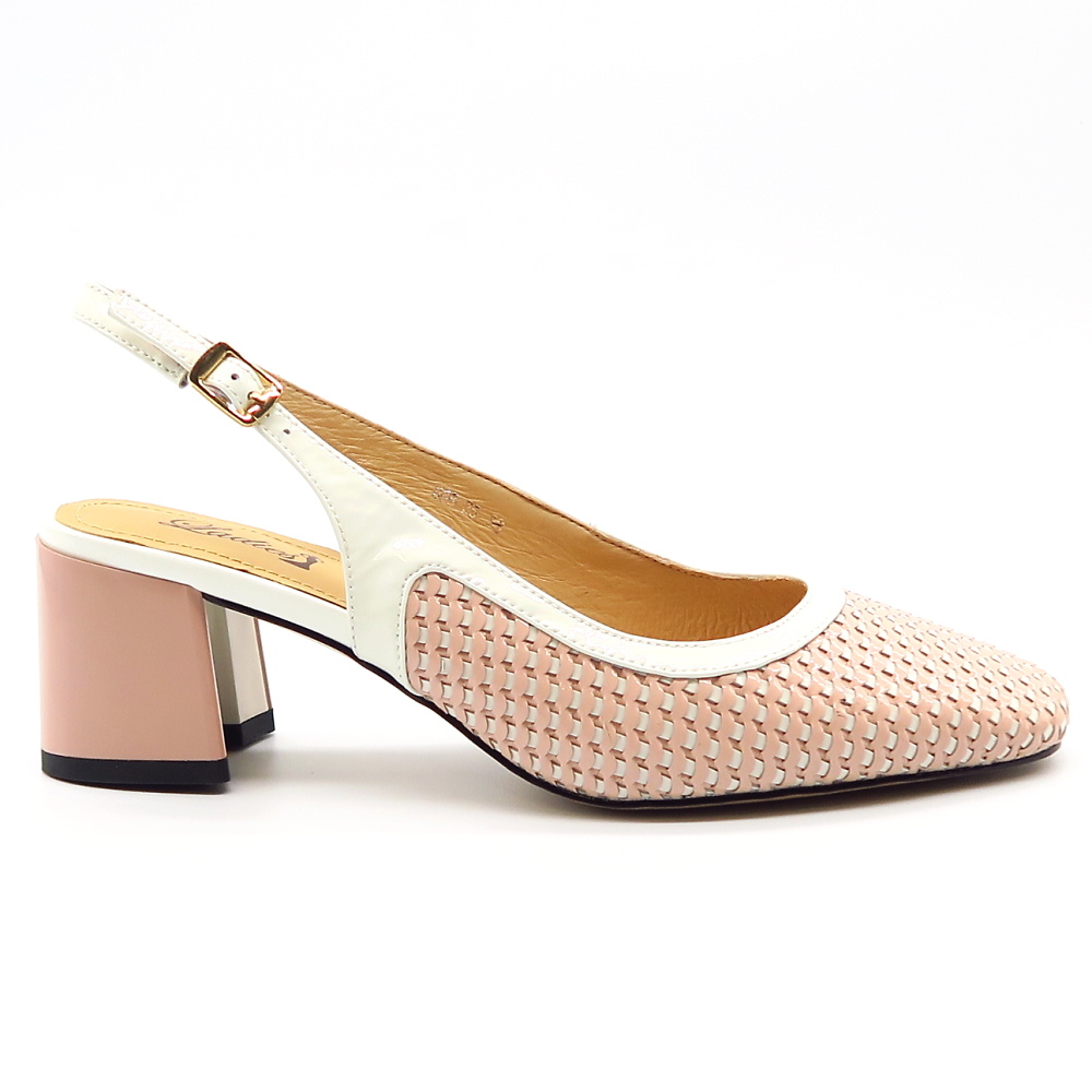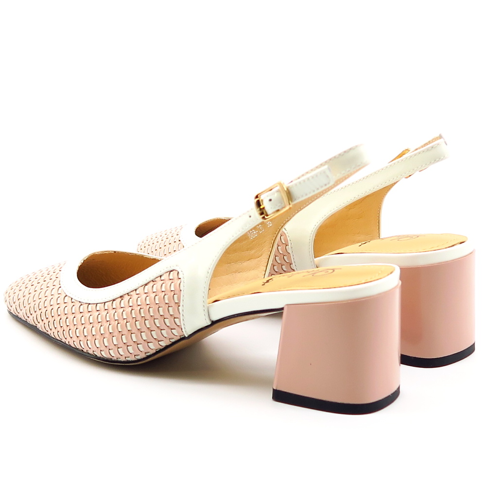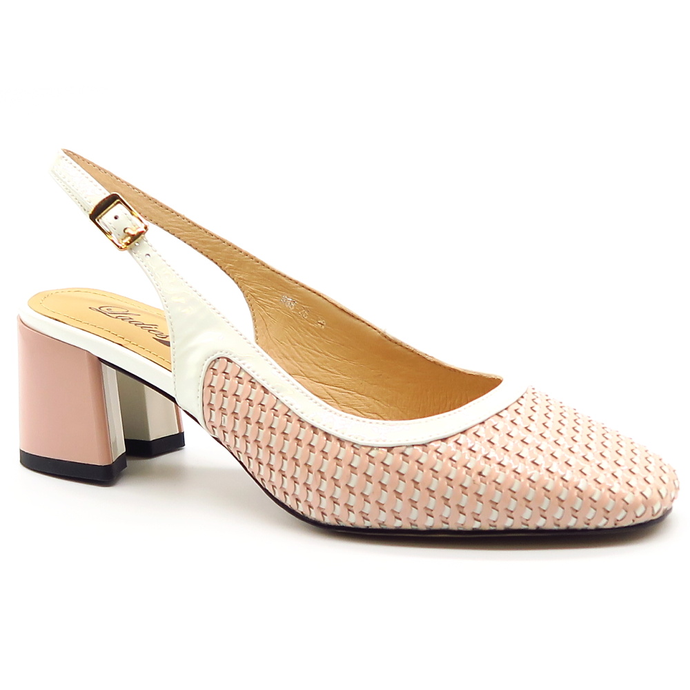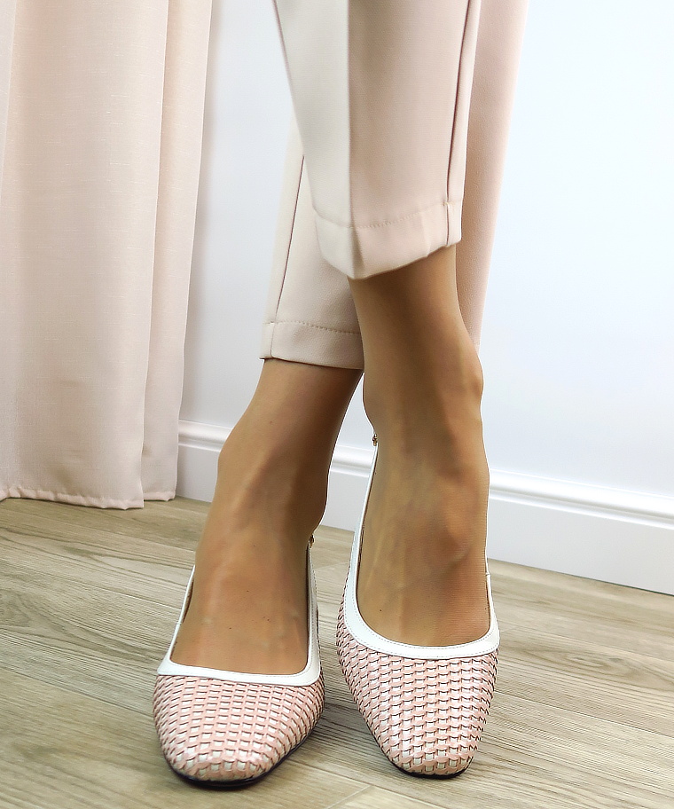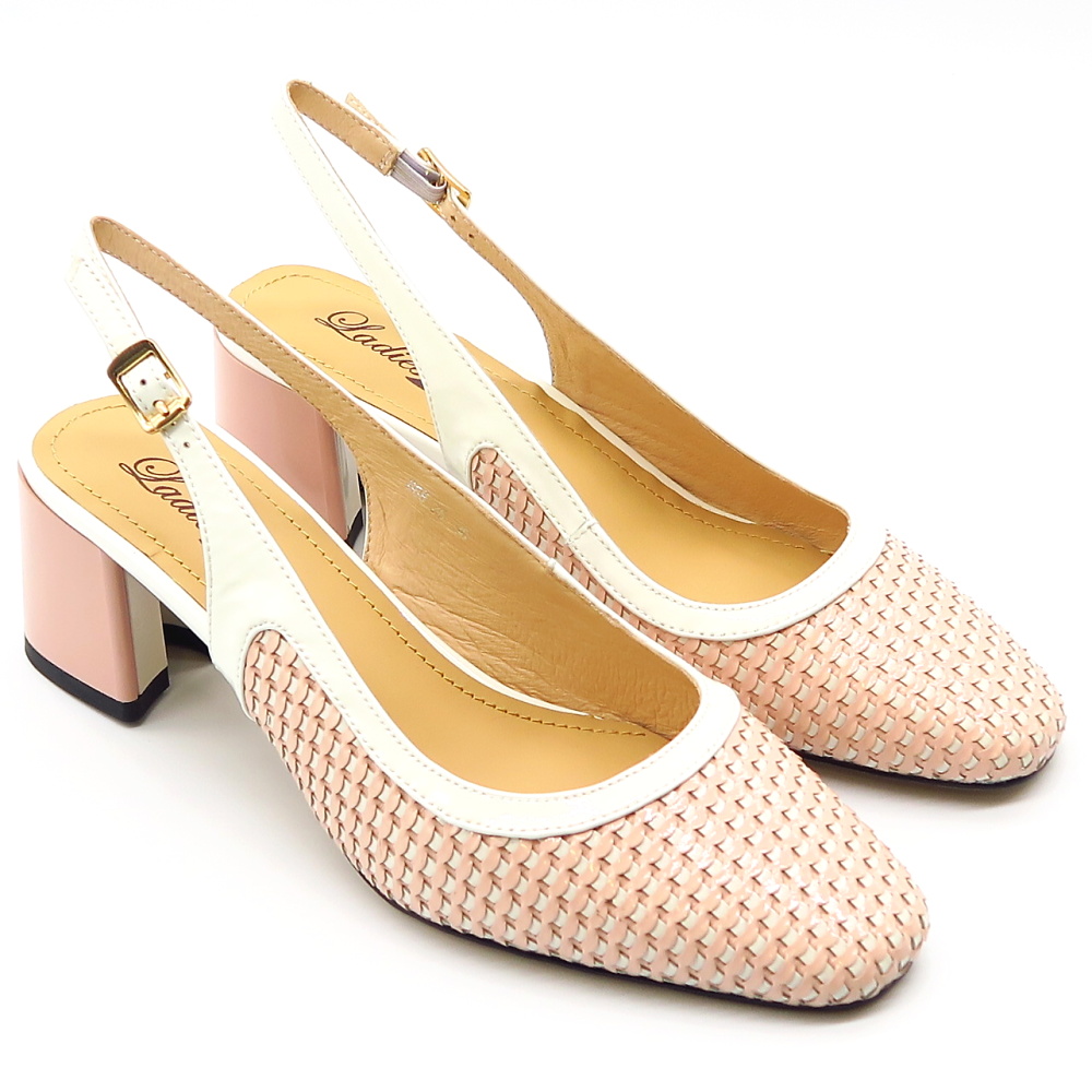 Štýlové dámske sandále značky LADIES. Tento model zaujme na prvý pohľad prepracovaným pleteným vzorom v nežnej ružovej farbe, doplneným o kontrastné biele detaily. Uzavretá špička poskytuje komfort a stabilitu, zatiaľ čo otvorená päta s nastaviteľným ramienkom zabezpečí dokonalé prispôsobenie chodidlu. Kožené sandále, ktoré spájajú jemnosť s moderným dizajnom. Stredne vysoký, stabilný podpätok zaručuje pohodlie aj pri celodennom nosení.