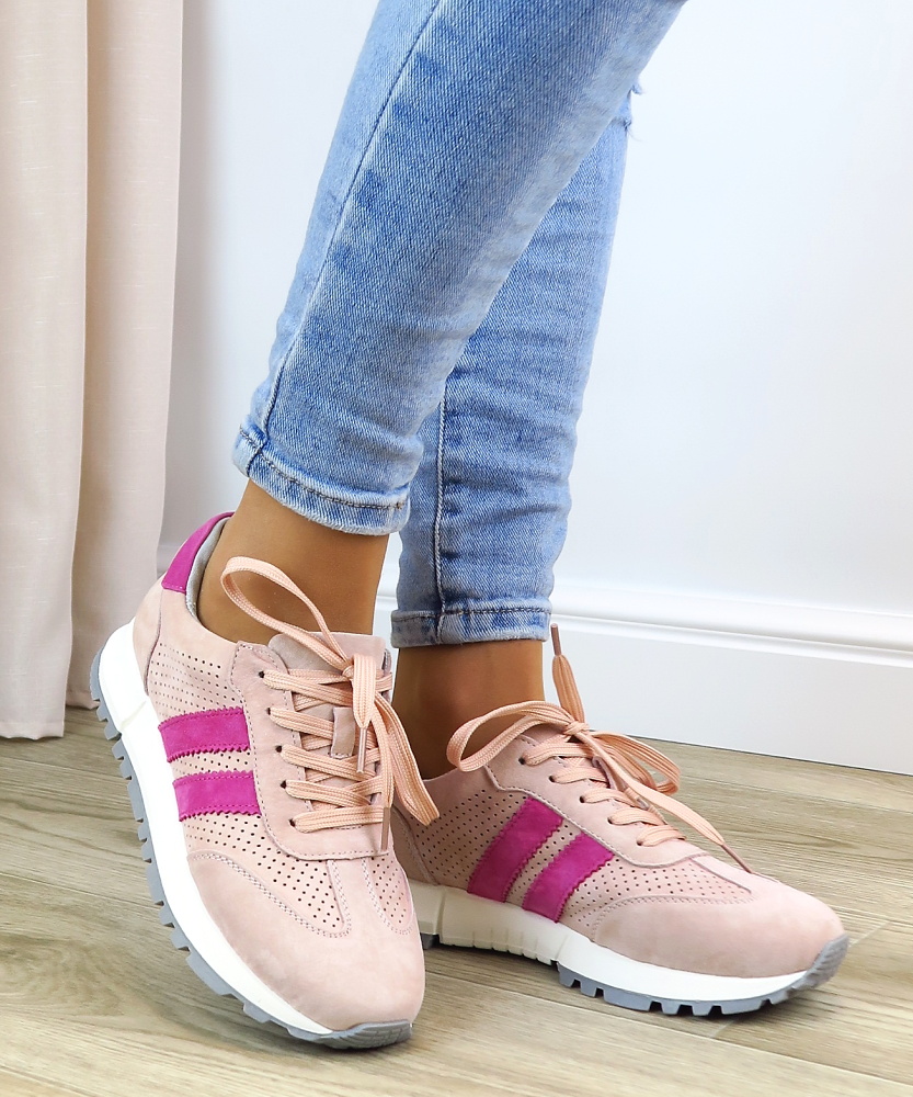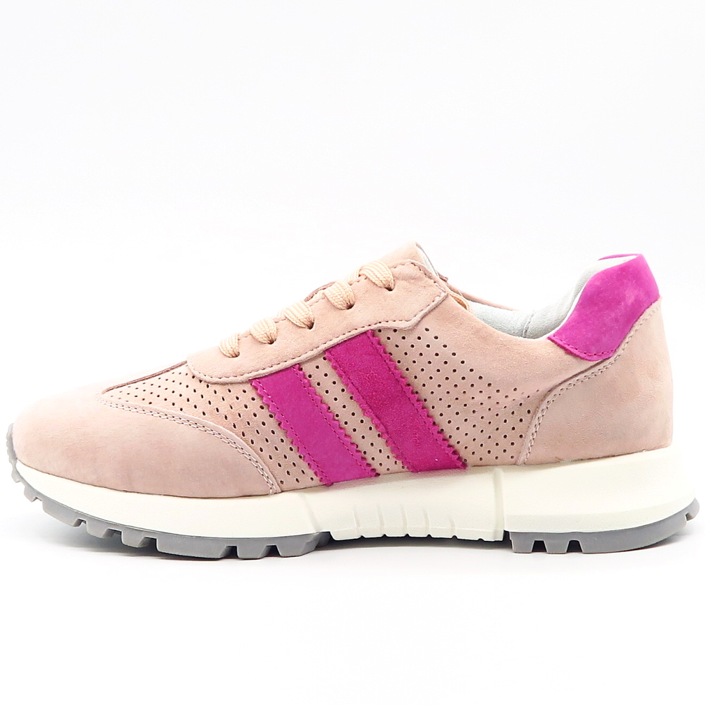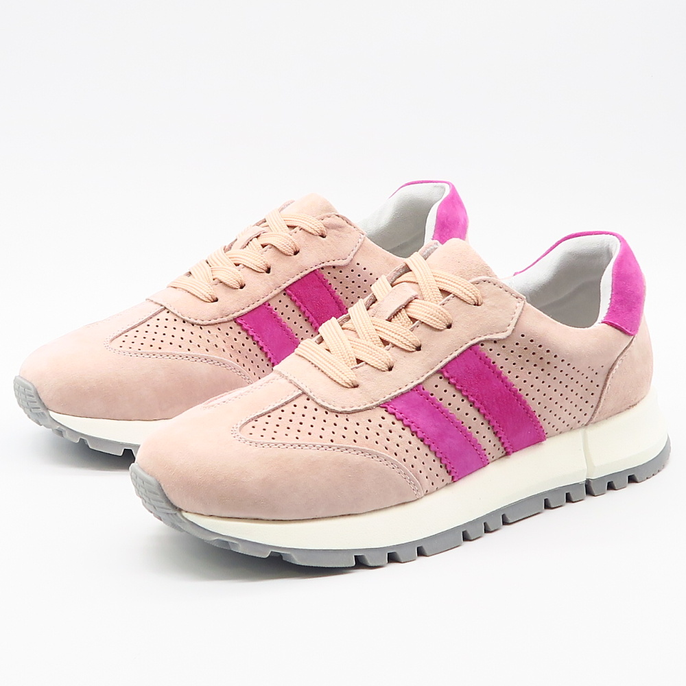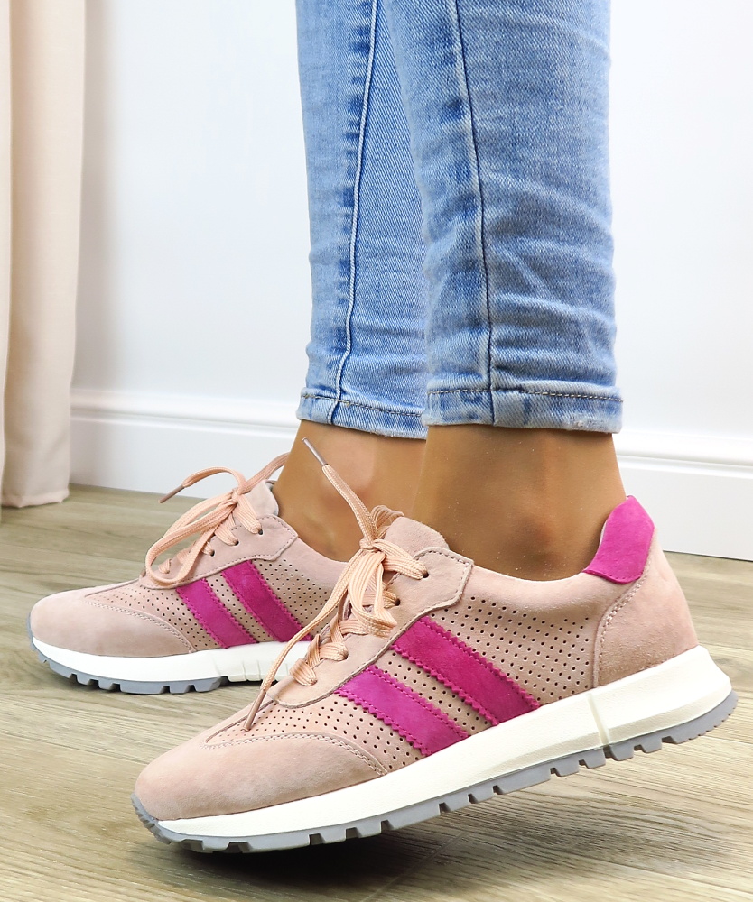 Dámske kožené tenisky v jemných pastelových tónoch, ktoré spájajú pohodlie a moderný športový dizajn. Zvršok z kvalitnej pravej kože je doplnený perforáciou po bokoch, vďaka čomu sú tenisky priedušné a vhodné aj na celodenné nosenie. Ružové kontrastné prvky dodávajú modelu ženský a svieži vzhľad. Mäkká vnútorná stielka zaručuje vysoký komfort pri chôdzi, zatiaľ čo stabilná a flexibilná podrážka zabezpečuje dobrú priľnavosť.