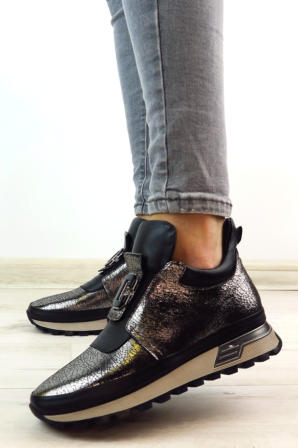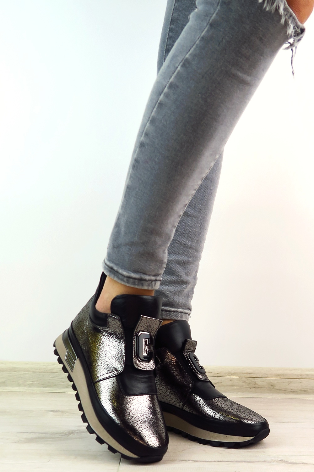 Moderné členkové topánky značky BOMBONELLA. Zvršok vyrobený z prírodnej kože. Moderné a neprehliadnuteľné, a to vďaka metalickej farbe so štruktúrovaným efektom v kombinácii s čiernymi detailmi , ktorý dodáva obuvi luxusný a športovo-elegantný vzhľad. Pohodlná vysoká podrážka zaručuje stabilitu a komfort pri každom kroku. Ideálne pre ženy, ktoré chcú spojiť komfort tenisiek s eleganciou a extravagantným vzhľadom.