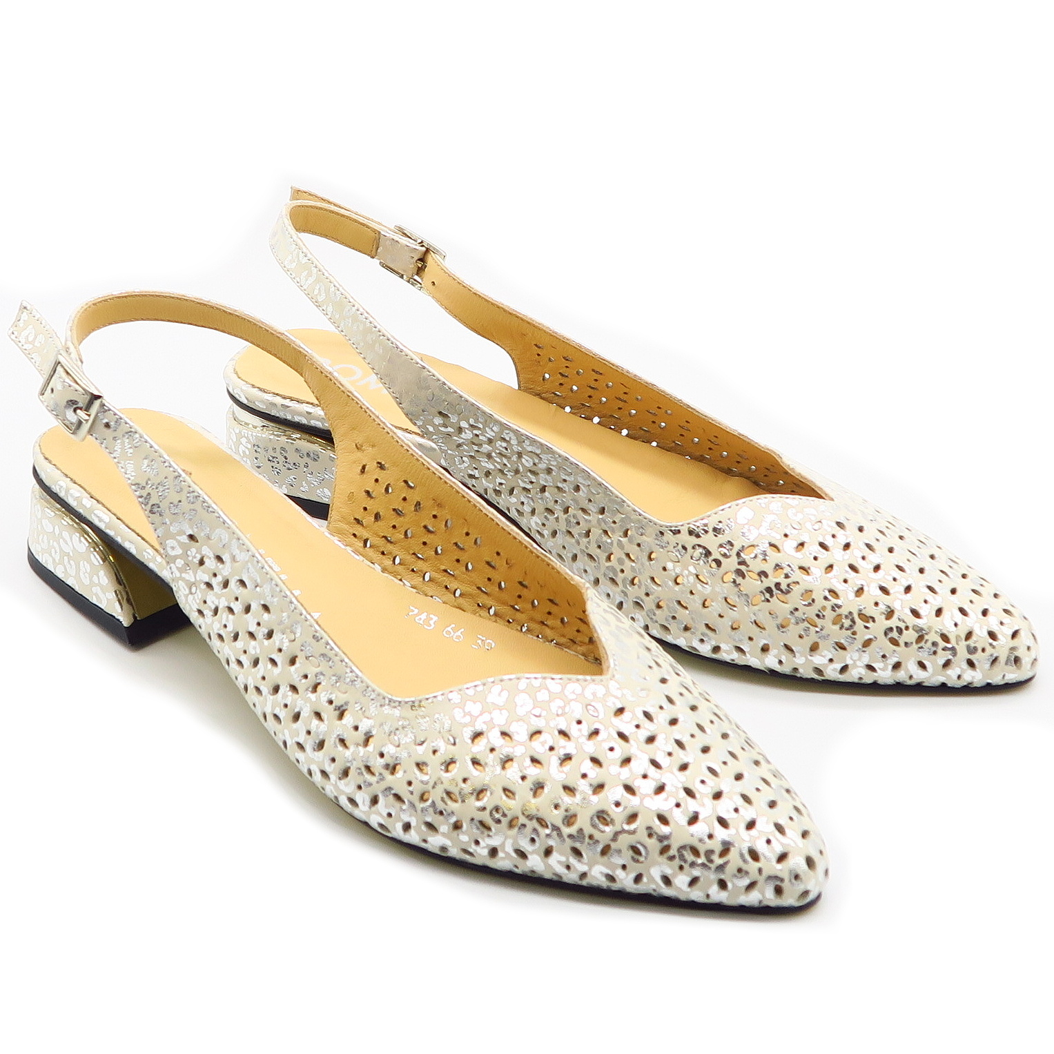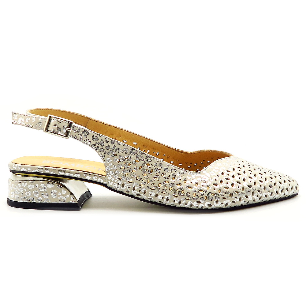 Elegantné sandále s otvorenou pätou sú dokonalým spojením štýlu a pohodlia. Majú perforovaný zvršok, čo im dodáva nielen elegantný vzhľad, ale aj výbornú priedušnosť. Jemný strieborný vzor v kombinácii s otvorenou pätou zaručuje pohodlie aj počas teplých dní. Stabilný, hrubší podpätok zabezpečuje komfort pri chôdzi, zatiaľ čo mäkká stielka ponúka príjemný pocit po celý deň. Vďaka svojmu dizajnu sú ideálne na formálne aj neformálne príležitosti.