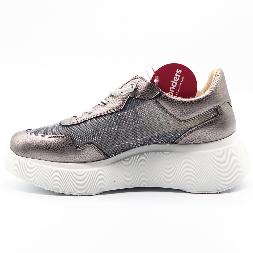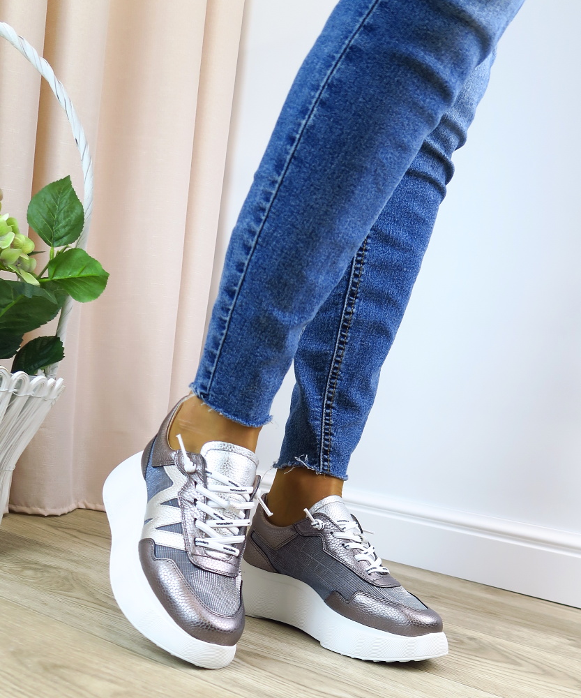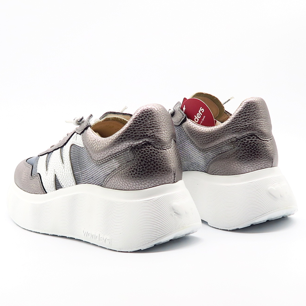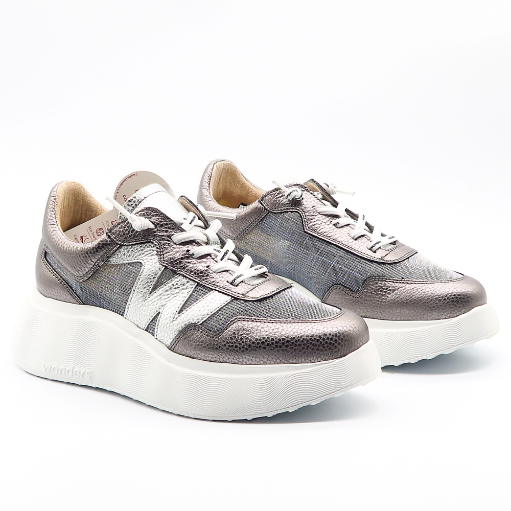 Štýlové strieborné sneakersy od značky WONDERS, ktoré spájajú moderný dizajn s maximálnym komfortom. Jemný metalický odtieň dodáva topánkam elegantný nádych, zatiaľ čo športová silueta a výrazná platformová podrážka vytvárajú trendy mestský look. Kombinácia kvalitnej kože a textilu zabezpečuje pohodlie počas celého dňa, priedušnosť a príjemné nosenie. Elastické šnúrky uľahčujú obúvanie a perfektne sa prispôsobia chodidlu. Mäkká pamäťová stielka zaistí komfortný krok.