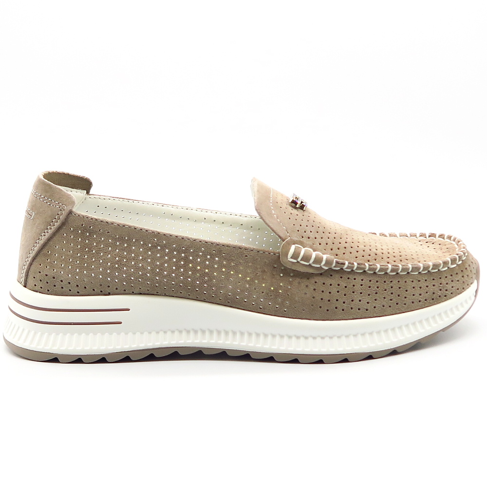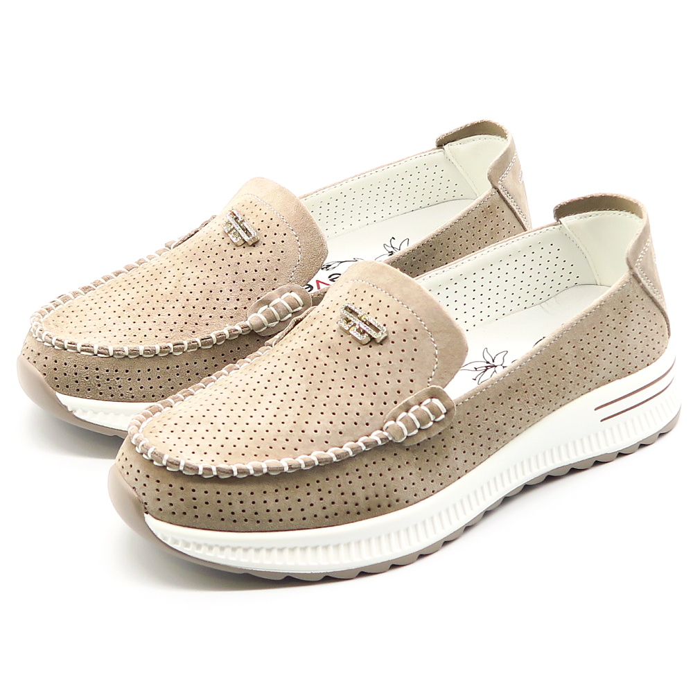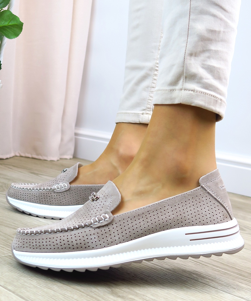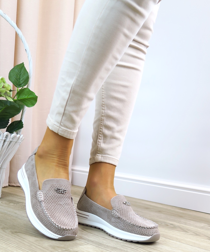 Táto elegantná béžová dámska mokasína je ideálnou voľbou pre tých, ktorí hľadajú pohodlie aj štýl. Topánka je vyrobená z perforovanej kože, čo zabezpečuje dobrú priedušnosť a komfort počas celodenného nosenia. Dekoratívne prešívanie dodáva modelu sofistikovaný vzhľad. Na priehlavku sa nachádza štrasová ozdoba, ktorá pridáva topánke luxusný nádych. Mierne vyvýšená podrážka zabezpečuje stabilitu a pohodlnú chôdzu.
