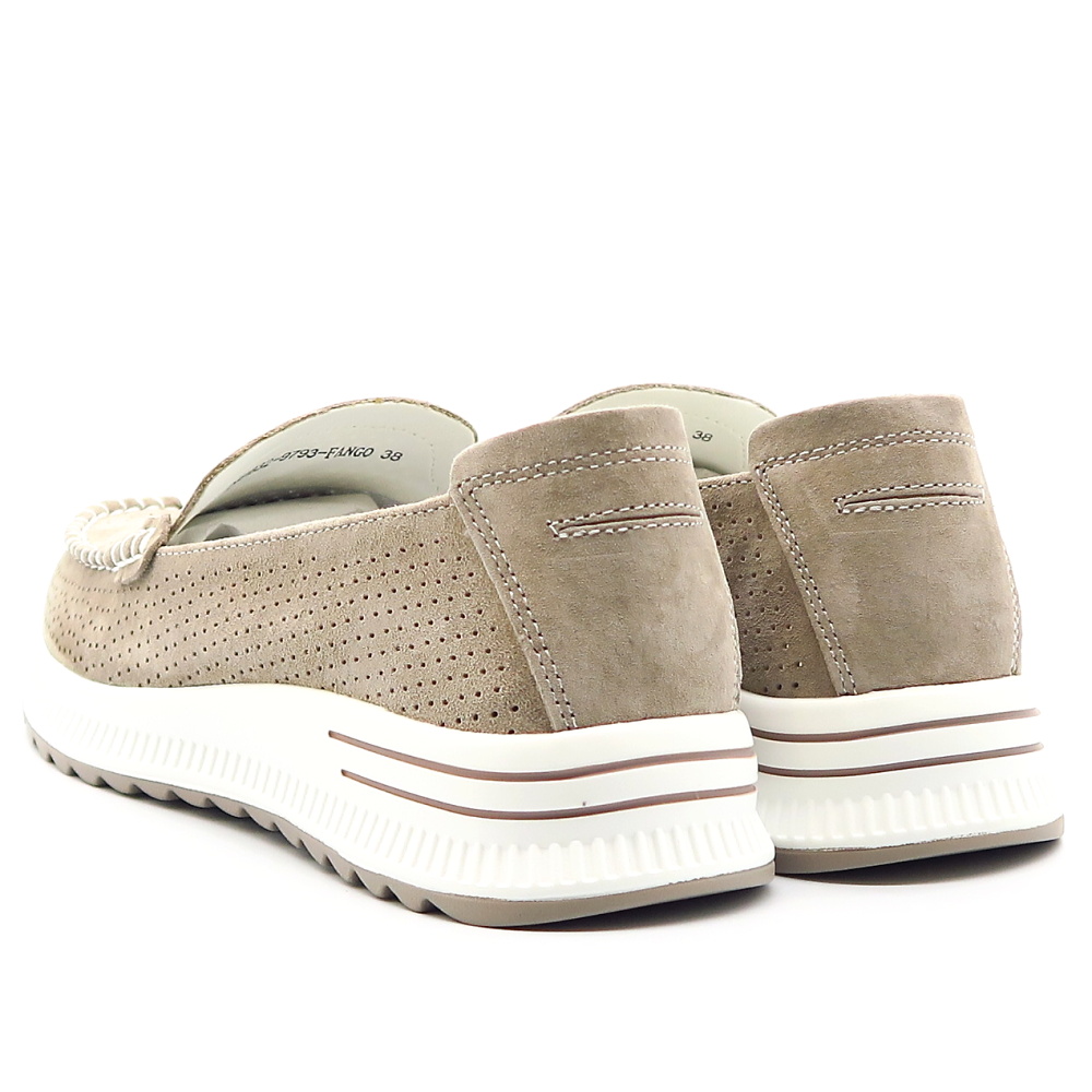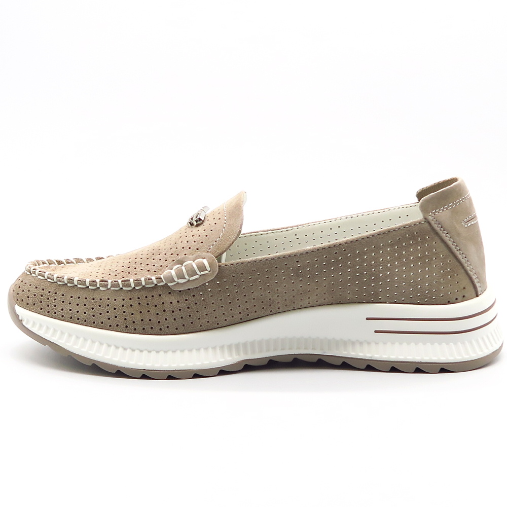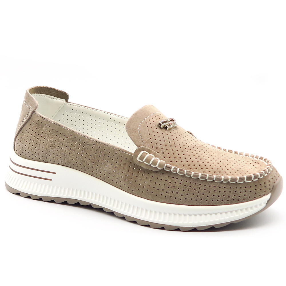 Táto elegantná béžová dámska mokasína je ideálnou voľbou pre tých, ktorí hľadajú pohodlie aj štýl. Topánka je vyrobená z perforovanej kože, čo zabezpečuje dobrú priedušnosť a komfort počas celodenného nosenia. Dekoratívne prešívanie dodáva modelu sofistikovaný vzhľad. Na priehlavku sa nachádza štrasová ozdoba, ktorá pridáva topánke luxusný nádych. Mierne vyvýšená podrážka zabezpečuje stabilitu a pohodlnú chôdzu.