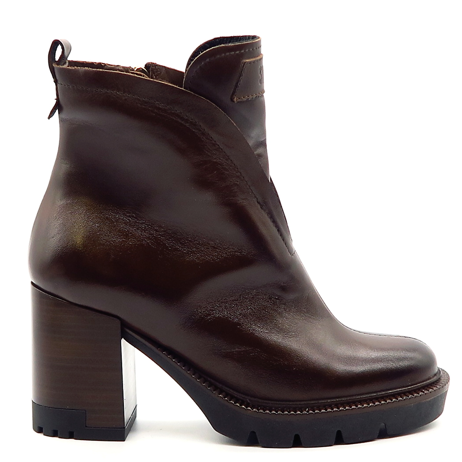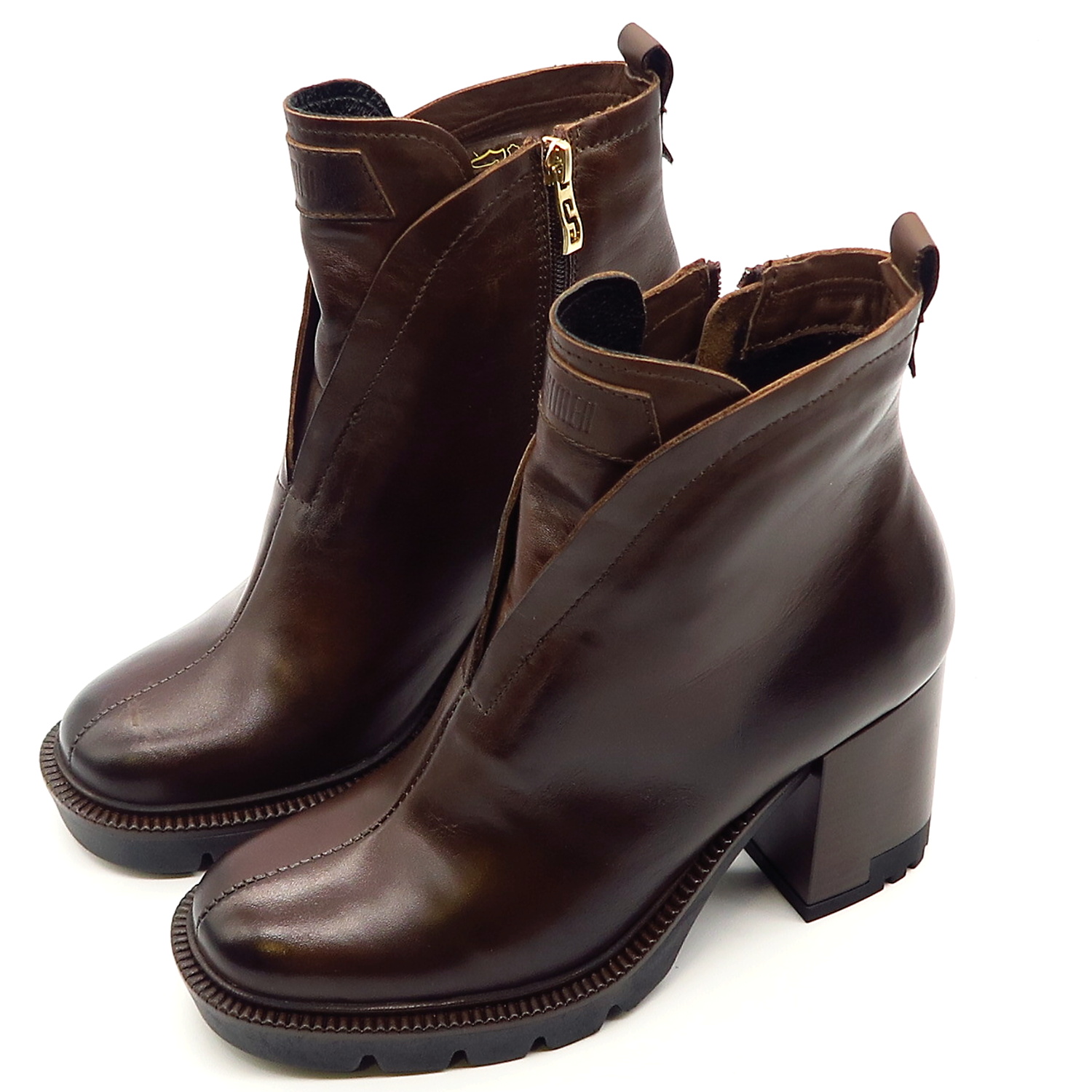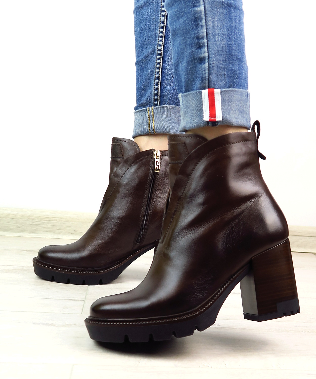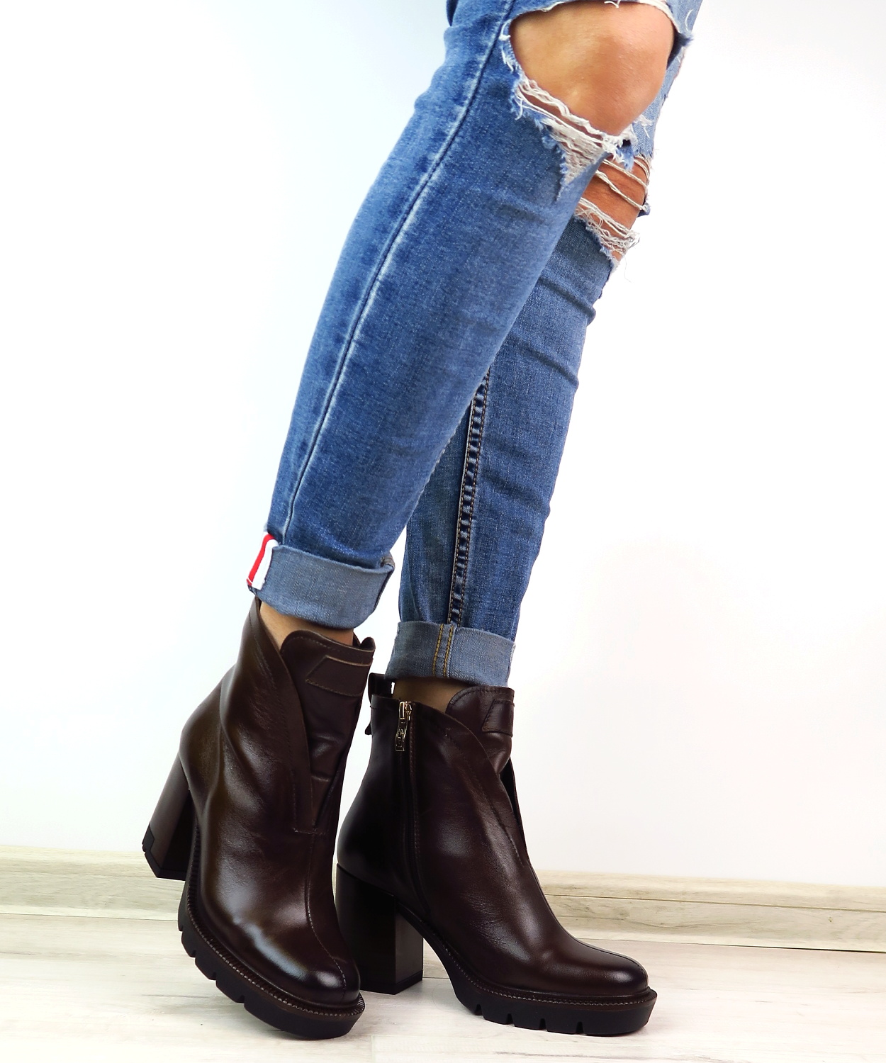 Dámske členkové topánky od značky SIMEN. Model v tmavo hnedej farbe. Zvršok tvorí prírodná koža. Elegantný strih zvýrazňuje priehlavok, kde je vsadený jazyk s elastickými gumičkami pre jednoduché obúvanie a pohodlné nosenie. Univerzálny dizajn zaručuje, že sa hodia k džínsom aj k elegantnejšiemu outfitu. Vhodné na chladnejšie dni a to vďaka teplej vnútornej stielke. Hrubší podpätok a platforma zaistia pohodlné nosenie. Zapínanie – bočný zips.