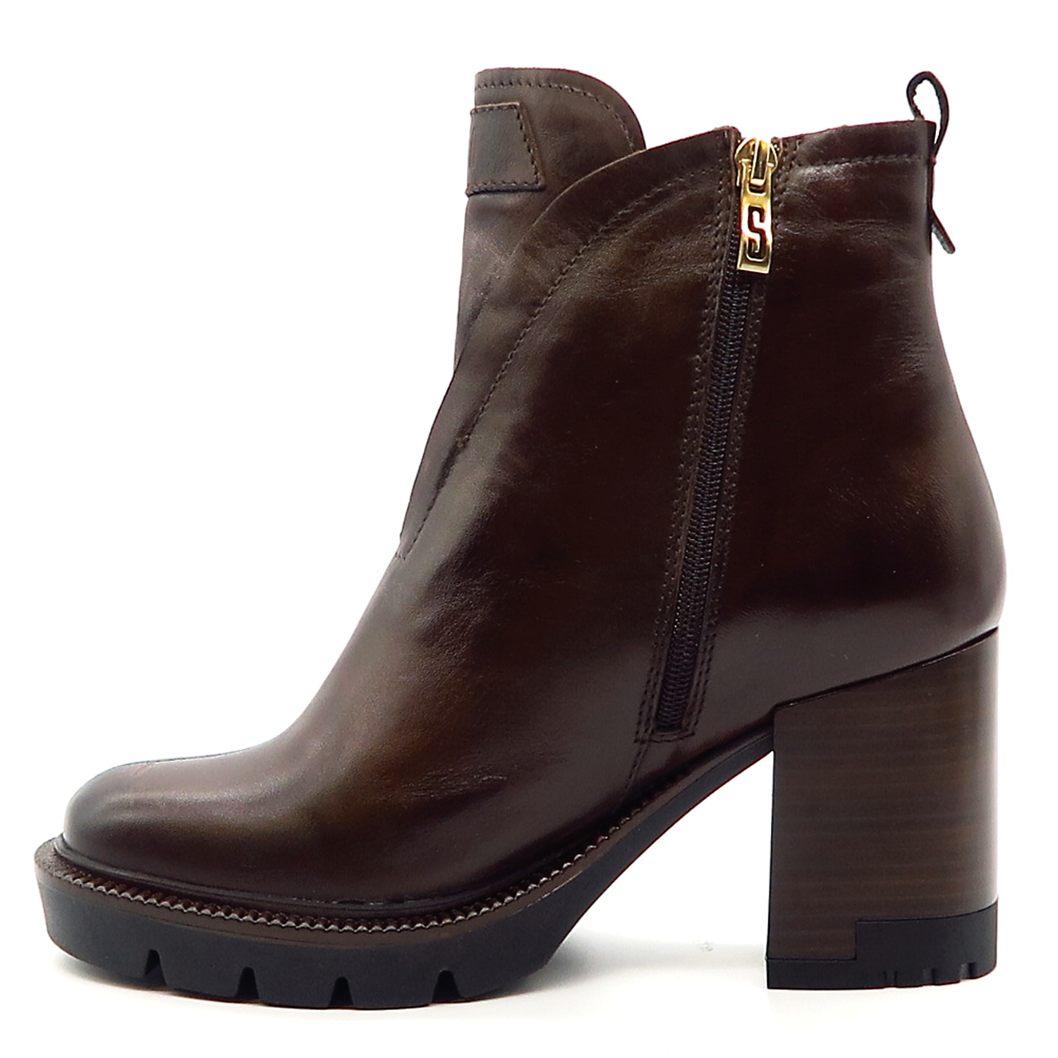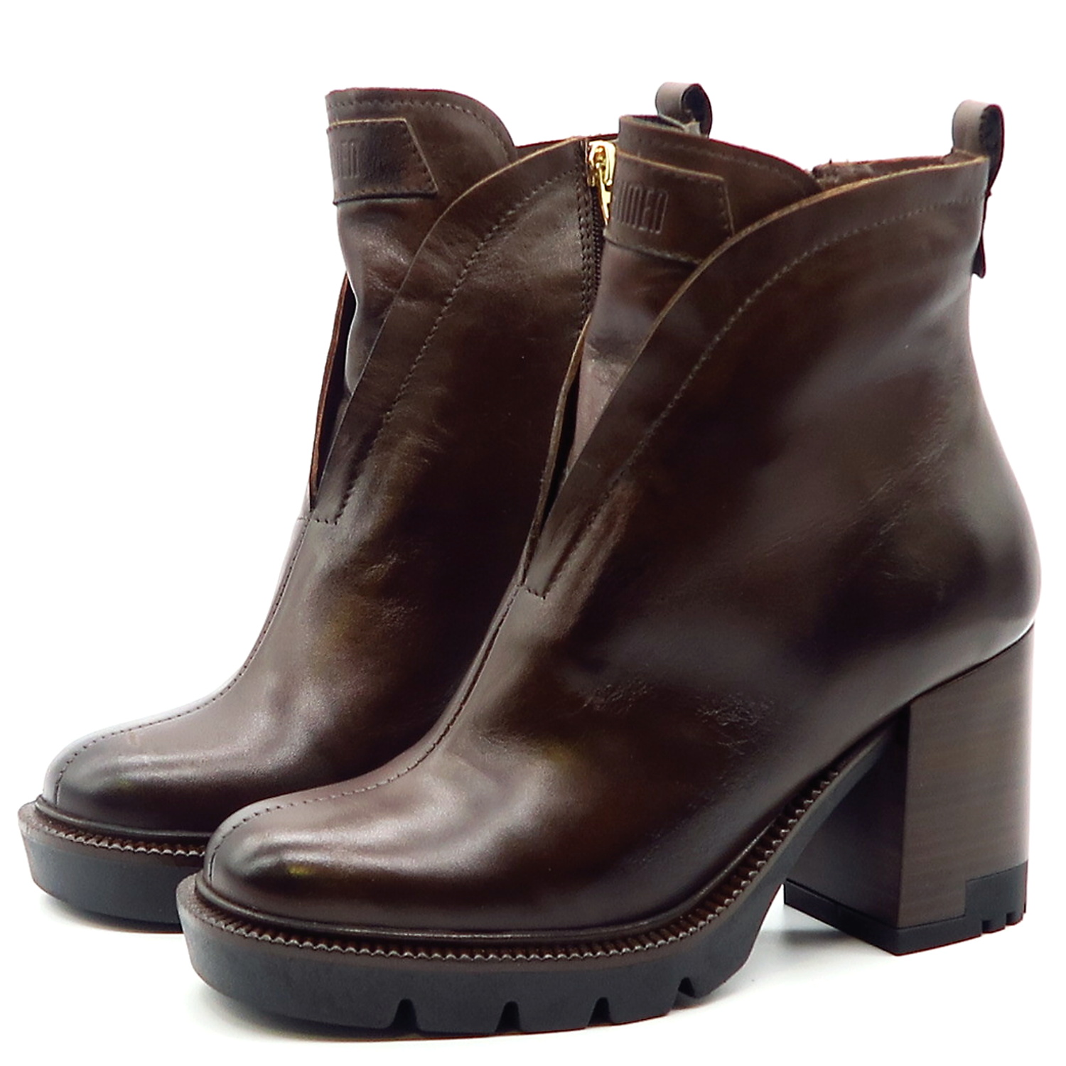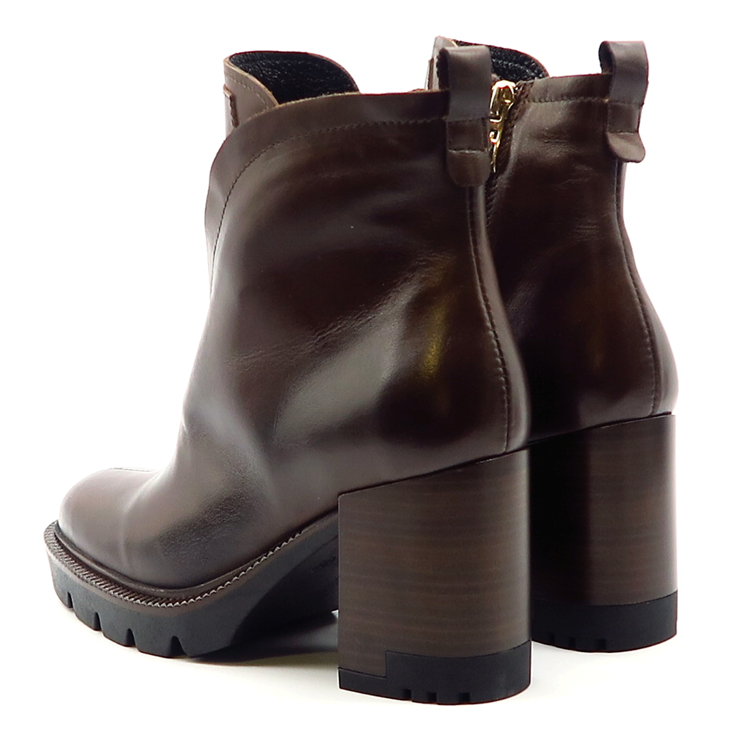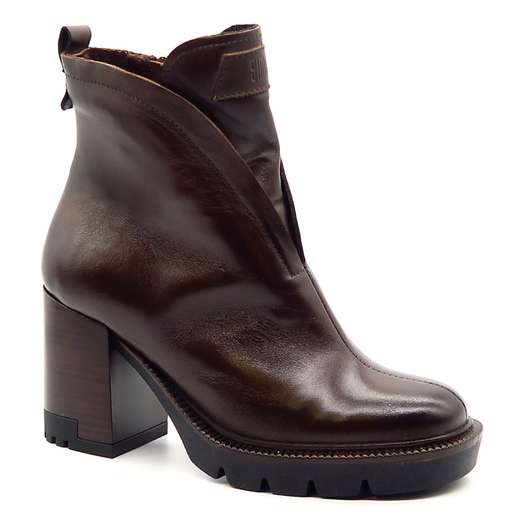 Dámske členkové topánky od značky SIMEN. Model v tmavo hnedej farbe. Zvršok tvorí prírodná koža. Elegantný strih zvýrazňuje priehlavok, kde je vsadený jazyk s elastickými gumičkami pre jednoduché obúvanie a pohodlné nosenie. Univerzálny dizajn zaručuje, že sa hodia k džínsom aj k elegantnejšiemu outfitu. Vhodné na chladnejšie dni a to vďaka teplej vnútornej stielke. Hrubší podpätok a platforma zaistia pohodlné nosenie. Zapínanie – bočný zips.