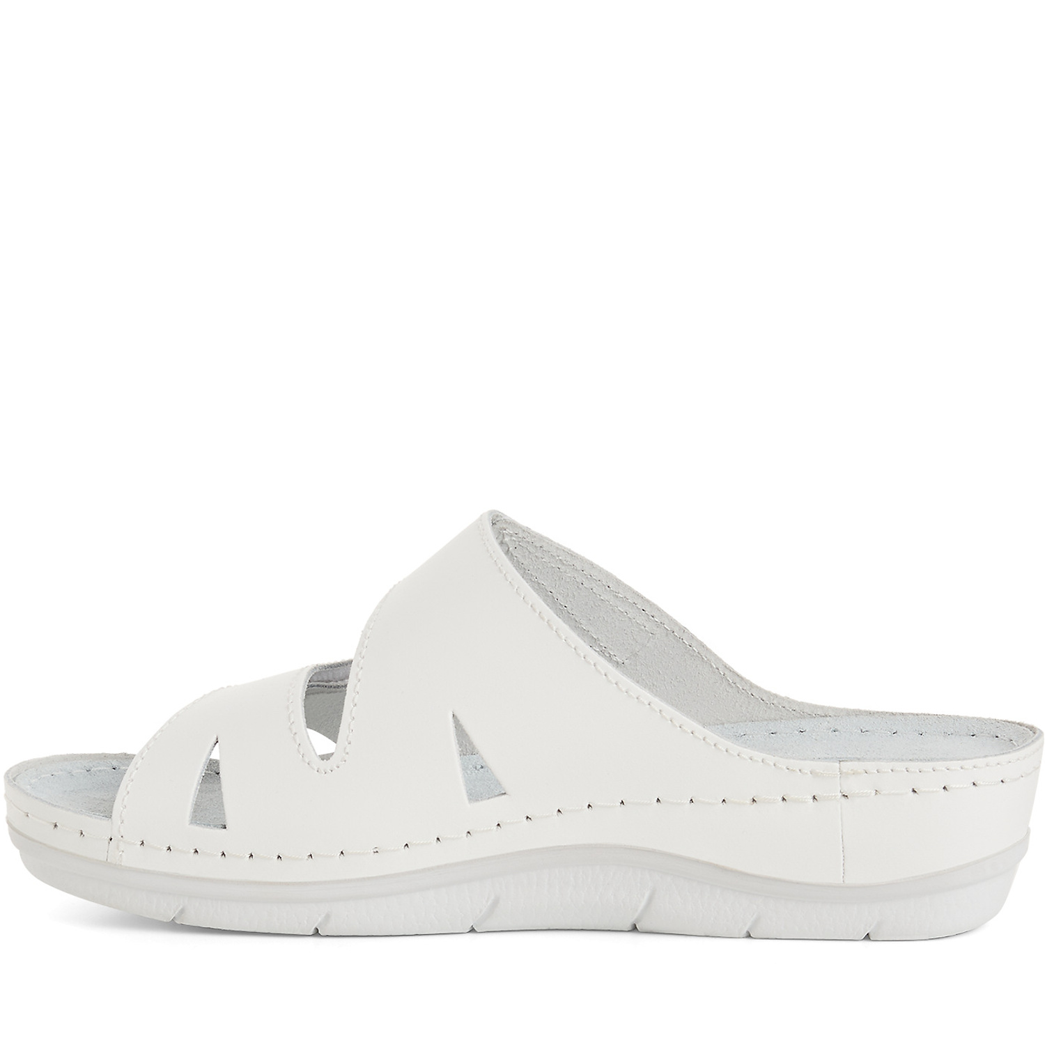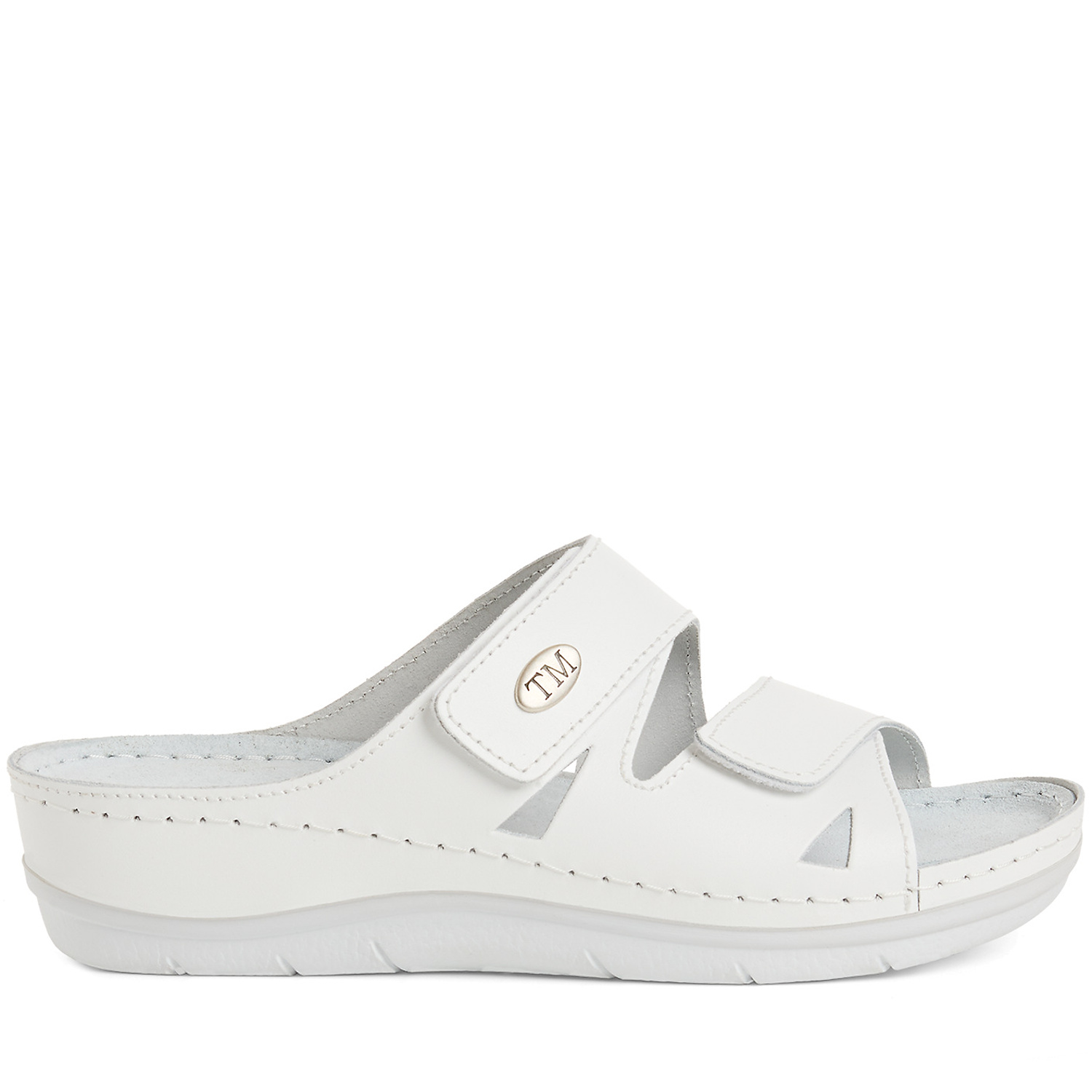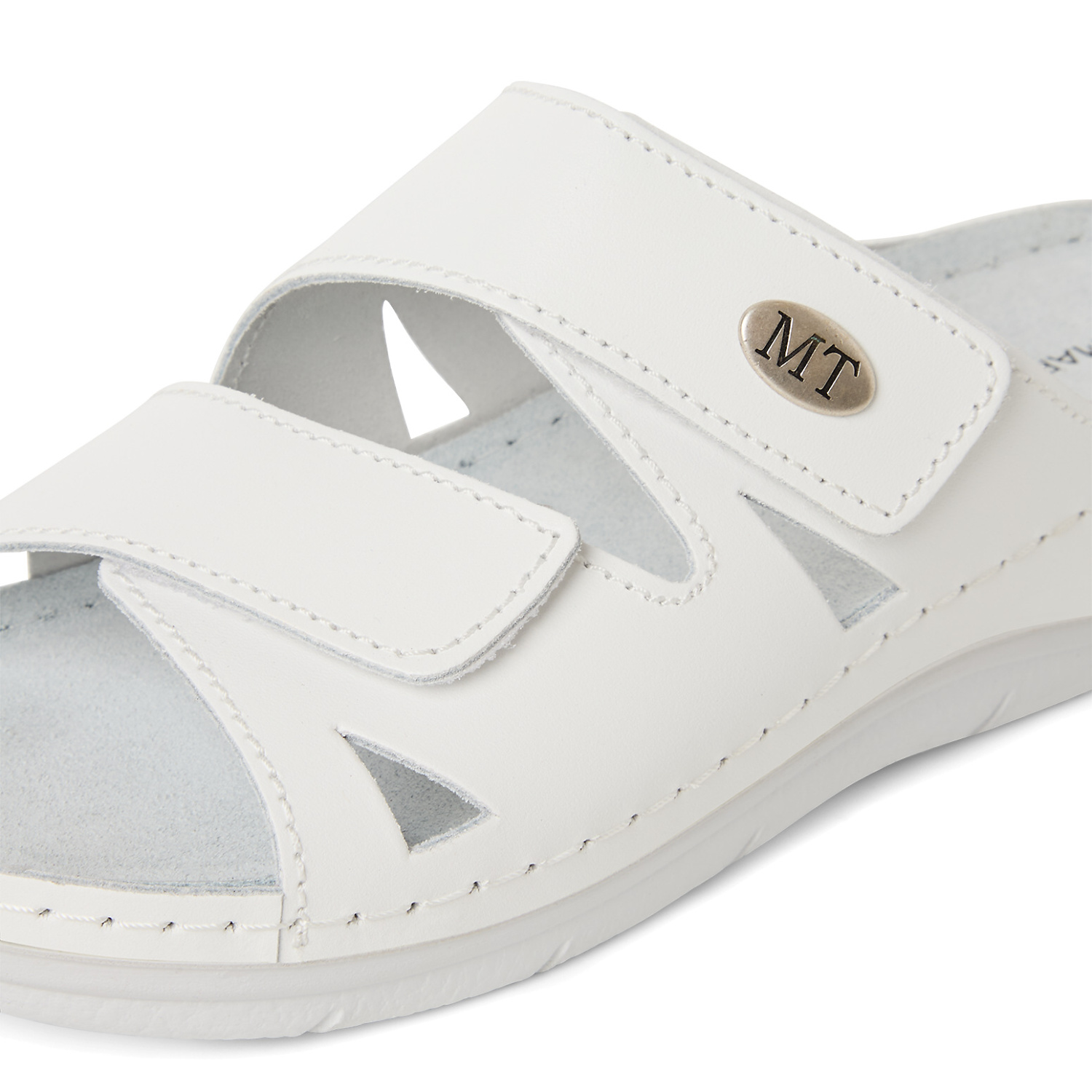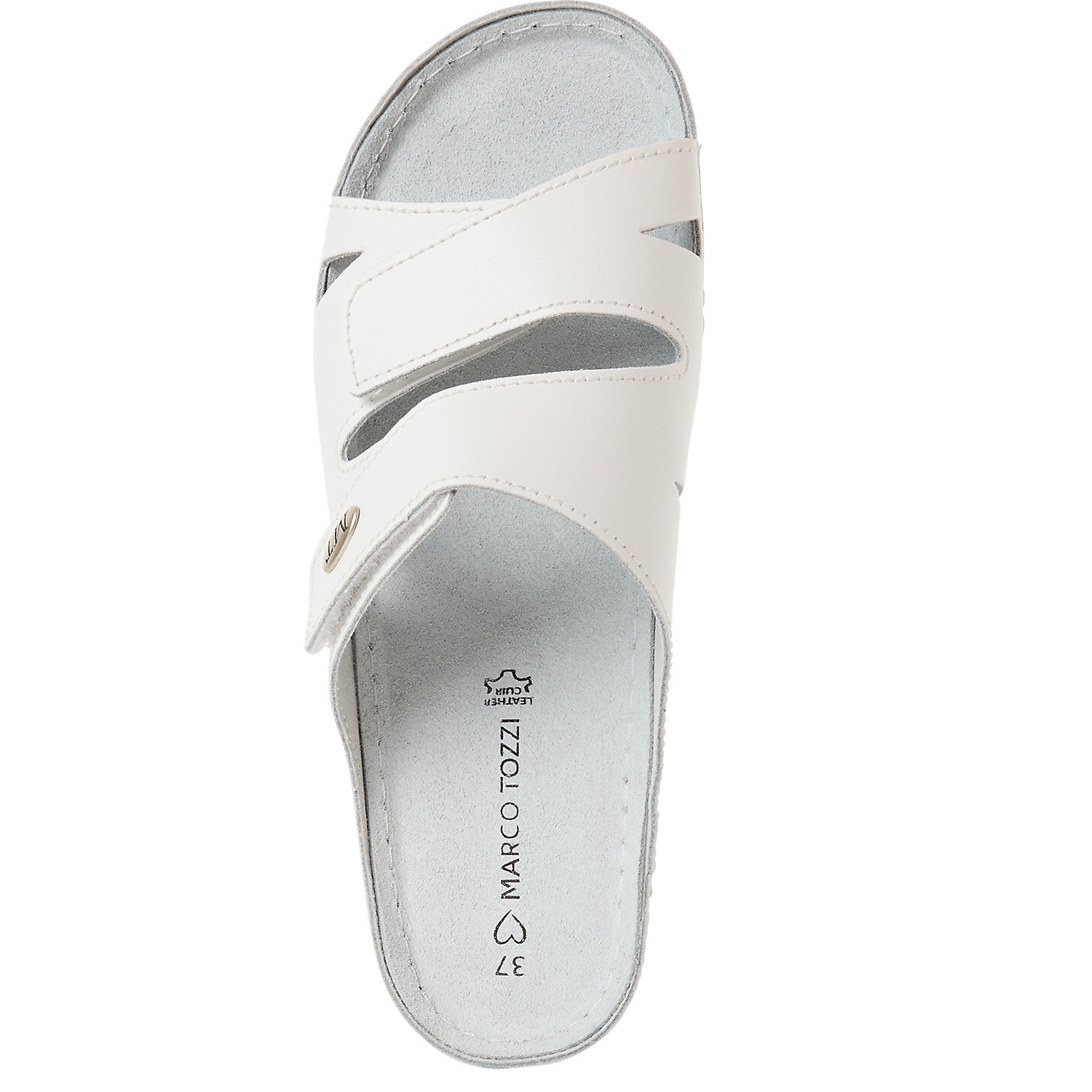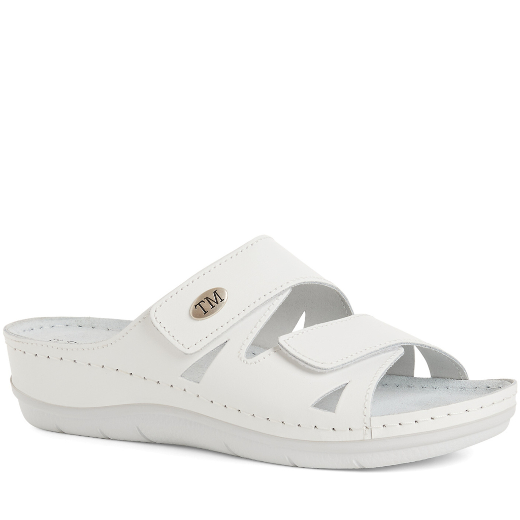 Dámske vsuvky od nemeckej značky MARCO TOZZI. Model vyrobený z prírodnej kože v bielej farbe. Veľkou výhodou sú dva nastaviteľné pásiky na suchý zips, ktoré zabezpečujú pohodlné prispôsobenie nohe. Dizajn je doplnený bielym prešívaním po okrajoch a kovovým oválnym logom značky. Podrážka je mierne vyvýšená a ergonomicky tvarovaná, čím poskytuje lepšiu oporu pre chodidlo. Vsuvky vhodné na každodenné nosenie, aj ako pracovná obuv.