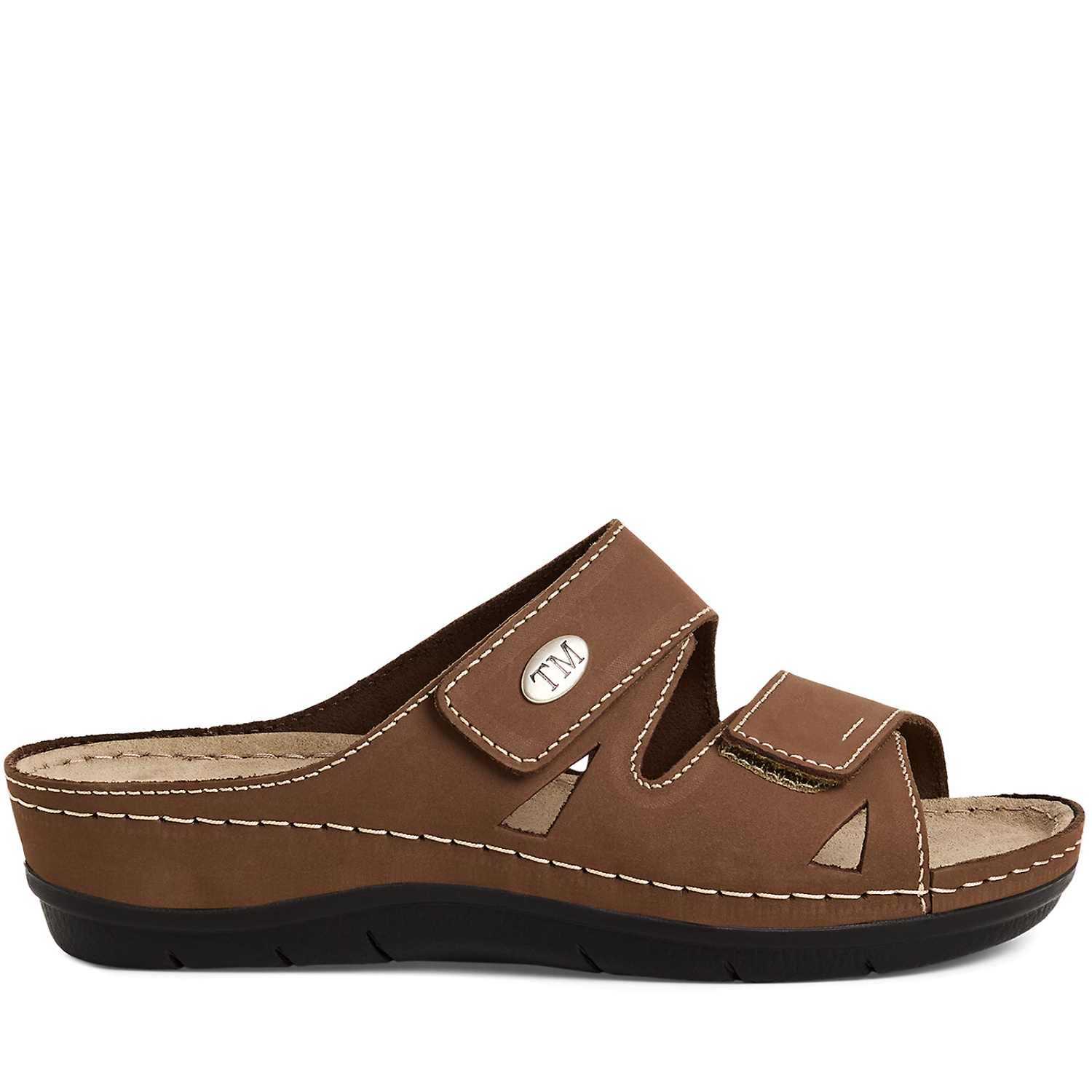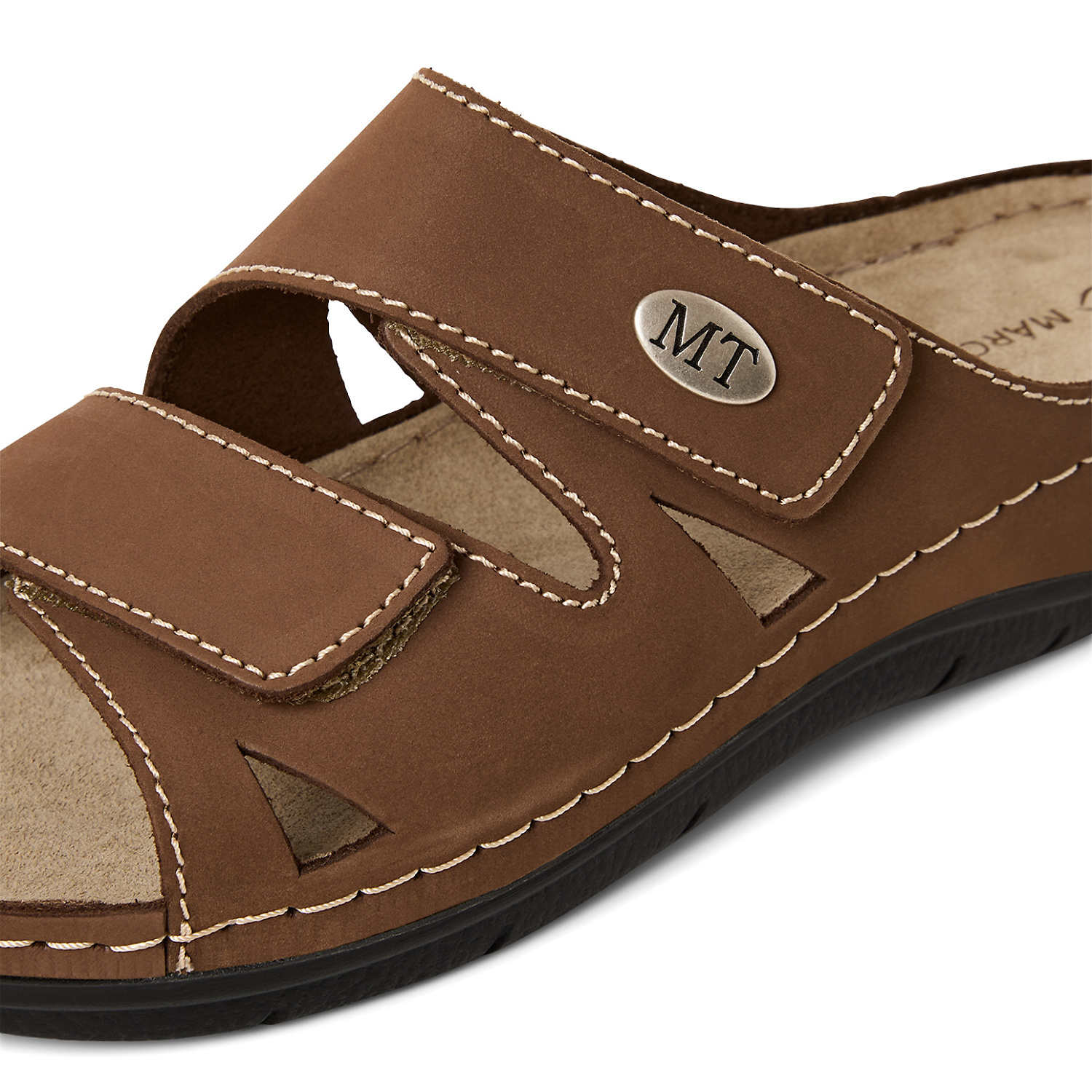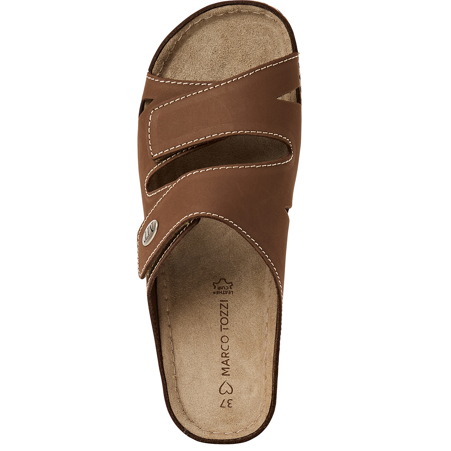 Dámske vsuvky od nemeckej značky MARCO TOZZI. Model vyrobený z prírodnej kože v hnedej farbe. Veľkou výhodou sú dva nastaviteľné pásiky na suchý zips, ktoré zabezpečujú pohodlné prispôsobenie nohe. Dizajn je doplnený bielym prešívaním po okrajoch a kovovým oválnym logom značky. Podrážka je mierne vyvýšená a ergonomicky tvarovaná, čím poskytuje lepšiu oporu pre chodidlo. Vsuvky vhodné na každodenné nosenie, aj ako pracovná obuv.