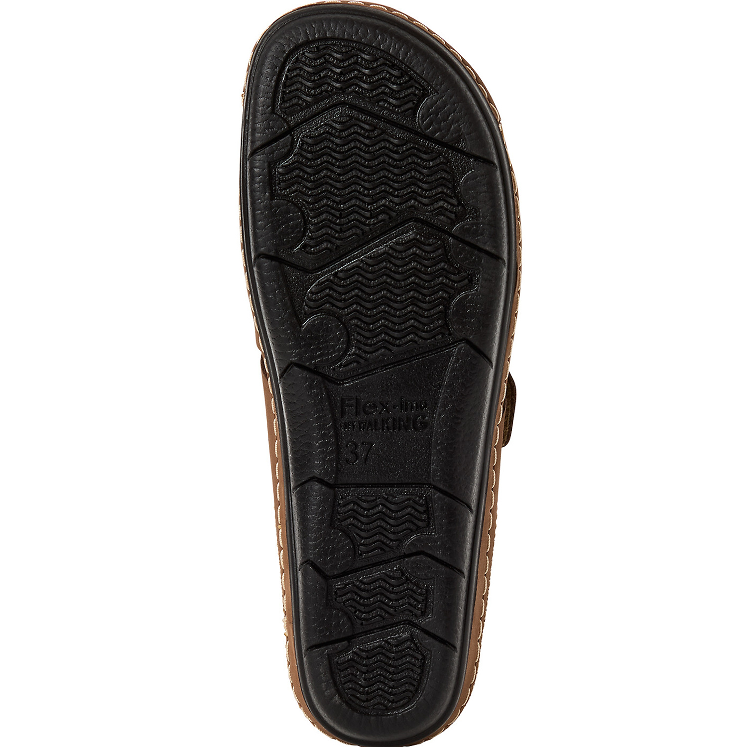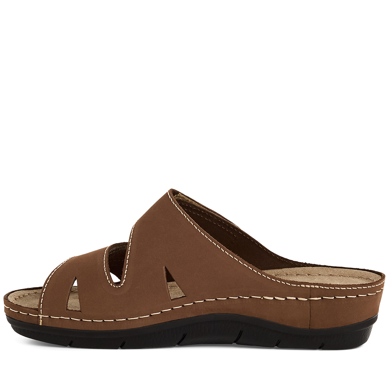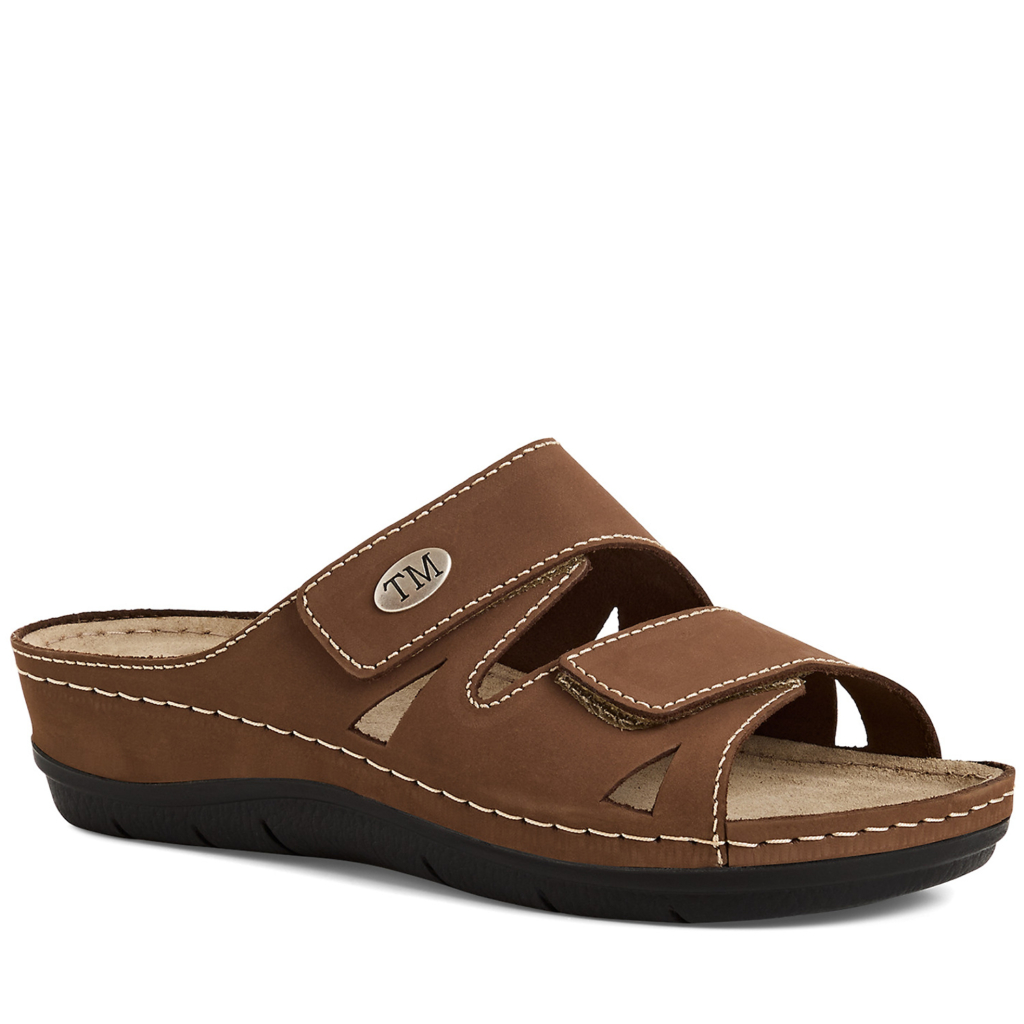 Dámske vsuvky od nemeckej značky MARCO TOZZI. Model vyrobený z prírodnej kože v hnedej farbe. Veľkou výhodou sú dva nastaviteľné pásiky na suchý zips, ktoré zabezpečujú pohodlné prispôsobenie nohe. Dizajn je doplnený bielym prešívaním po okrajoch a kovovým oválnym logom značky. Podrážka je mierne vyvýšená a ergonomicky tvarovaná, čím poskytuje lepšiu oporu pre chodidlo. Vsuvky vhodné na každodenné nosenie, aj ako pracovná obuv.