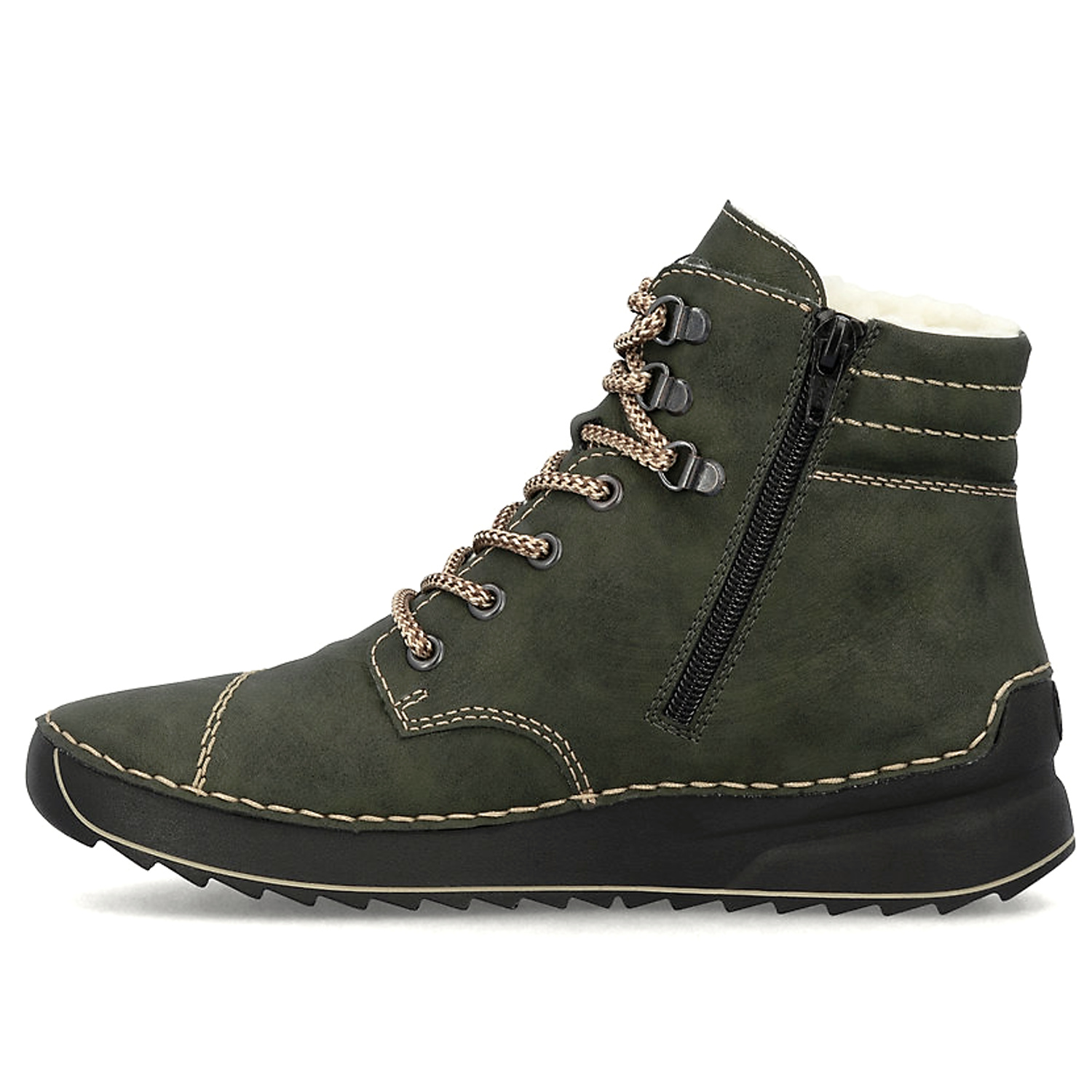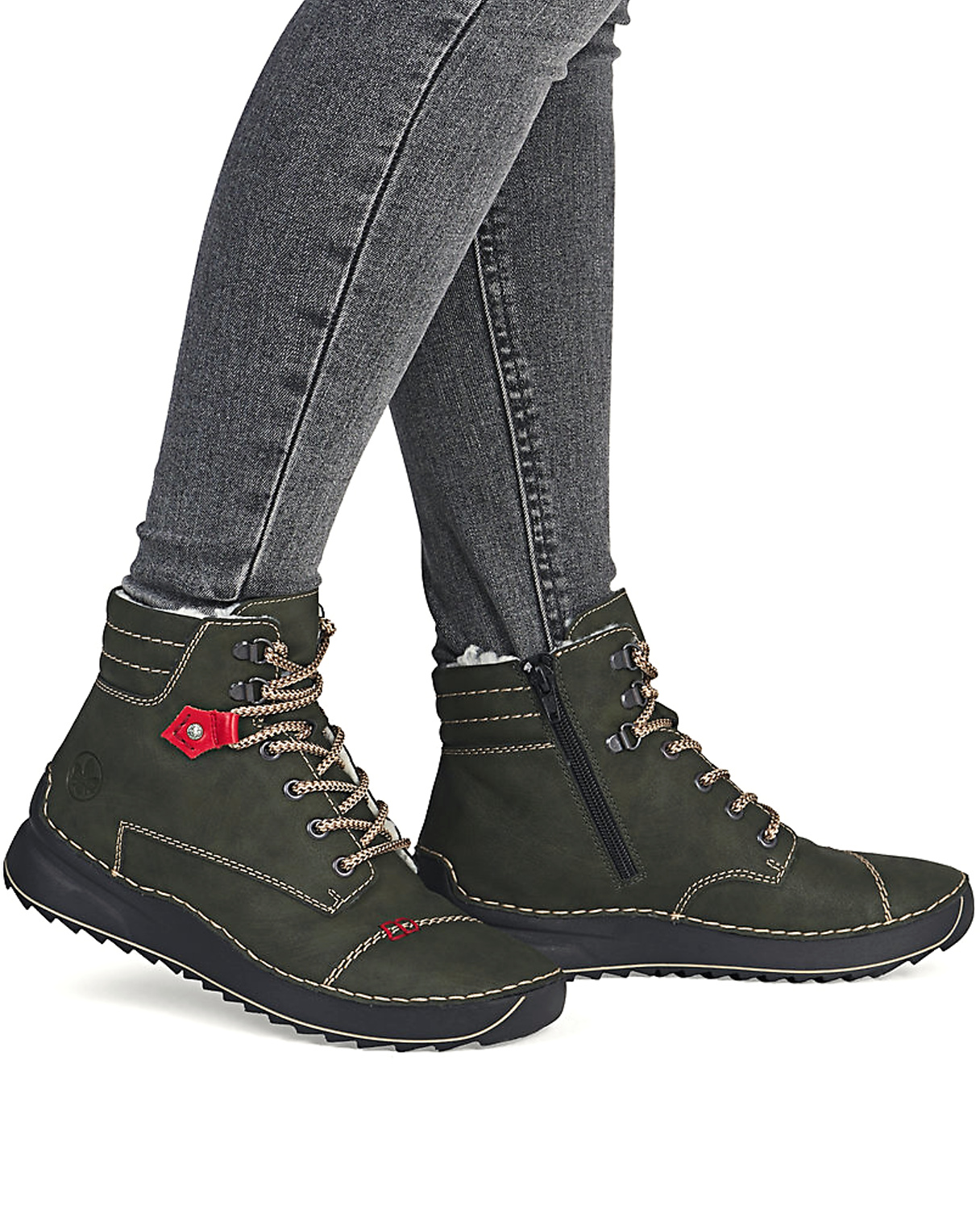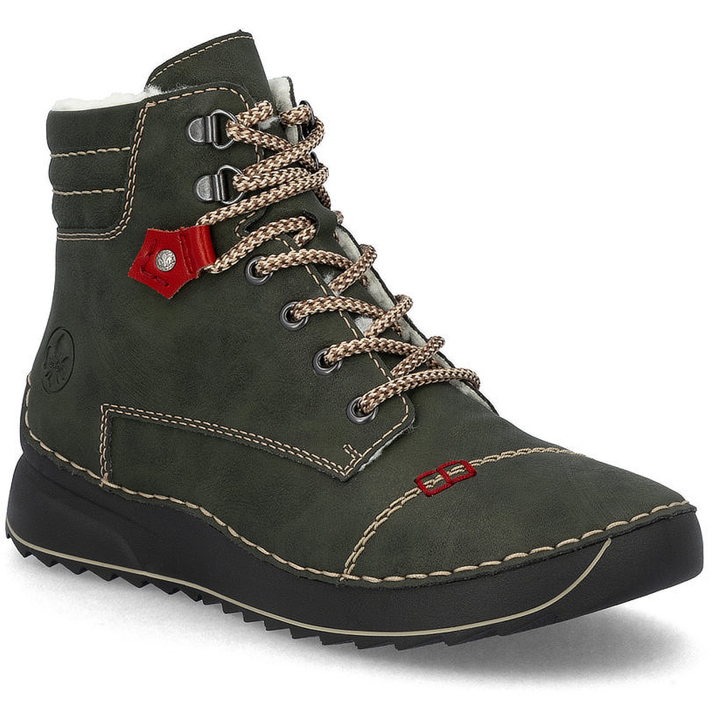 Dámske členkové topánky značky RIEKR , ktoré spájajú komfort a funkčnosť v elegantnom štýle. Vďaka technológii AntiStress sú maximálne ohybné, čo uľahčuje krok a znižuje únavu chodidla. Model v zelenej farbe. Zvršok vyrobený z ekologickej kože. Vnútro je zateplené mäkkou kožušinou – ideálne na zimné obdobie. Podrážka je ľahká a tlmiaca, čím poskytuje stabililtu a komfort pri každom kroku. Zapínanie – šnurovanie a bočný zips.