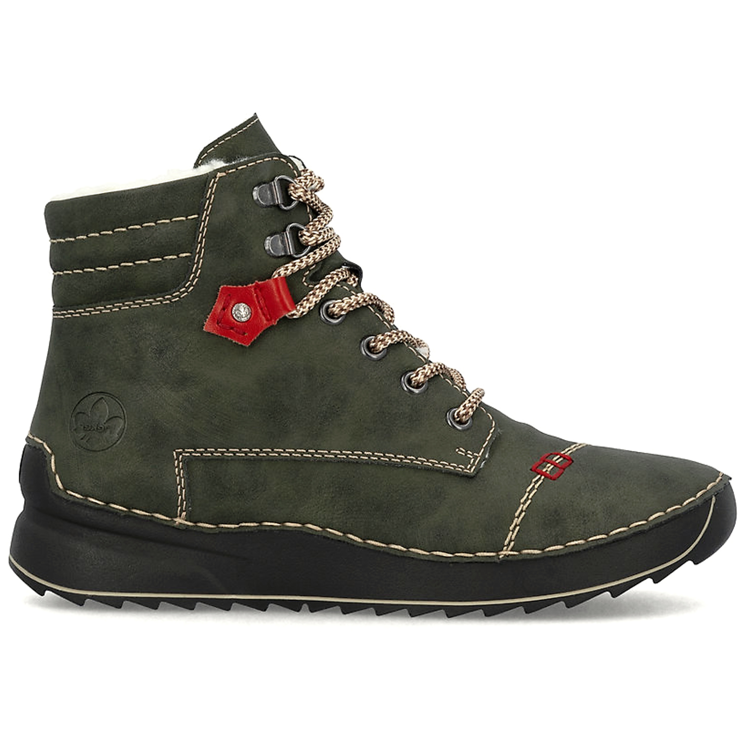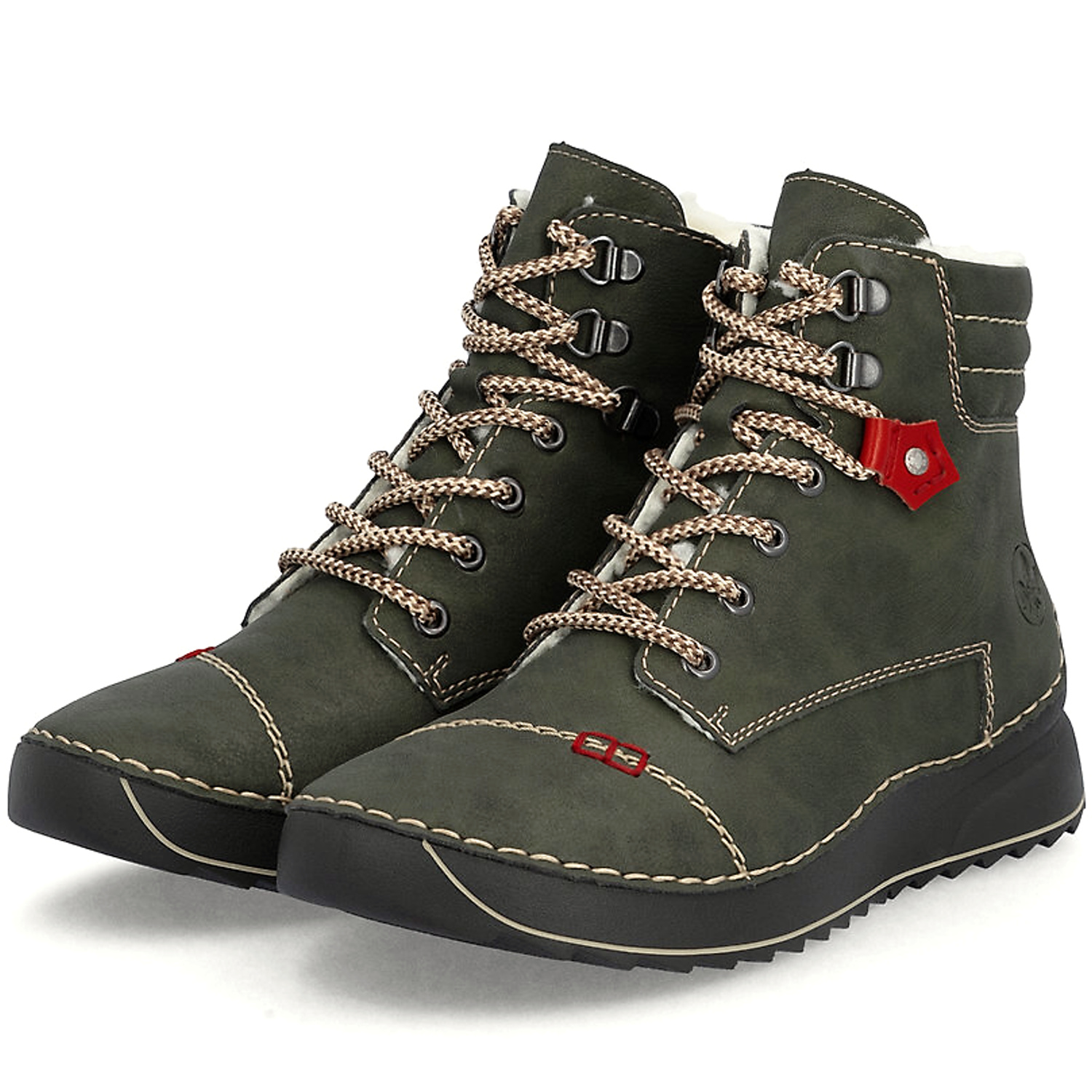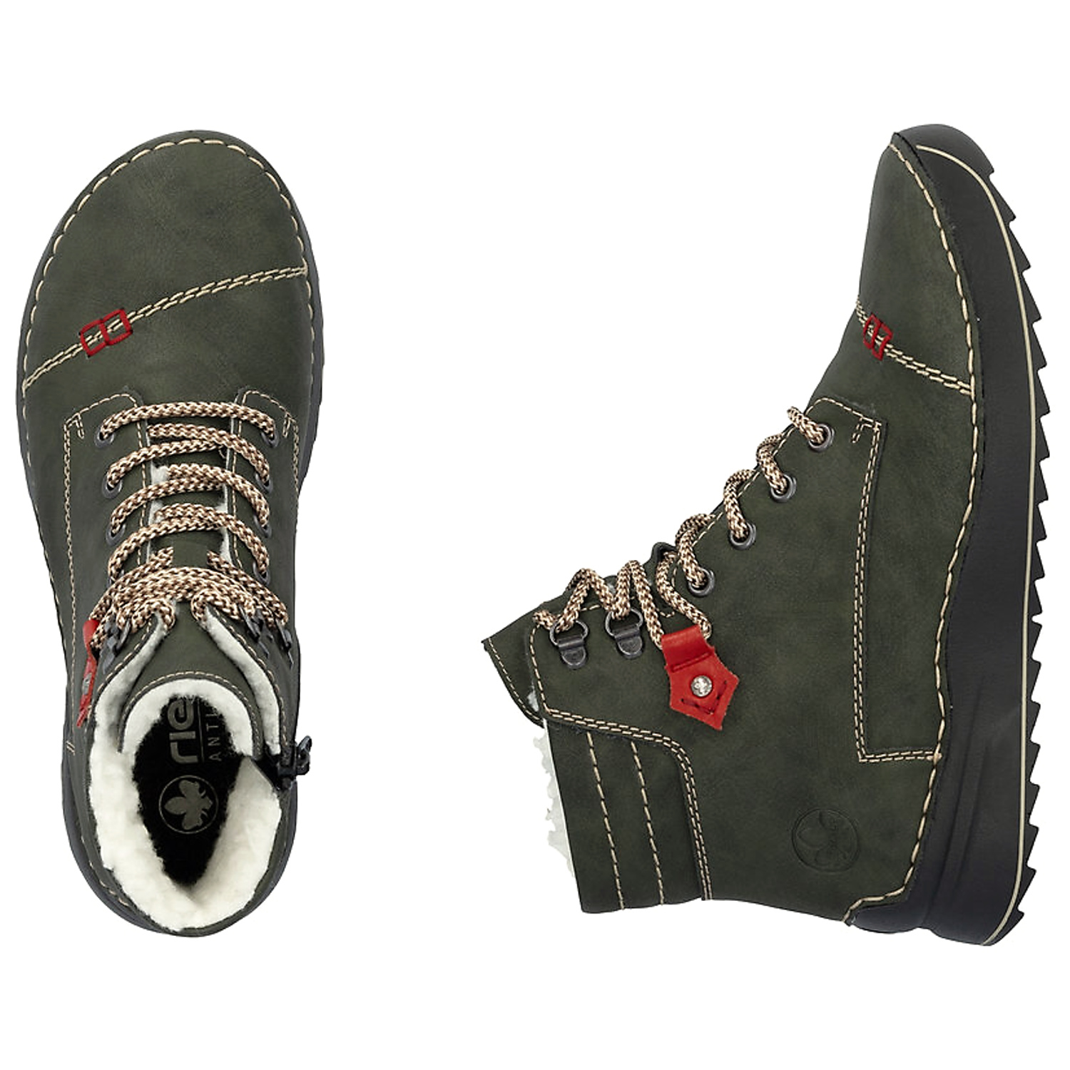 Dámske členkové topánky značky RIEKR , ktoré spájajú komfort a funkčnosť v elegantnom štýle. Vďaka technológii AntiStress sú maximálne ohybné, čo uľahčuje krok a znižuje únavu chodidla. Model v zelenej farbe. Zvršok vyrobený z ekologickej kože. Vnútro je zateplené mäkkou kožušinou – ideálne na zimné obdobie. Podrážka je ľahká a tlmiaca, čím poskytuje stabililtu a komfort pri každom kroku. Zapínanie – šnurovanie a bočný zips.